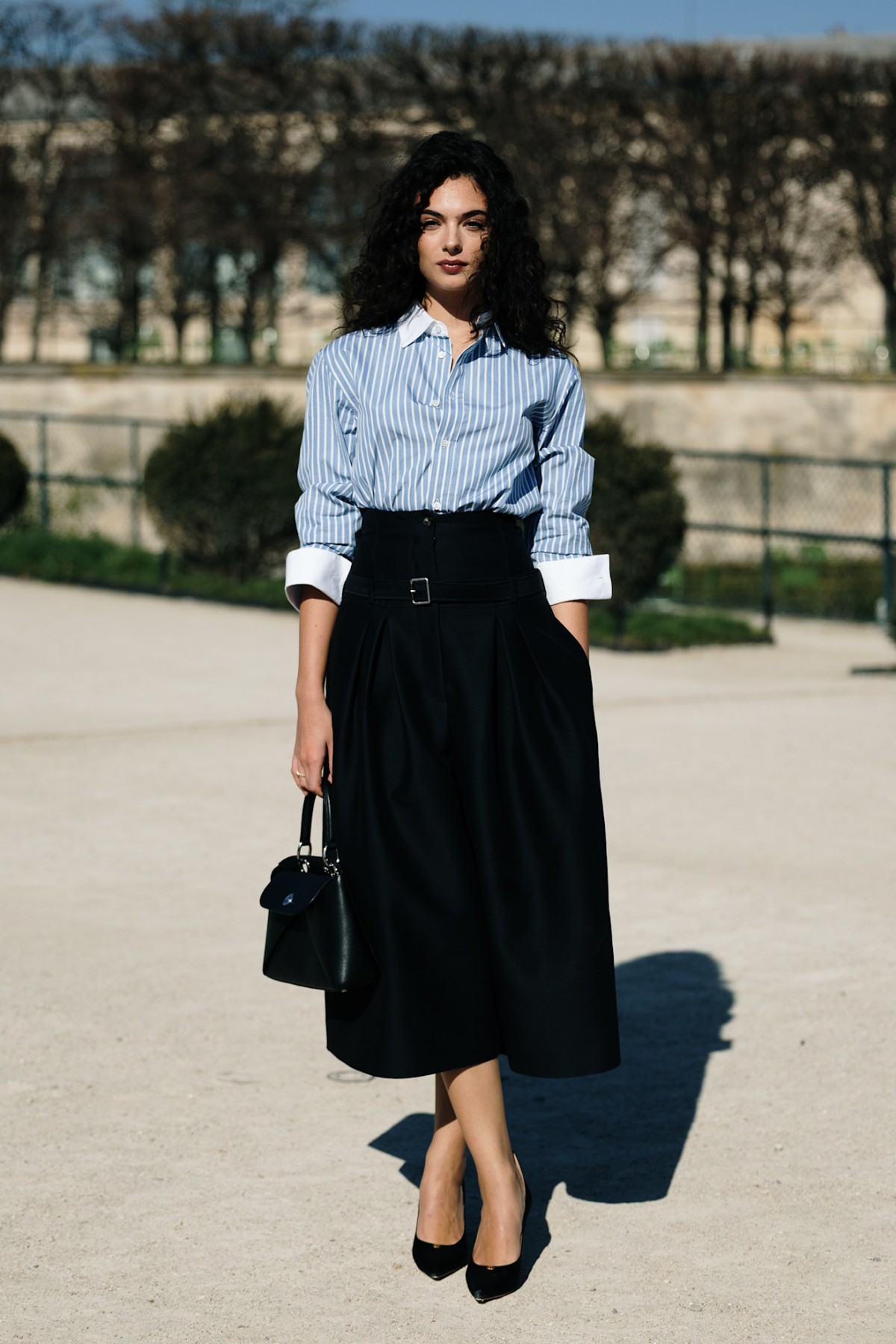Широкі й укорочені штани знову в моді, але найскладніше питання стилізації — як не виглядати як tomboy. Паризькі дівчата пропонують кілька рішень. Донька Моніки Беллуччі — Дева Кассель тяжіє до більш ділового прочитання кюлотів, тож вона поєднала їх зі смугастою сорочкою з білими манжетами та комірцем, класичними туфлями й сумкою-ридикюлем.