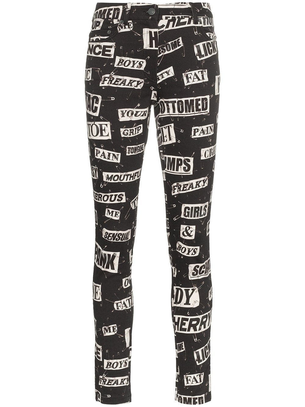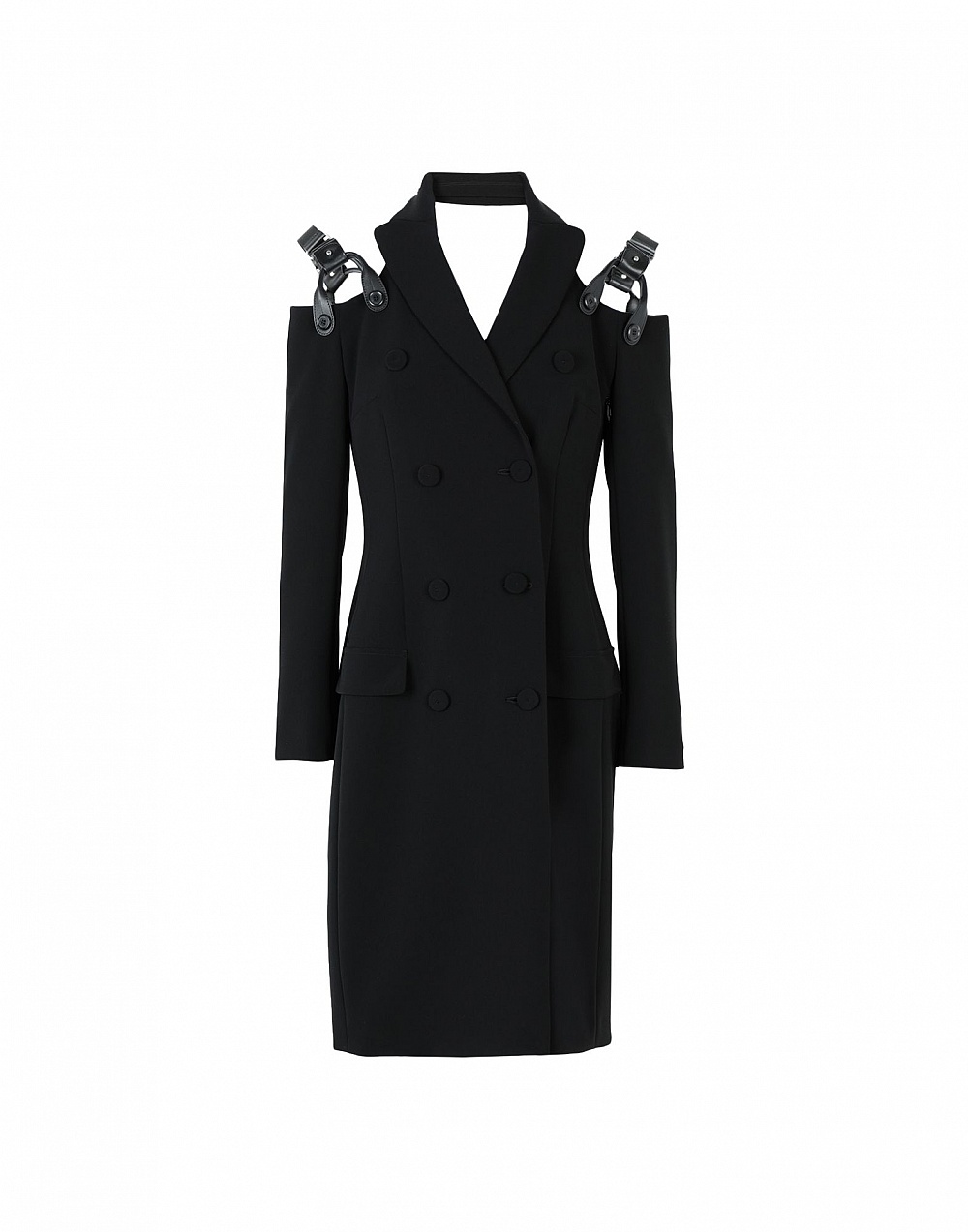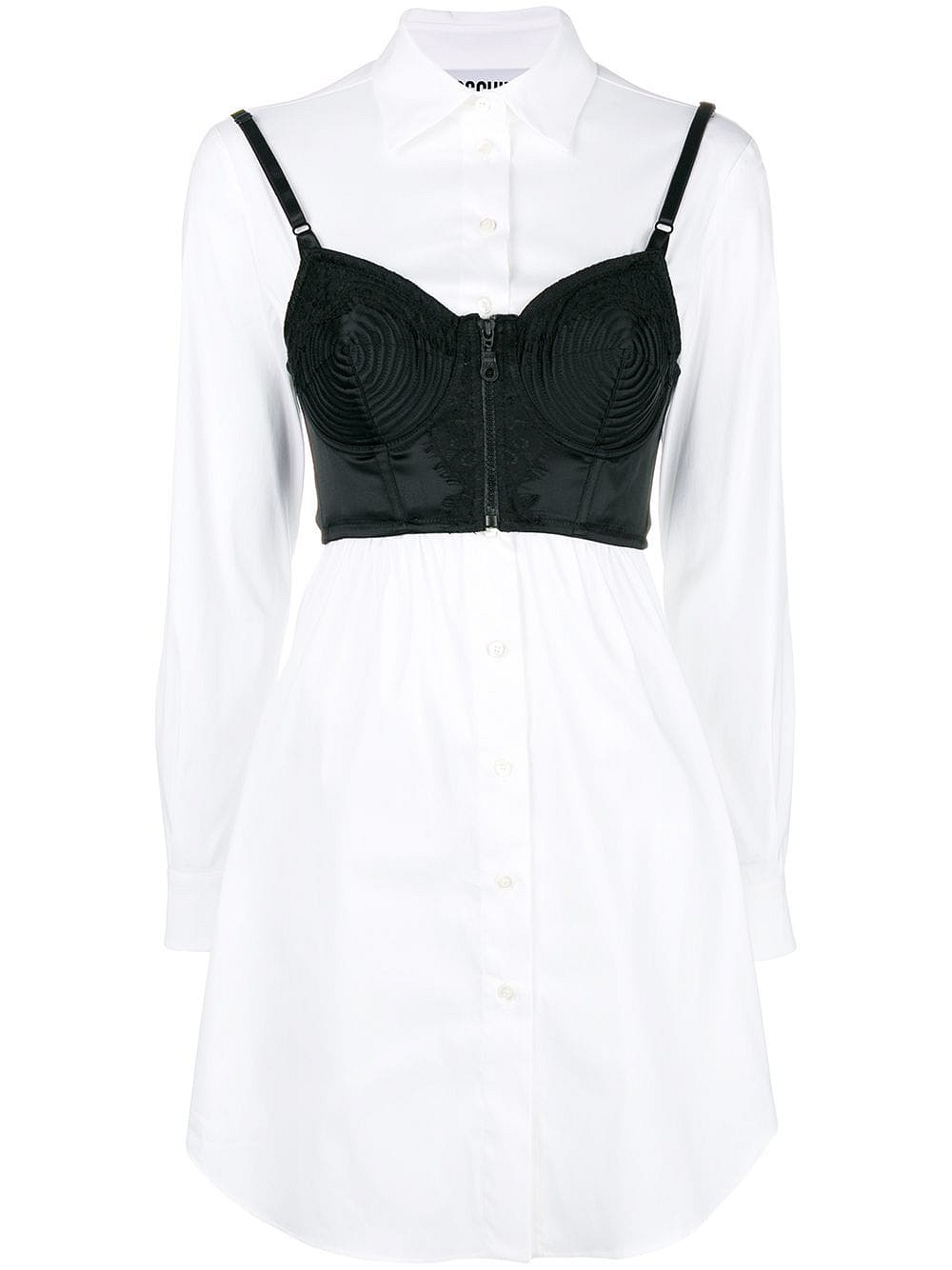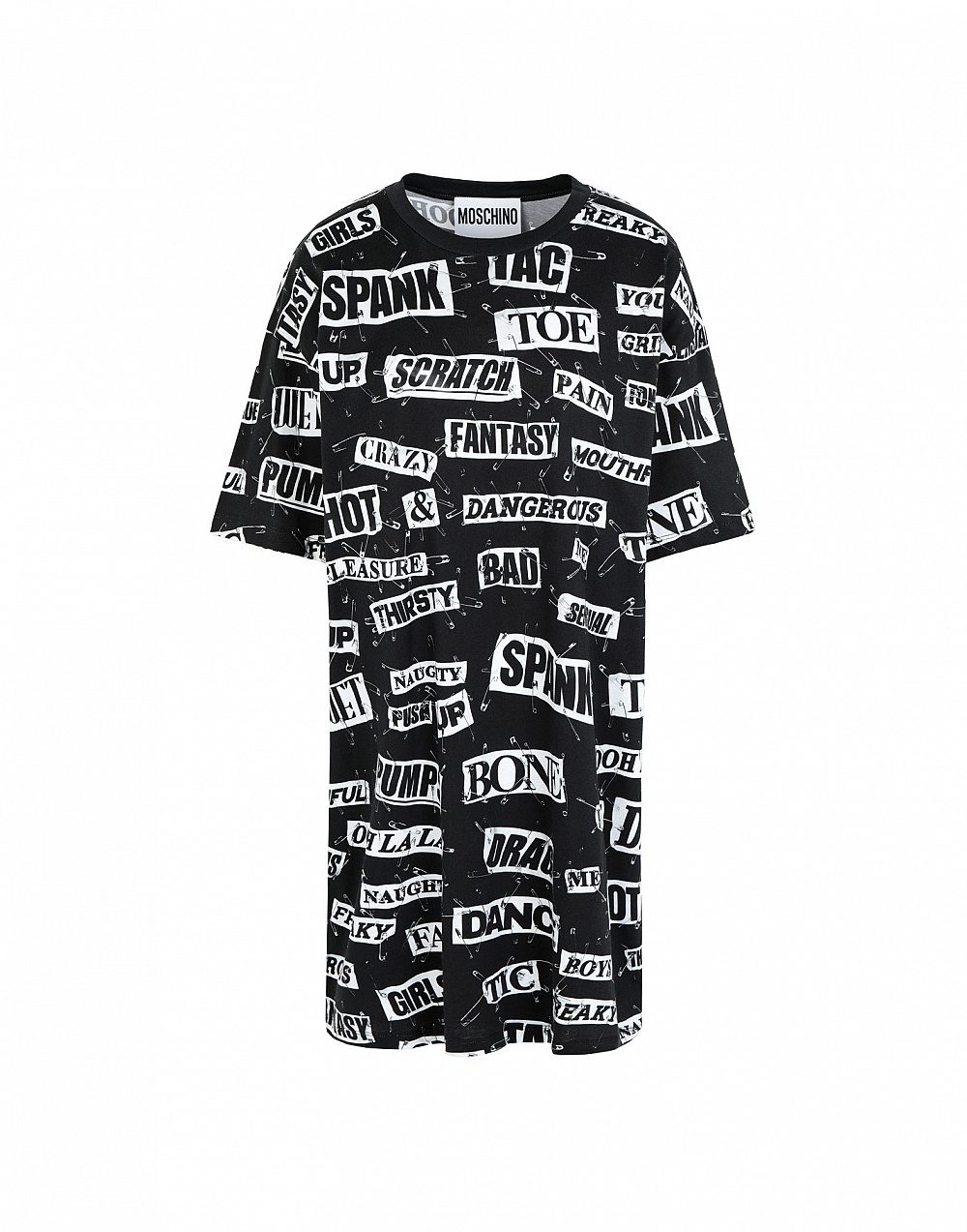 Спокойные оттенки не назовешь типичными для Moschino, однако даже они в руках Джереми Скотта приобретают новый смысл. Черное платье-пальто прямого кроя с деформацией и кожаными элементами на плечах, ультракороткий топ поверх удлиненной белой рубашки, черный костюм-двойка и простое платье, но с кричащими логотипами по всей длине – такова классика в современном её проявлении.