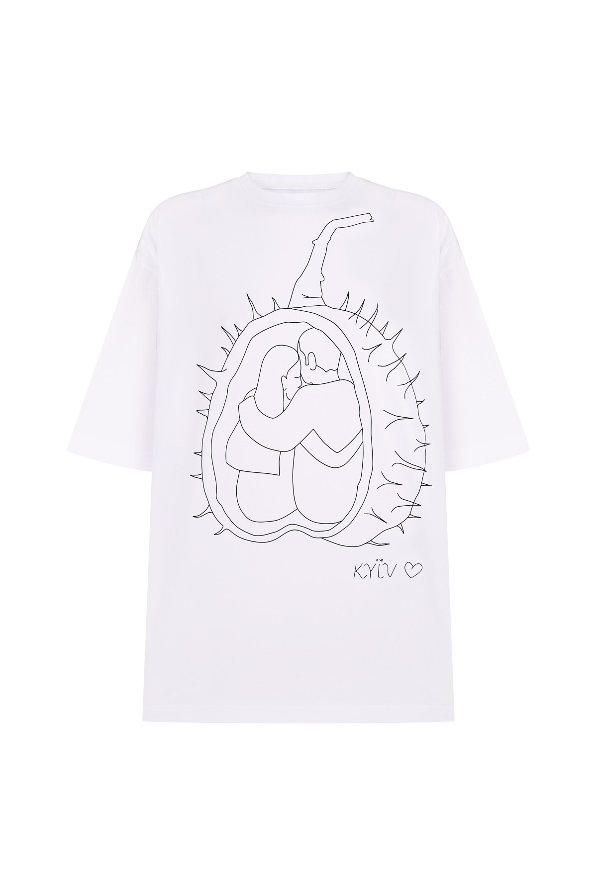На футболках — стилізований каштан з людьми в обіймах. Це Київ, у якому тепло, — і це не метафора. Це жест підтримки, яким хочеться ділитися.