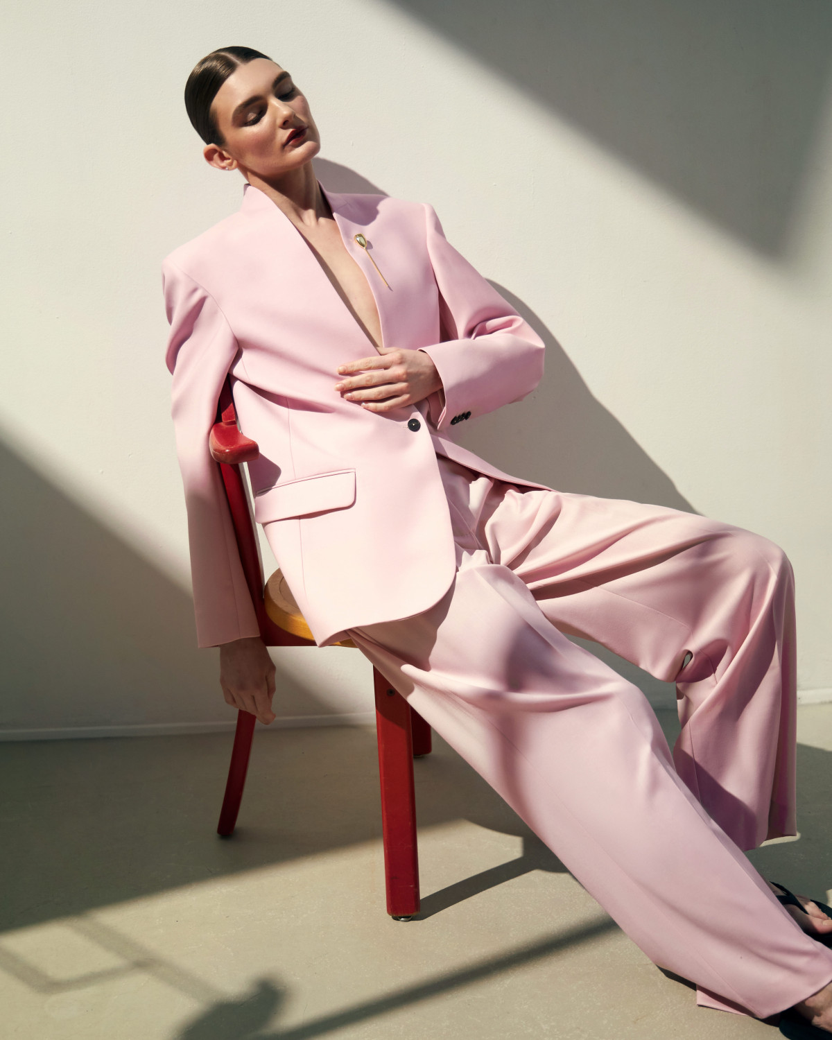 На зміну їдкому рожевому, від якого всі божеволіли минулого літа, прийшов стриманий і більш елегантний його варіант. Костюм ідеального крою в спокійному рожевому відтінку днями представили в INLYLAND, доповнивши брюки-палацо жакетом без лацканів і з глибоким вирізом. Лаконічна брошка (з тієї ж лінійки) гармонійно вписується в ансамбль, виступаючи в образі швидше трикрапкою, аніж крапкою…