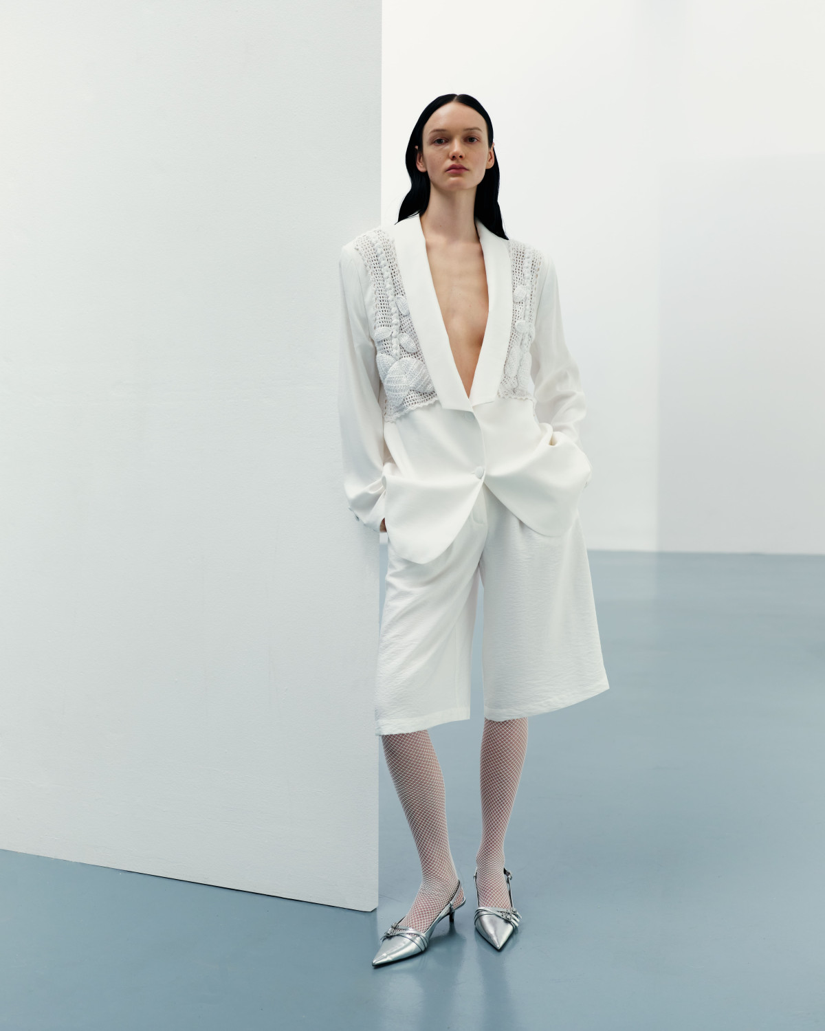 Цього травня не обійтися не тільки без білої сукні, а й без білого костюму, який став повноцінним конкурентом чорній класиці. Тільки замість брюк радимо звернути увагу на бермуди, як у новій колекції MALVA FLOREA, і до погоди більше пасує, і відкриває більше варіантів для стилізацій (колготки, гольфи, шкарпетки, високе взуття тощо). Особливий захват — мереживні вставки на жакеті, які додають йому делікатності й помітно вирізняють його з-поміж сотень інших білих жакетів.
