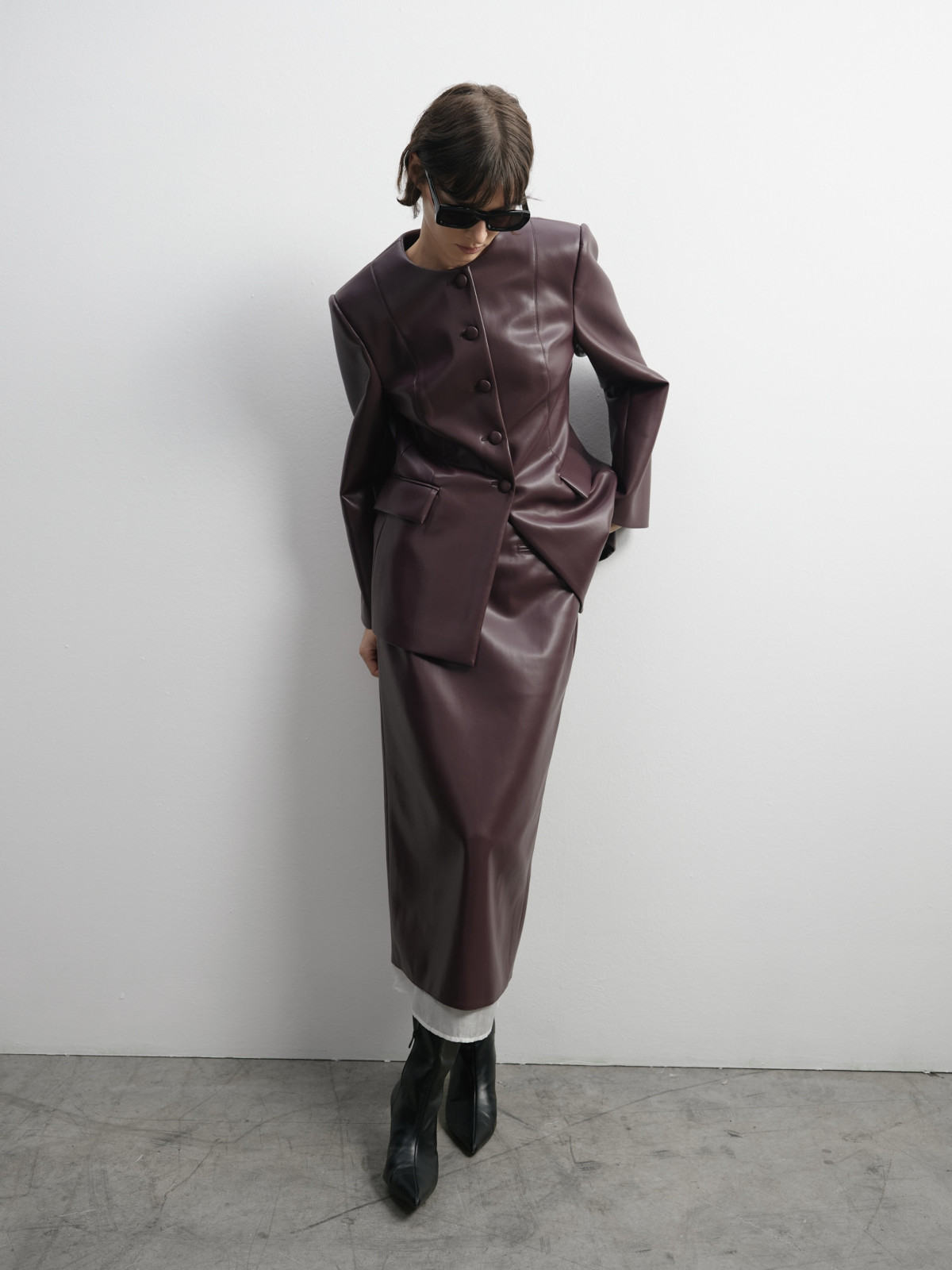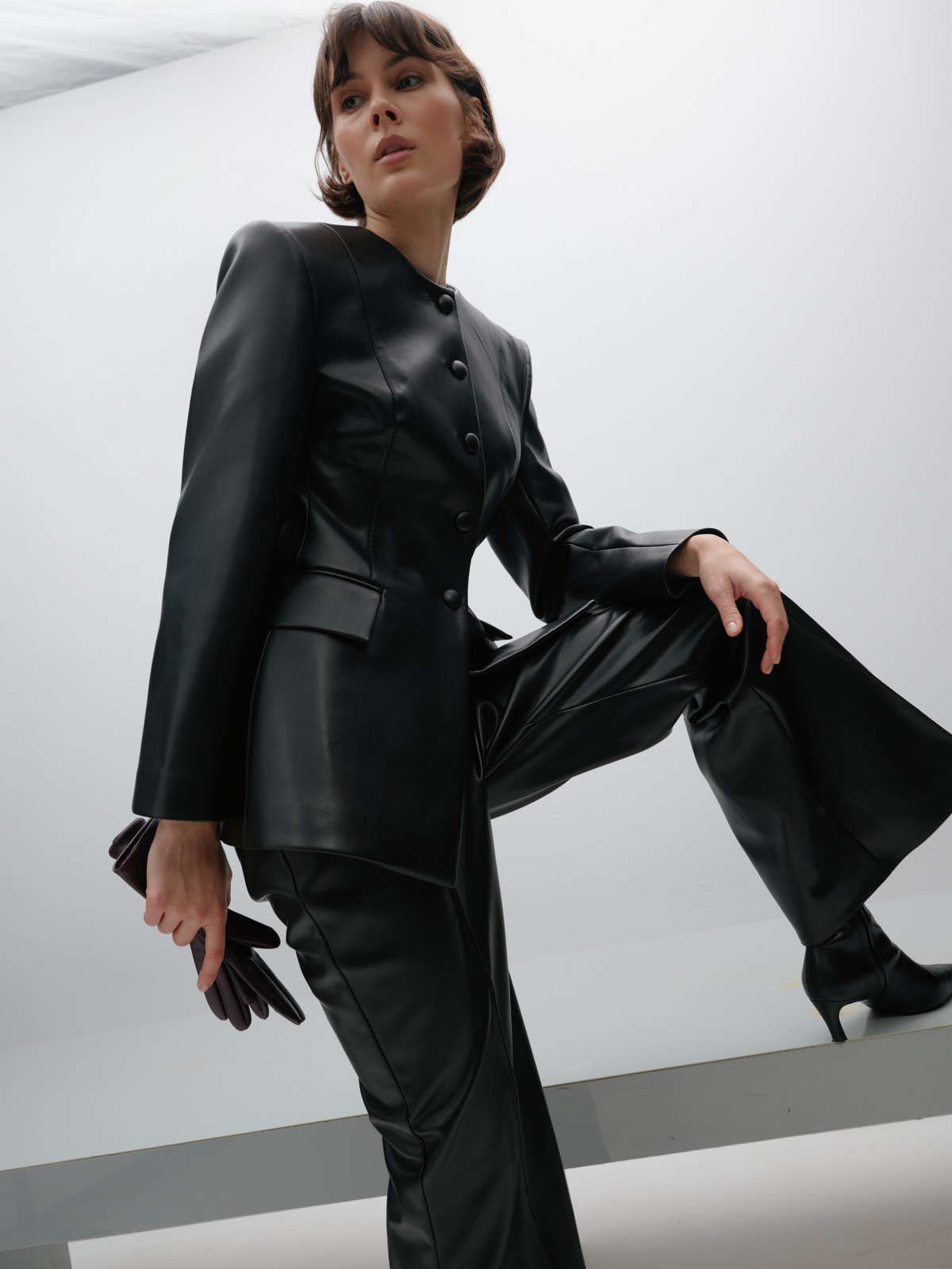 Бренд доповнив свою лінійку костюмів приталеними жакетами з екошкіри, штанами прямого крою з вишивкою на кишені, а також спідницями міді з екошкіри у чорному, молочному та сливовому кольорах. Одиниці з костюмів можна міксувати між собою та з речами різних фактур, створюючи як більш ділові, так і затишні зимові образи.