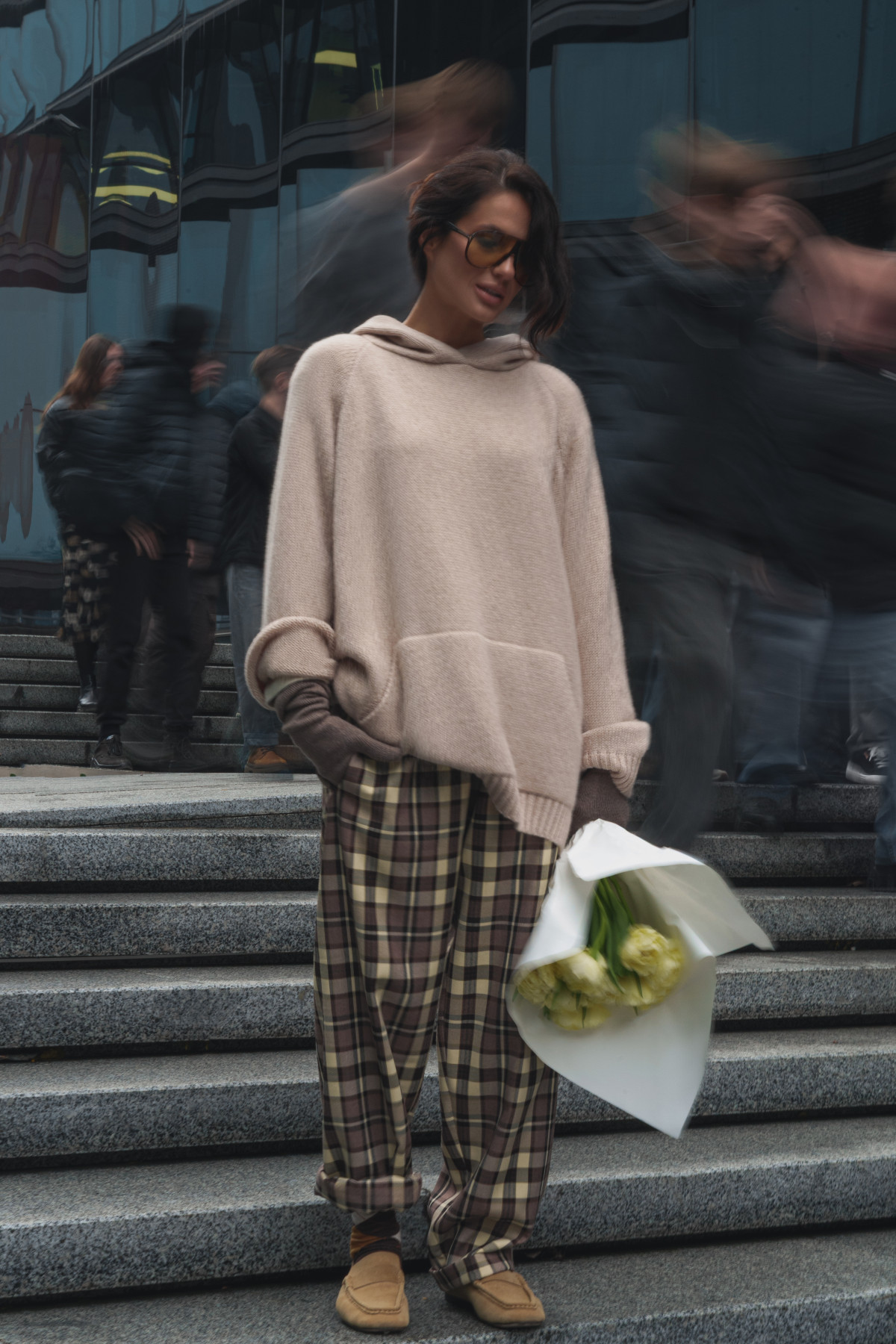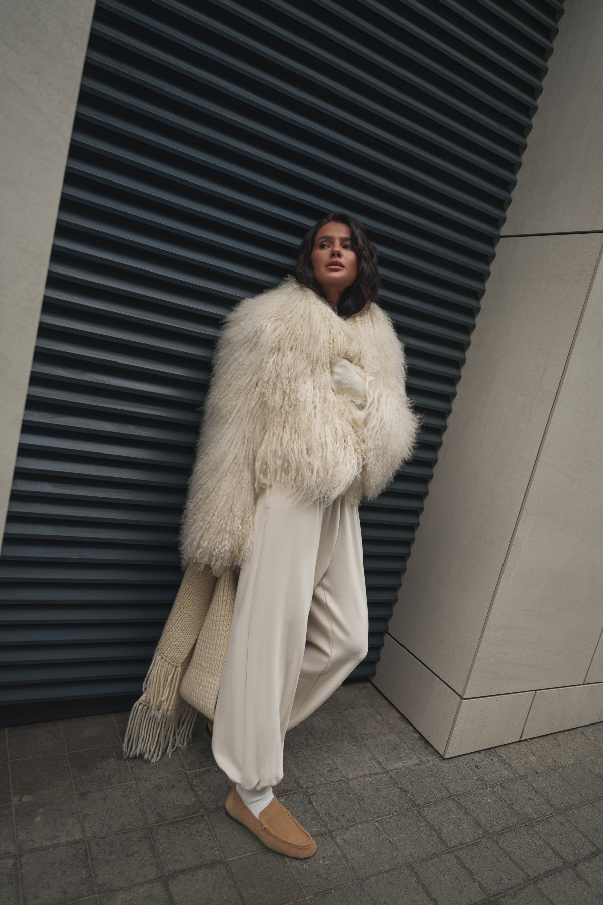 Акцентом колекції стала пухнаста шуба з лами в декількох кольорах — вона однаково добре працює у різних настроях: у парі з брюками створює елегантний чи міський образ, зі спортивними джогерами виглядає effortless і сучасно, із сукнею чи спідницею додає контрасту й текстури.
