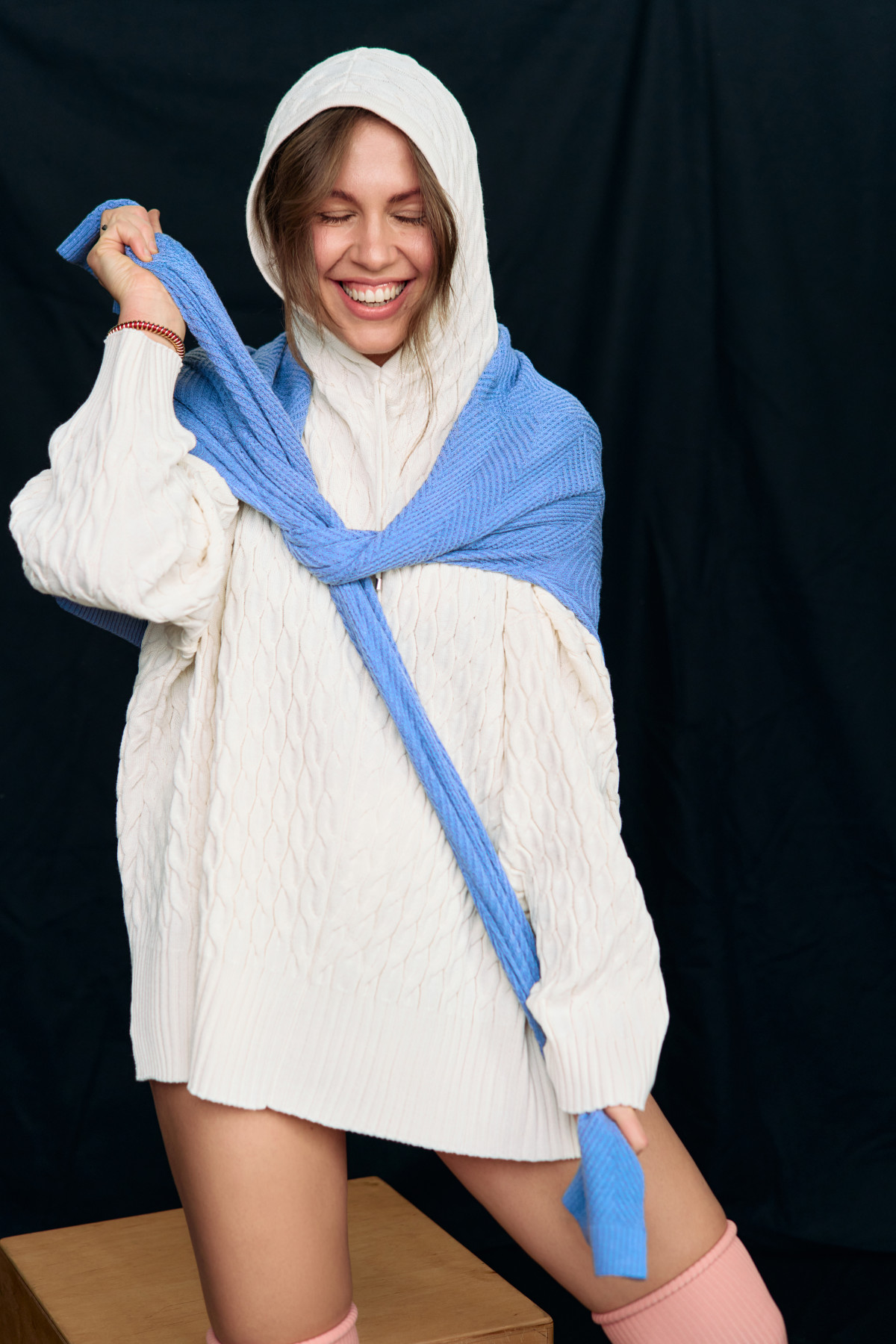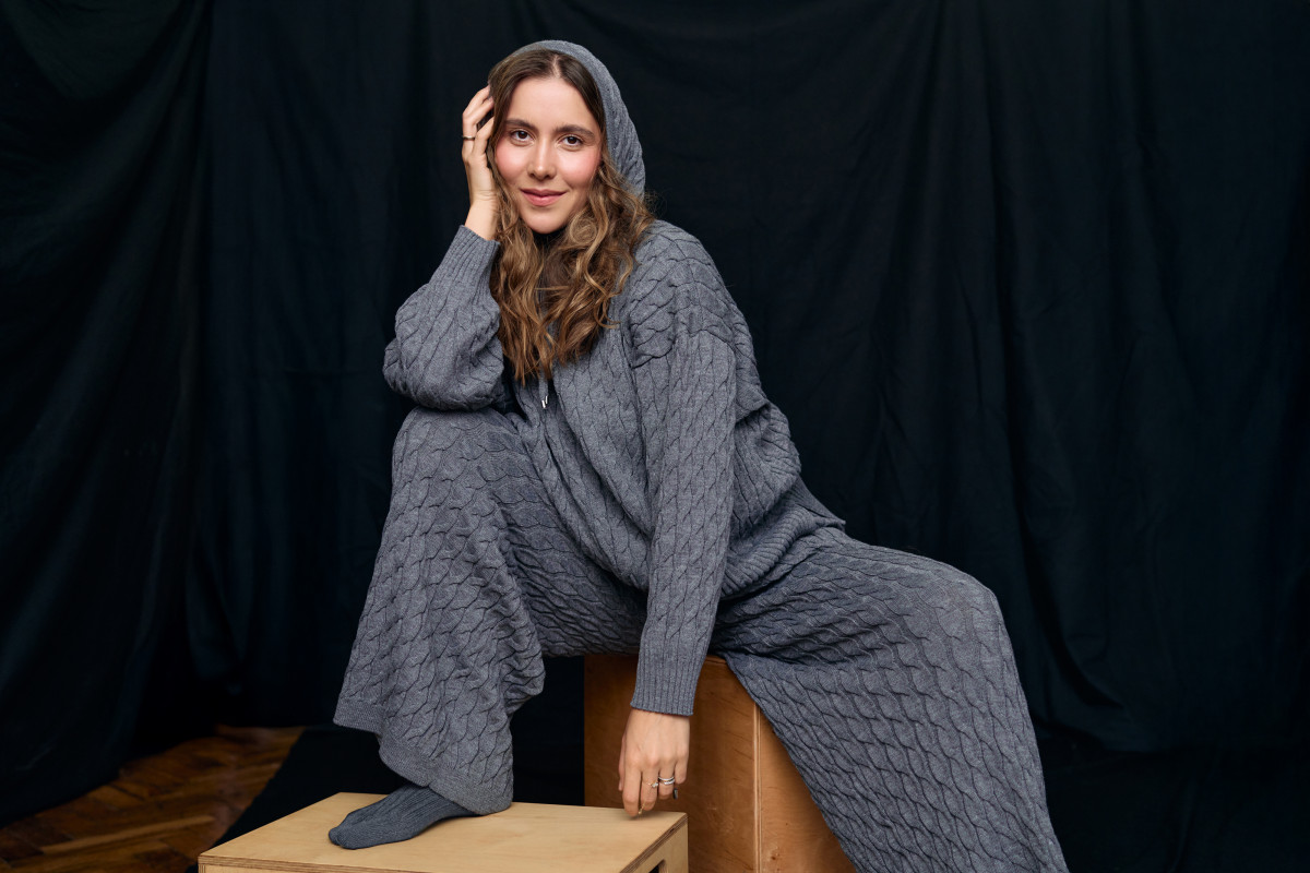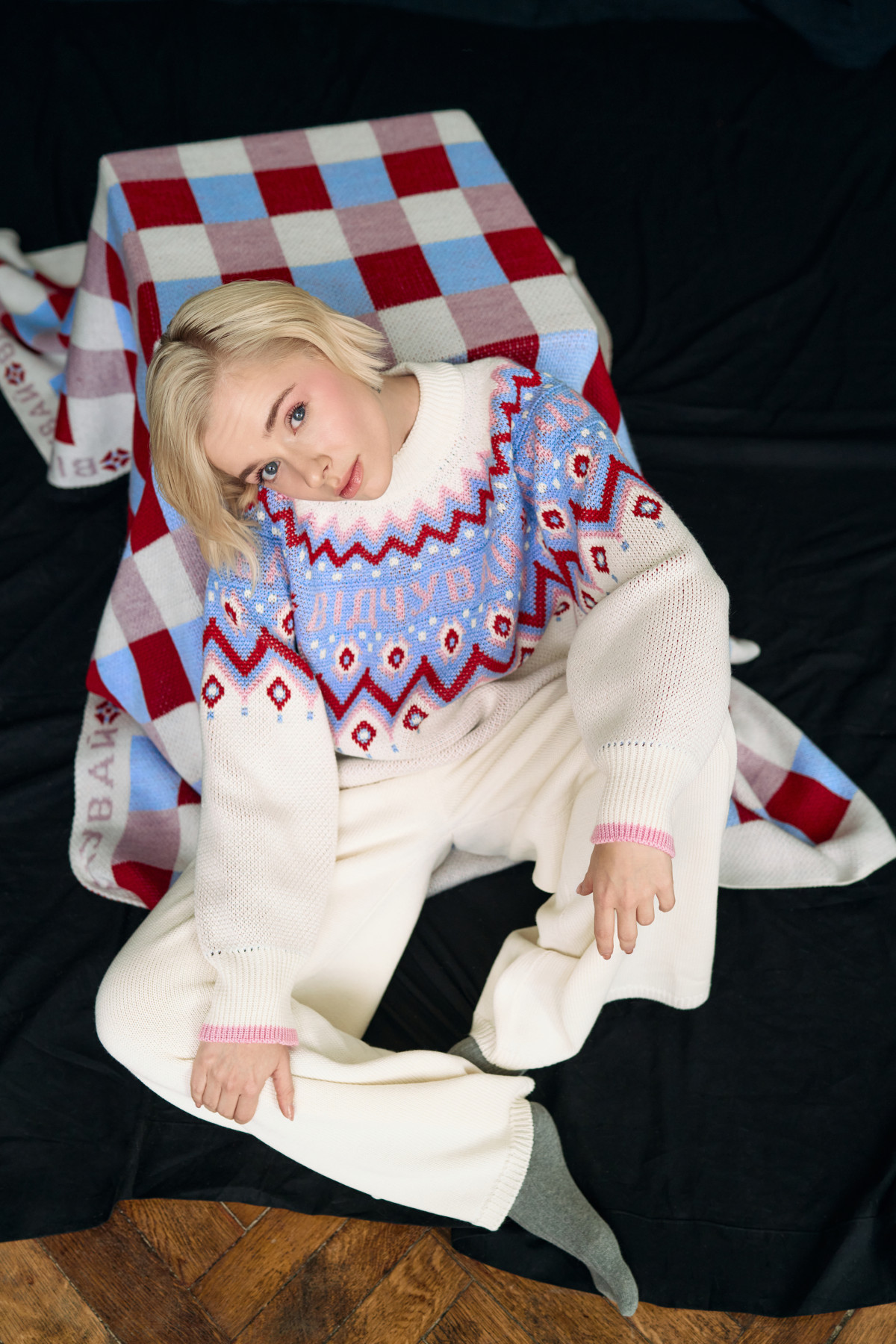 До колекції увійшли м’які трикотажні костюми з вільних худі та штанів, що однаково органічно виглядають удома й у місті; светр із вивʼязаним написом «Відчувай» — як нагадування про повернення до себе; а також яскравий плед, створений, щоб зігрівати та підтримувати.
