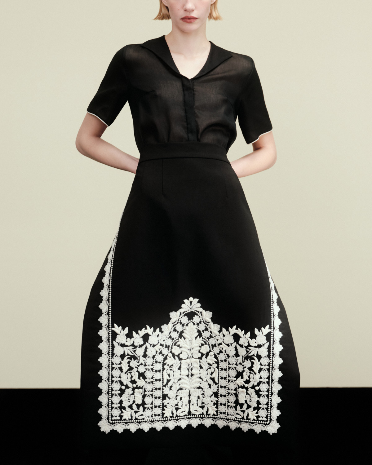 У колекції представлені вироби, створені завдяки ретельній ручній роботі, зокрема в техніці гачкування. Квіткові плетені елементи прикрашають сукні та блузи, а прозорі шовкові спідниці розквітають глибокими синіми флористичними композиціями. Пальто з вовни з мереживним коміром, пончо з унікальним орнаментом і плактуха, розшита в чотирьох нетрадиційних техніках, утворюють цілісну DELEGAN-історію.