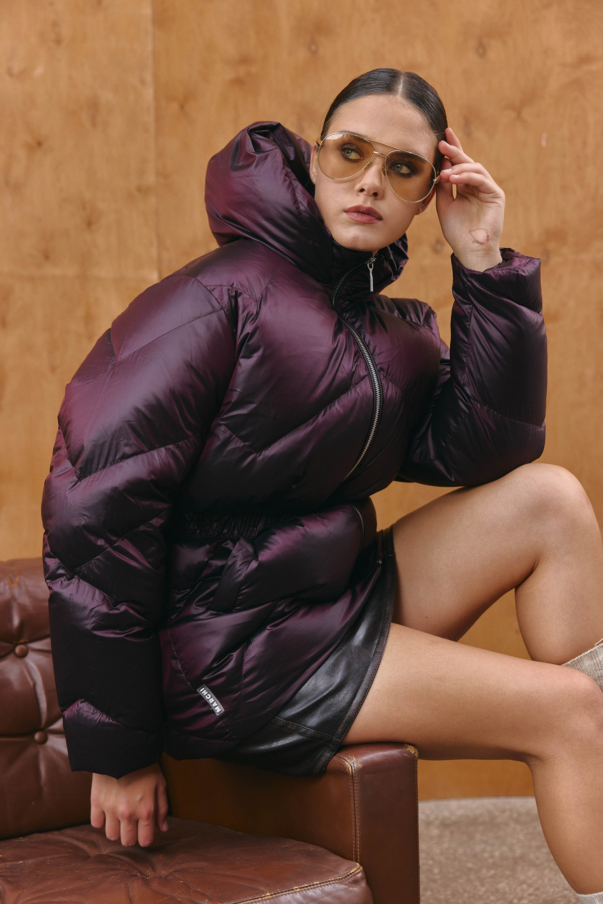 У центрі дропу — базові силуети: двосторонні пуховики з принтами, пальто, костюми та сорочки у відтінках шоколадного, темно-синього та глибокого чорного.
