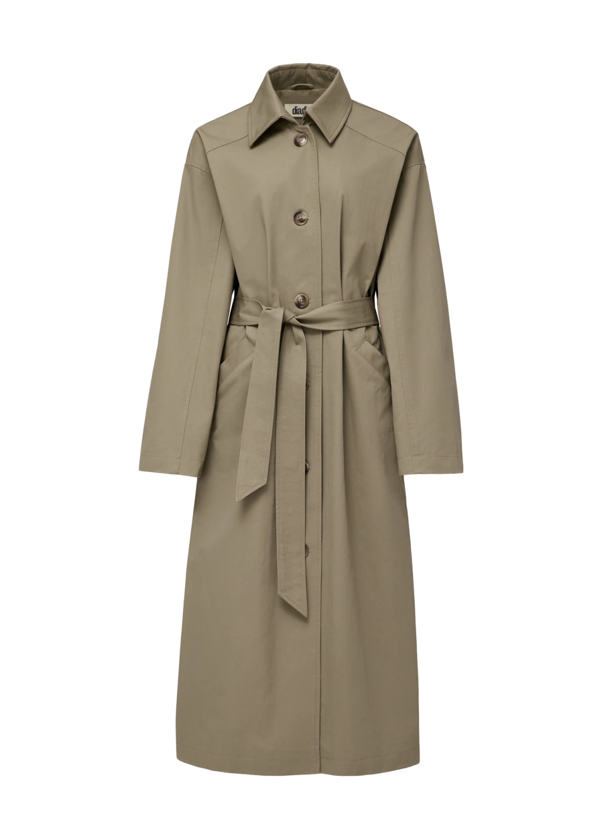 Оливковий замінює класичний беж. Це практичний колір, що тримає форму і добре працює від офісу до вечірньої прогулянки містом. У поєднанні з широкими брюками й білими кросівками тренч має елегантний вигляд без натяку на формальність.