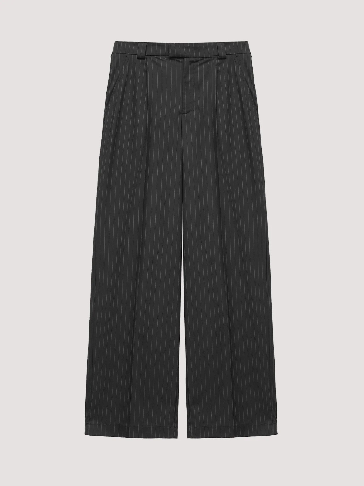 Ключовий силует сезону — вільний. Смужка візуально витягує фігуру, тому ці брюки добре стилізуються і з жакетом, і з худі. Найкраще — у м’якій вовні або суміші з віскозою.