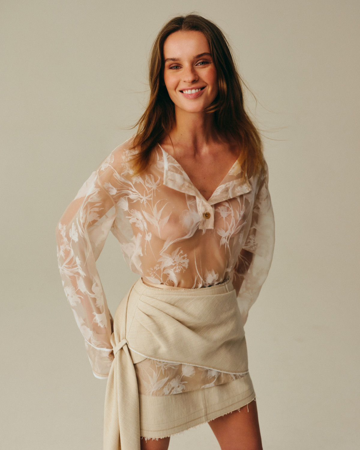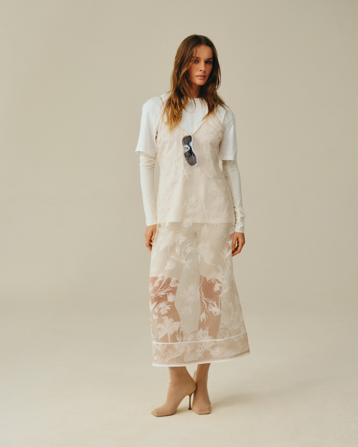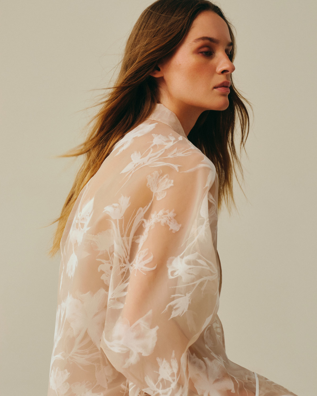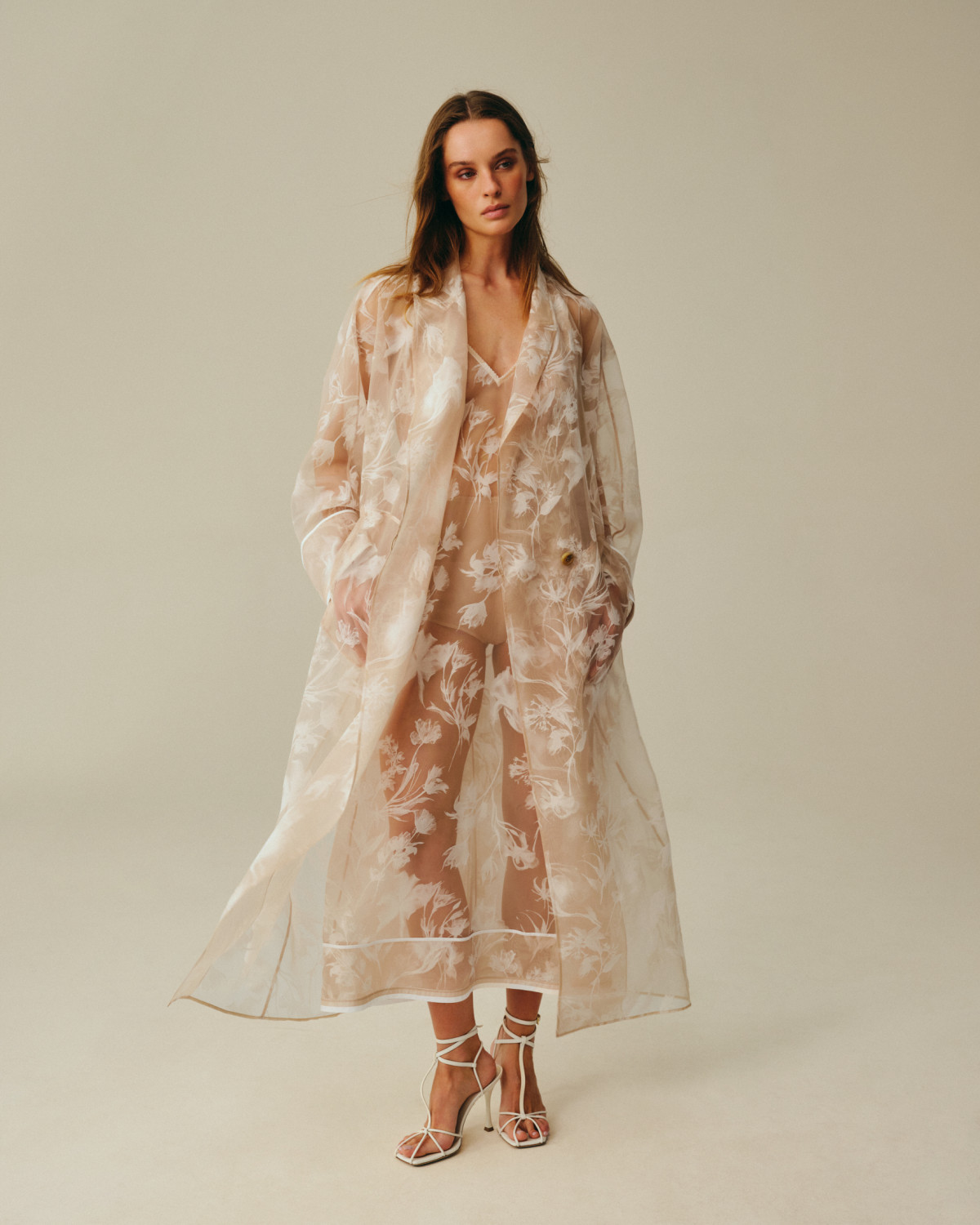 Колекція тримається на контрасті фактур: прозора японська органза з вибитим 3D велюровим візерунком поєднана з італійським льоном із м’якою саржевою фактурою. Органза — наче повітря, що оживає в русі, — стала ключовим джерелом натхнення: флористичні мотиви в тканині дублюються у вигляді окремих об’ємних елементів, які вишиваються вручну на топах та басках — силуетах, знакових для бренду.