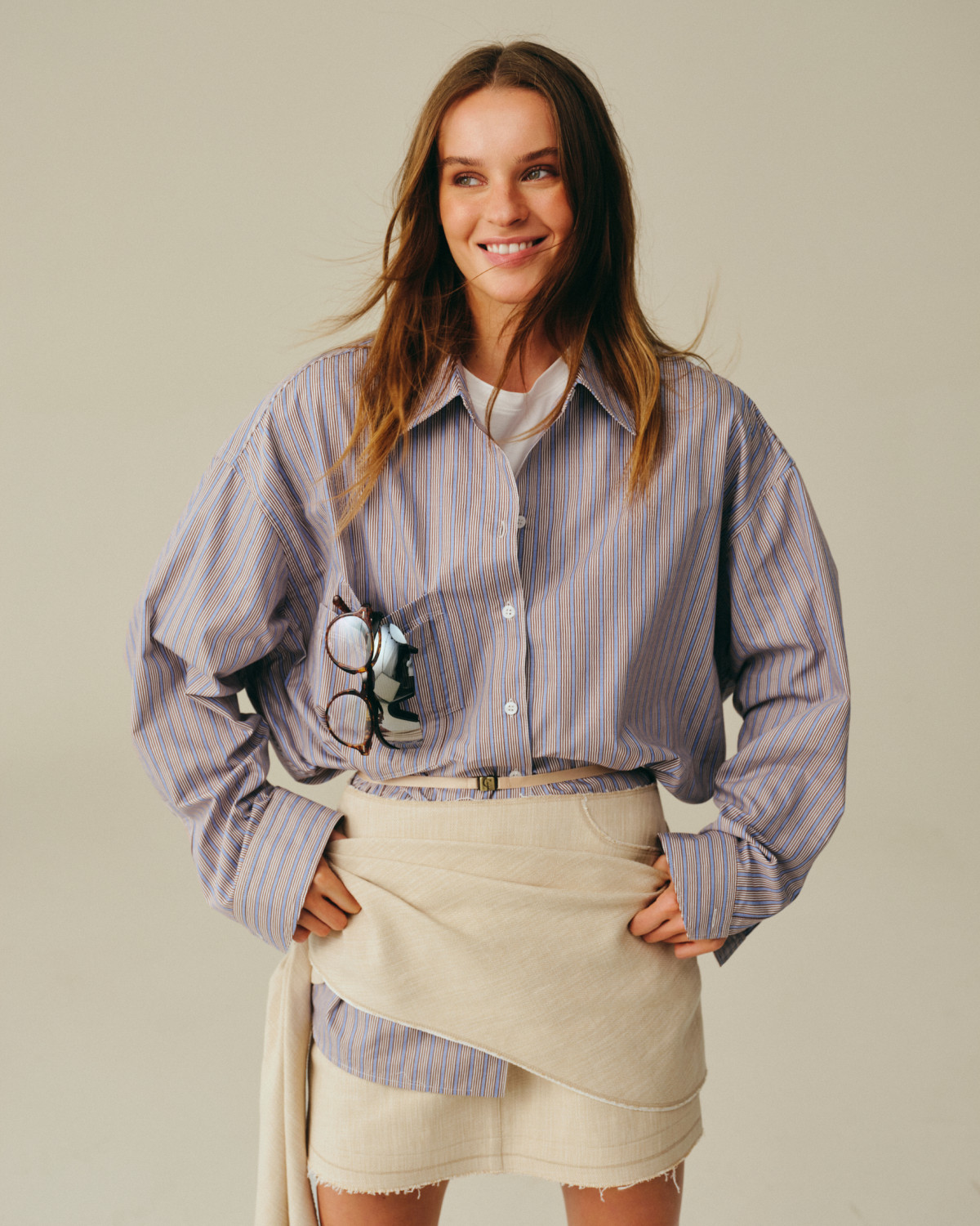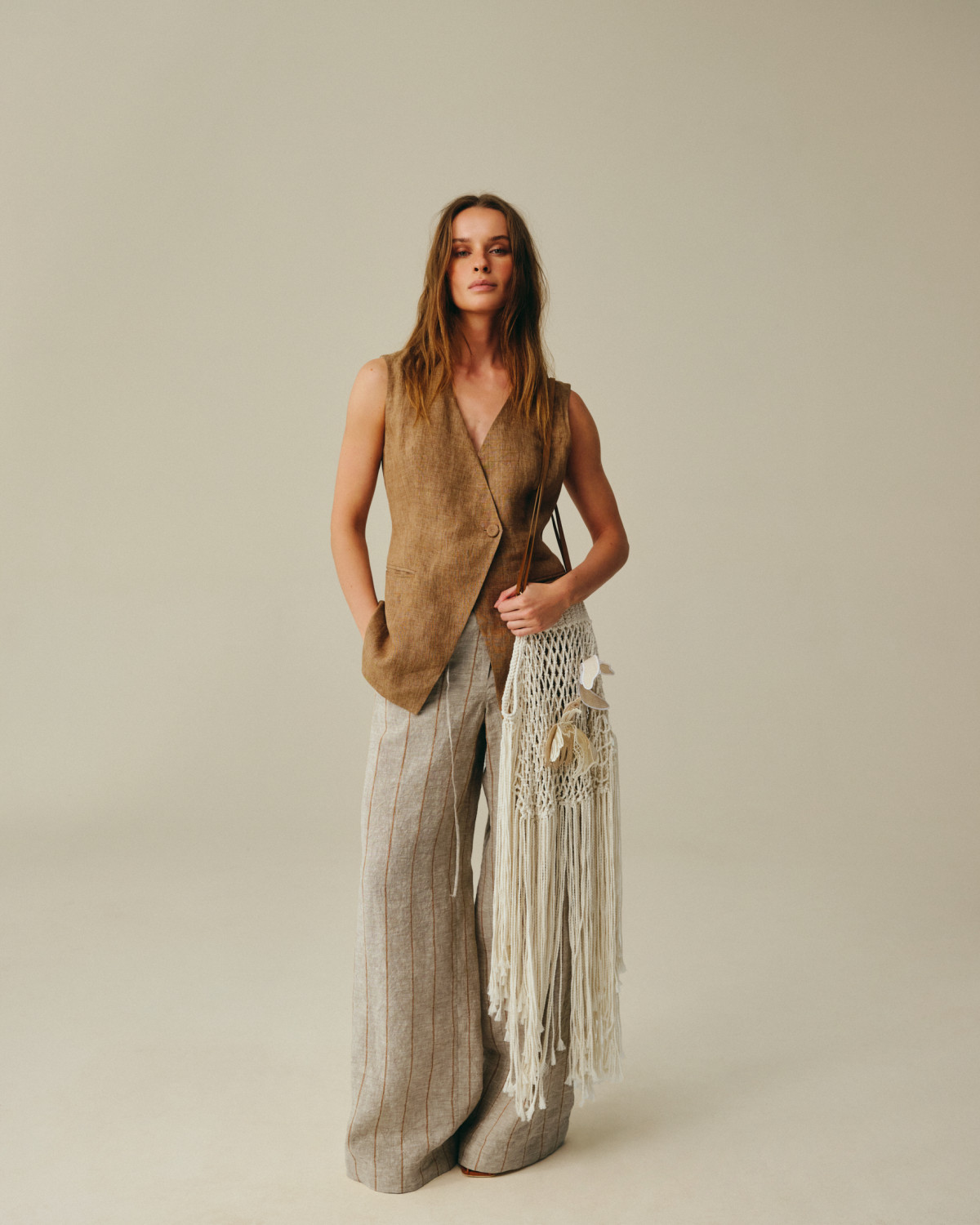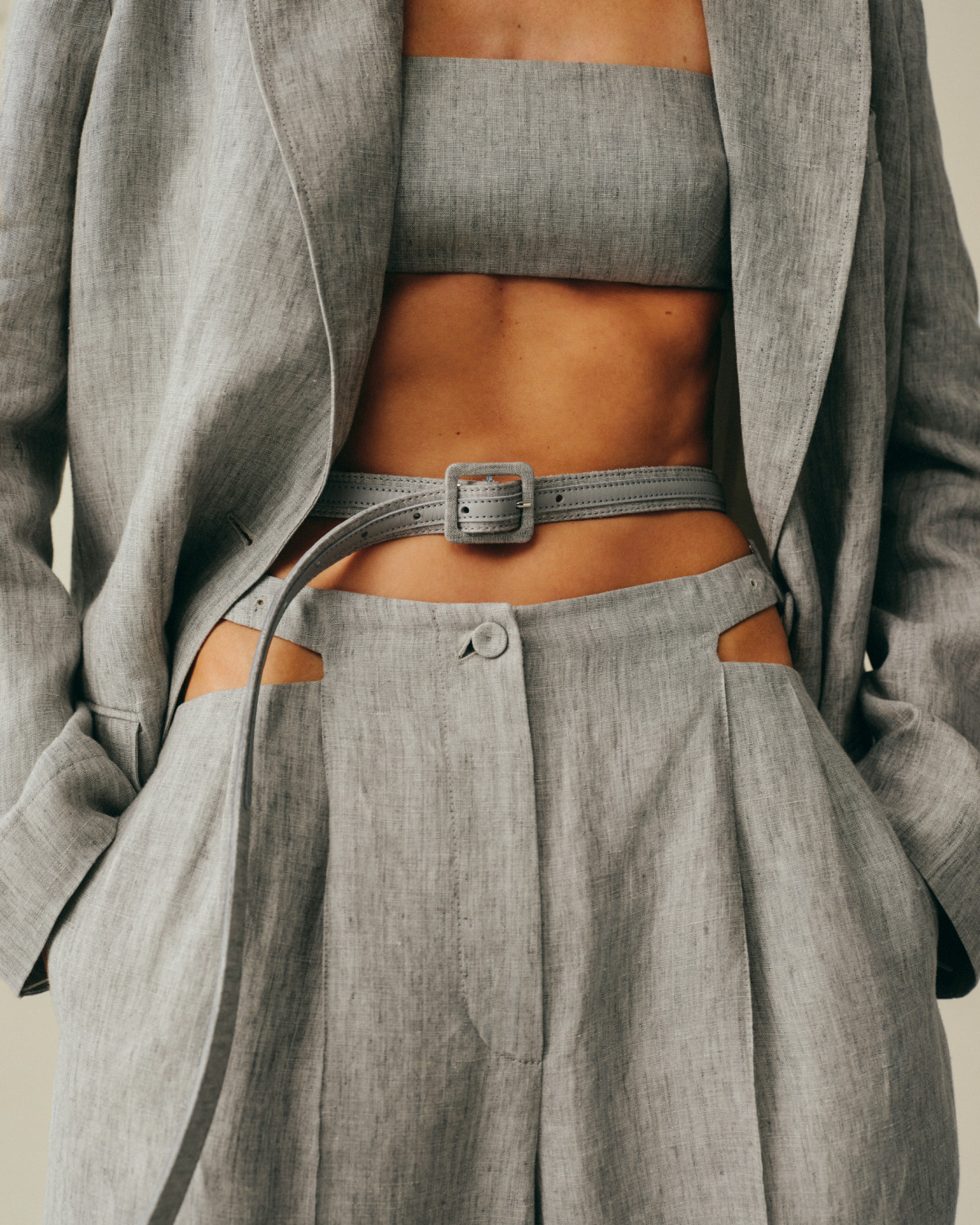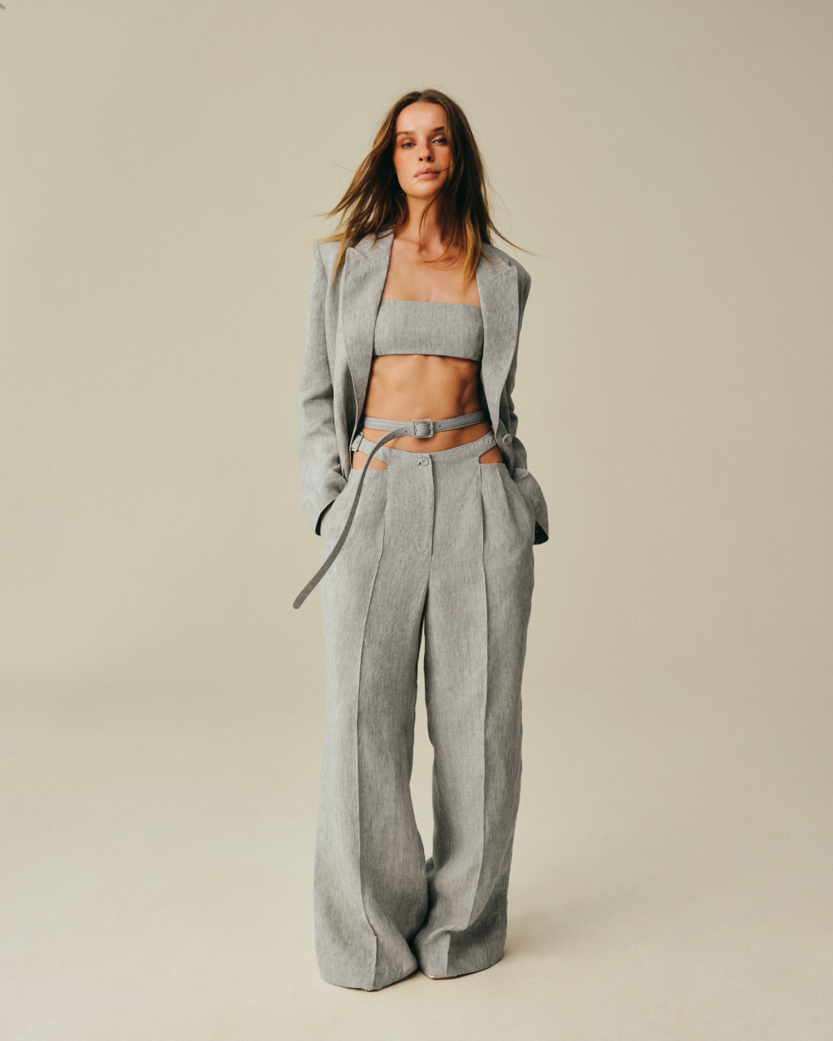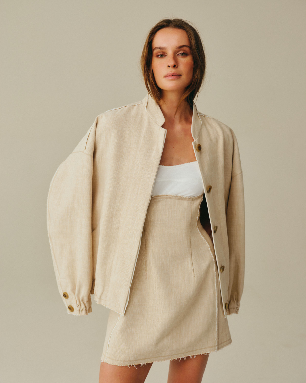 Дроп створено з думкою про рух — як фізичний, так і стилістичний. Еластичні деталі адаптуються до фігури, вільний крій не обмежує темпу, а баланс між комфортом і виразністю виключає потребу у компромісах. Лляна частина колекції — з відкритими зрізами, декоративною обробкою та фірмовою білизняною фурнітурою з монограмою — формує другу опору капсули, чітку й функціональну.