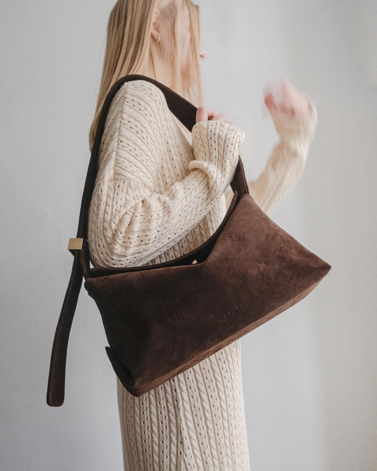 Лекала до сумки Niche від бренду HVÓYA перероблювали близько шести разів: змінювали її форму, наповнення та ущільнювачі всередині, експериментували з довжиною ручки та іншими деталями. У підсумку на світ зʼявилася містка сумка з коричневої замші та з бронзовою фурнітурою, яка стане ідеальним доповненням розслаблених образів у богемному французькому стилі.