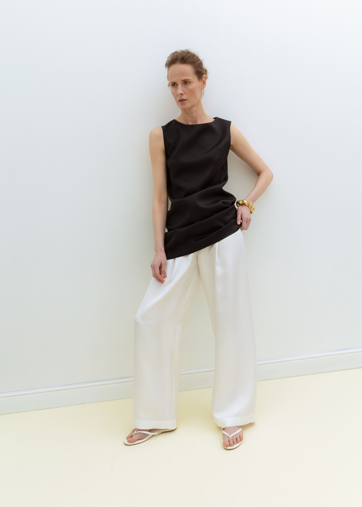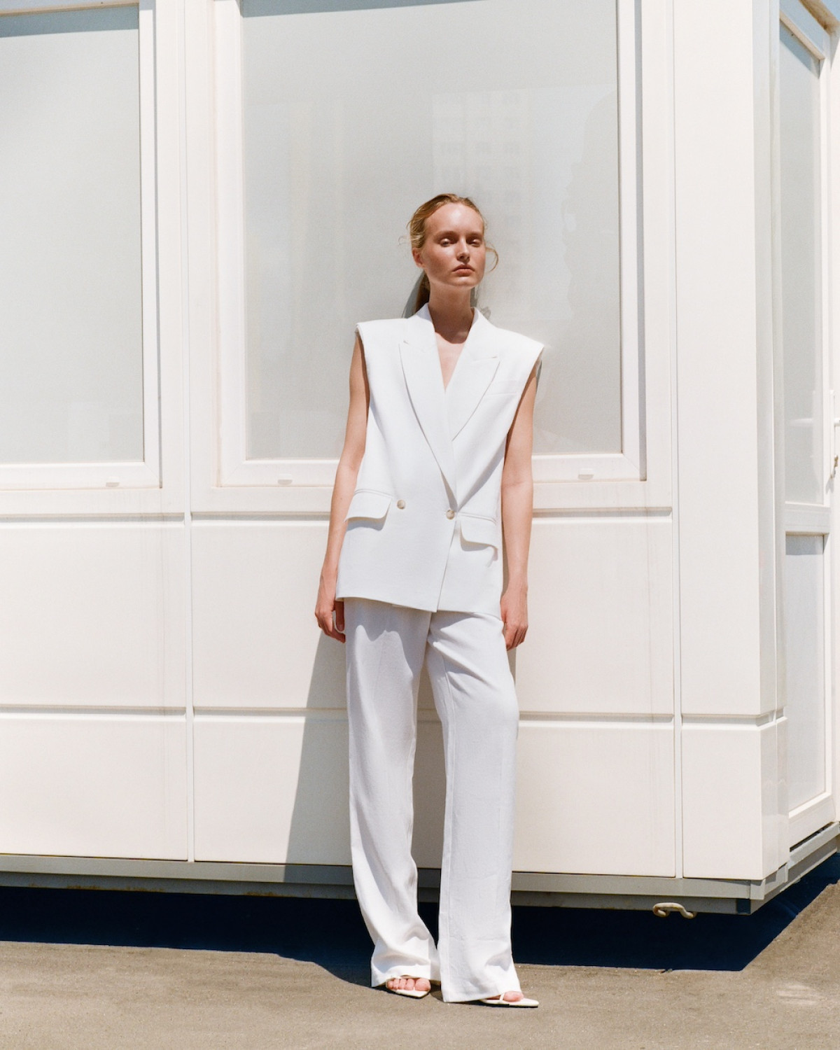 В основі колекції залишаються костюми — цього разу з легкого льону. Окрім них, до лінійки увійшли жакети, штани палаццо, а також жилети в трьох різних варіаціях: оверсайз-крою; приталені з деконструктивними лацканами й вирізами збоку, що підкреслюють контраст широких плечей і вузької талії; а також класичні костюмні.