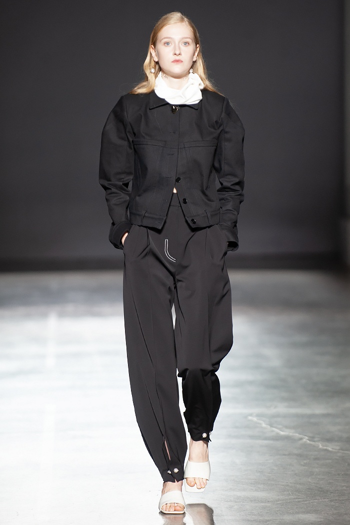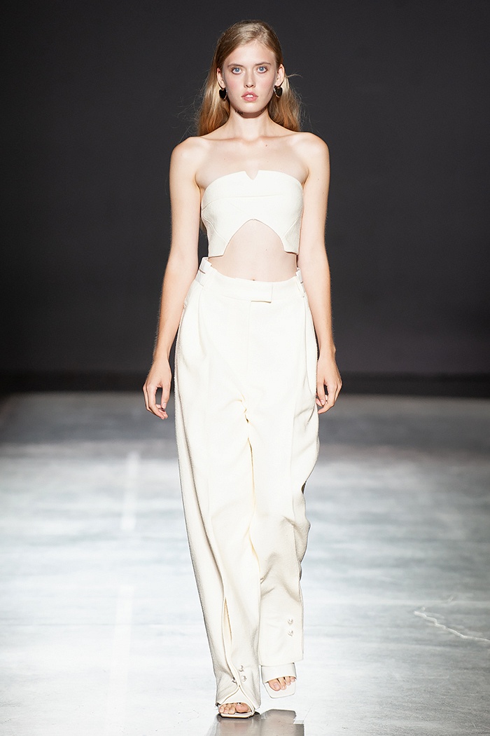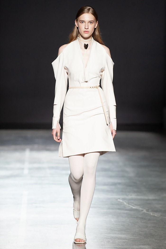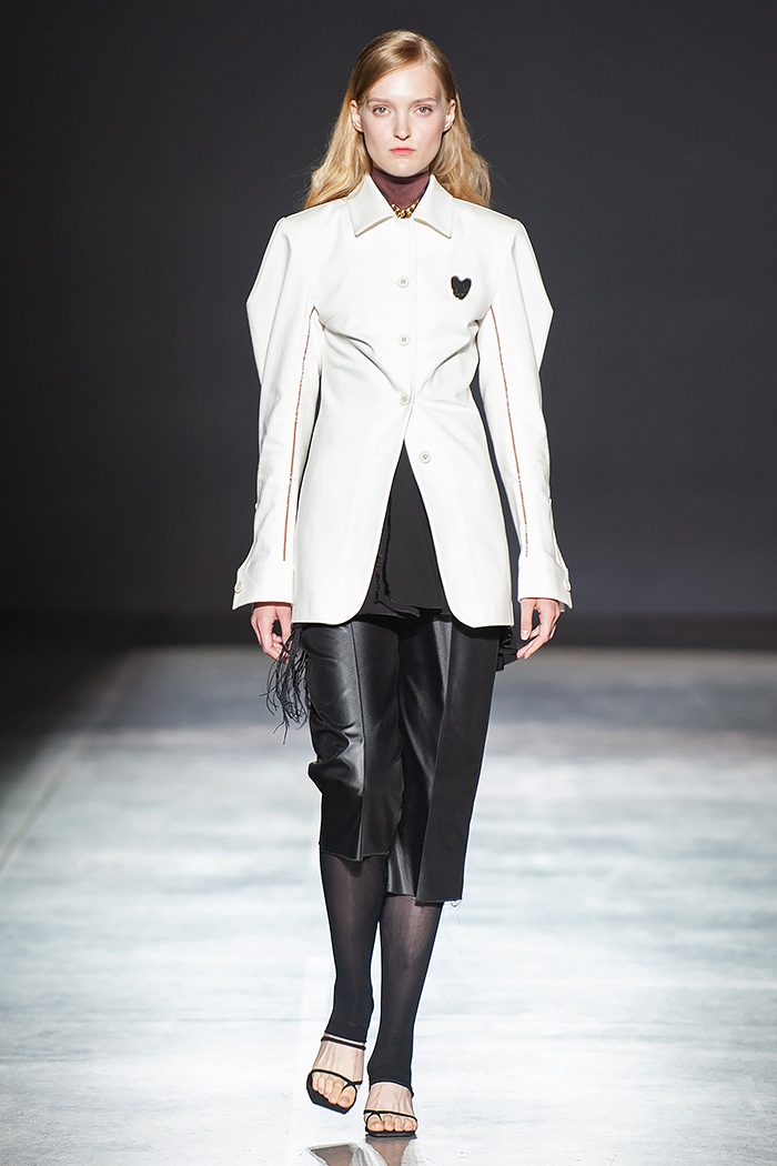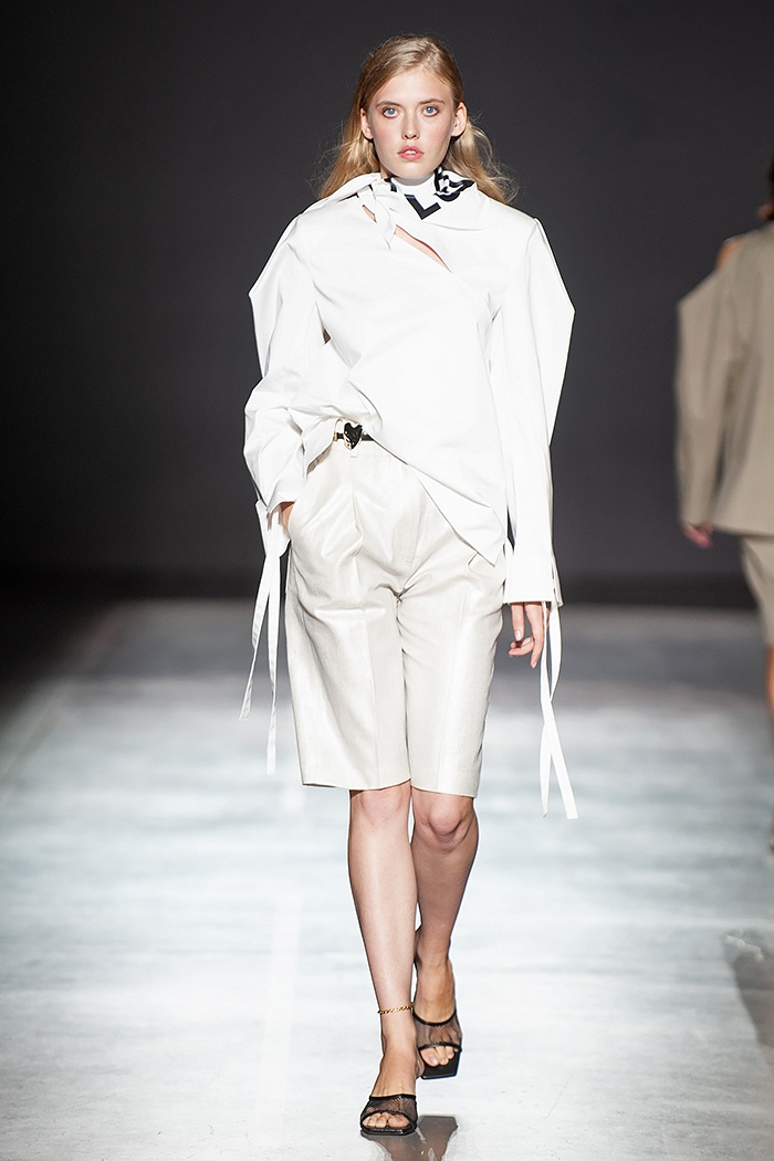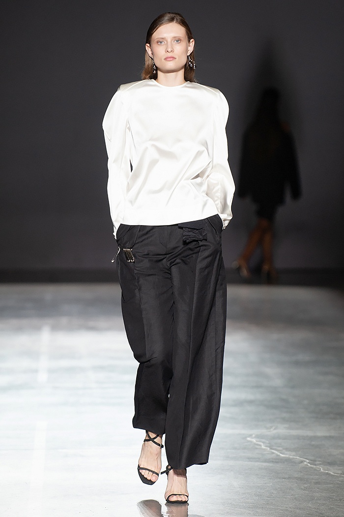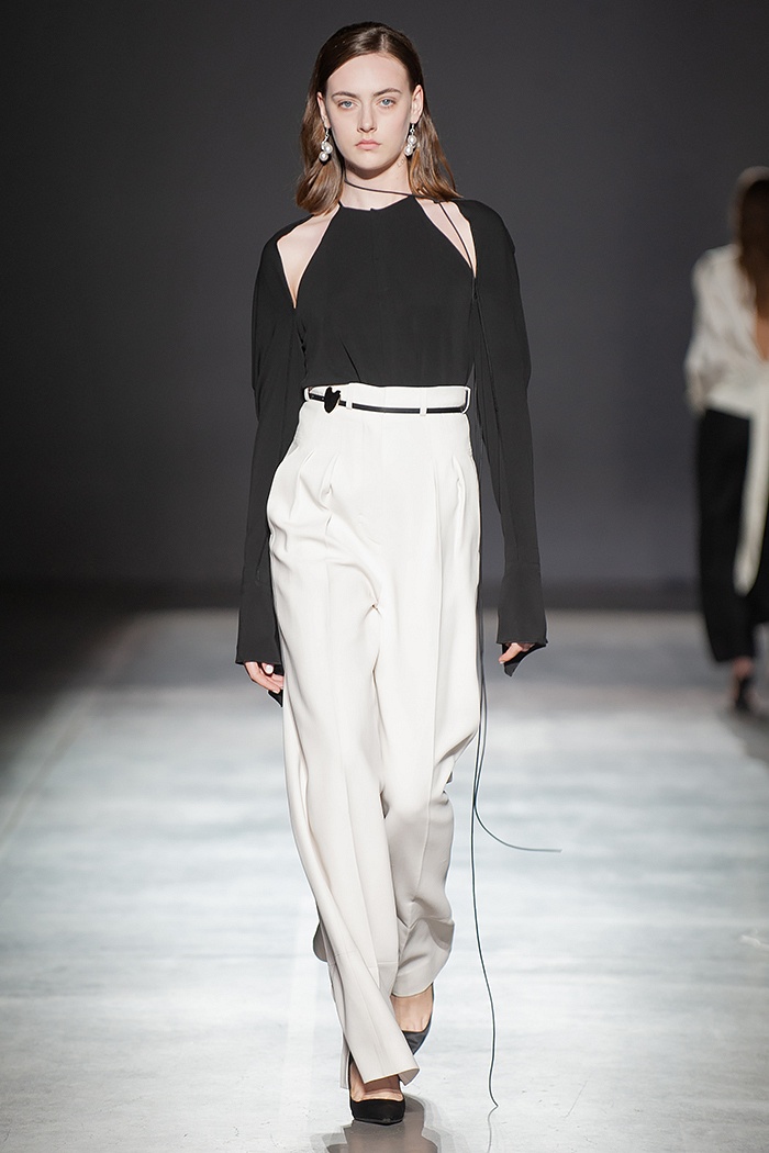 В этом сезоне лаконичные брючные костюмы (визитная карточка бренда) соседствуют с романтичными платьями сложной драпировки и топами с открытыми плечами. О романтическом настроении коллекции говорят и аксессуары: золотые пуговицы, серьги и броши в форме сердца, а также множество украшений из белого жемчуга — символа женского начала «Инь» и спутника всех невест.