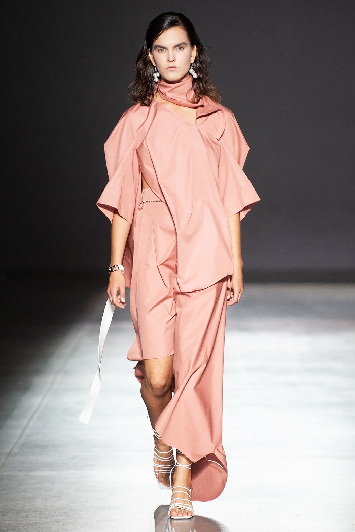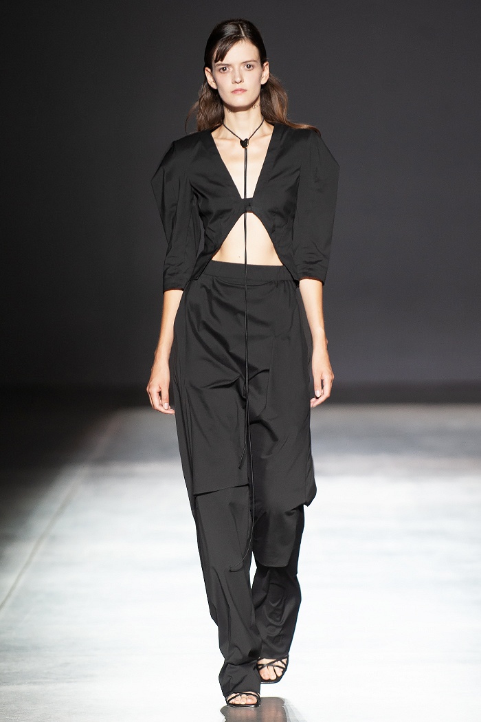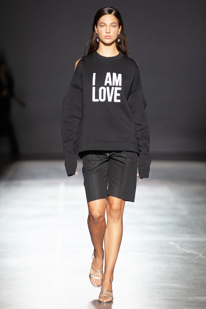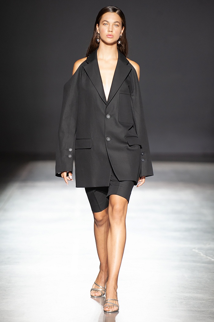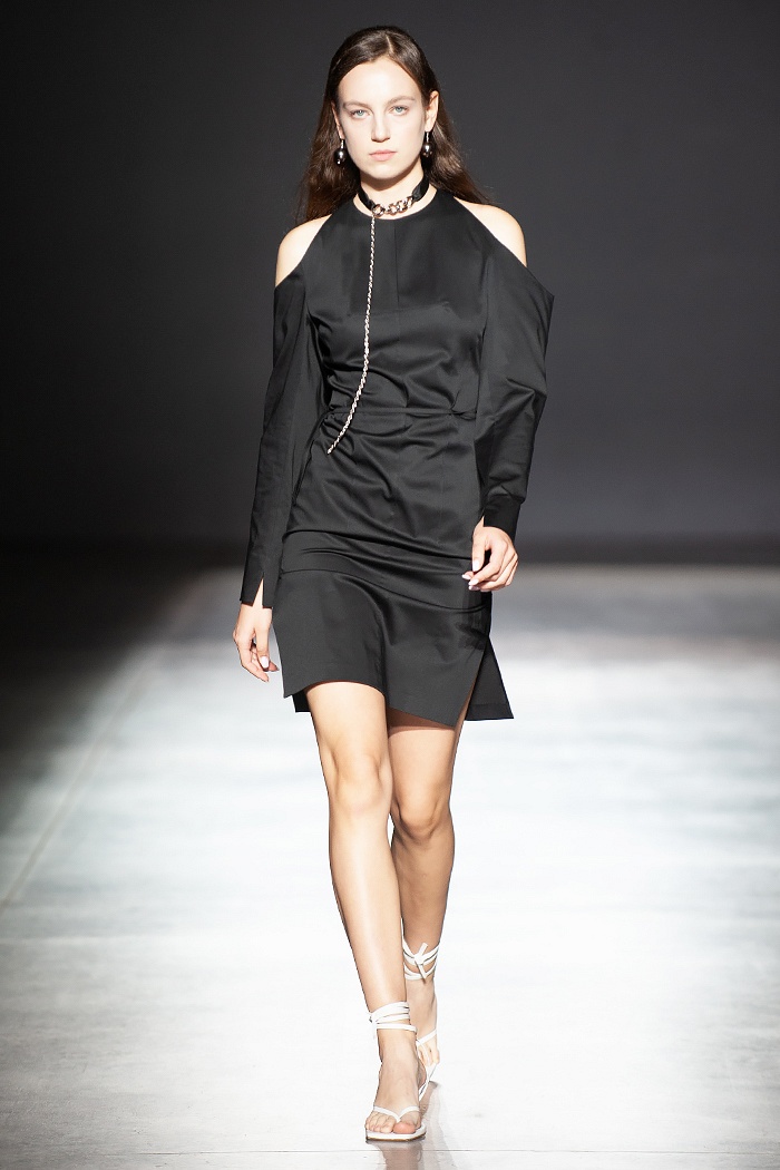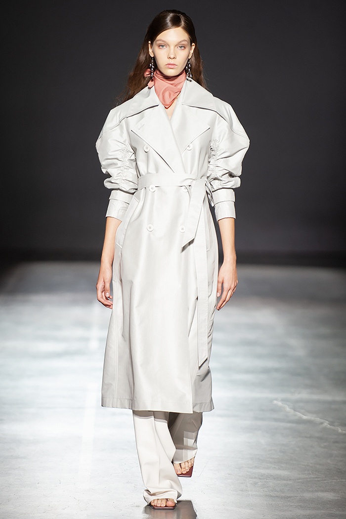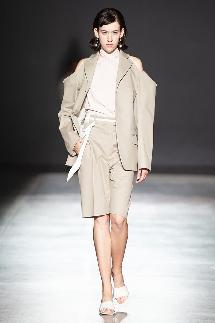 В этом сезоне лаконичные брючные костюмы (визитная карточка бренда) соседствуют с романтичными платьями сложной драпировки и топами с открытыми плечами. О романтическом настроении коллекции говорят и аксессуары: золотые пуговицы, серьги и броши в форме сердца, а также множество украшений из белого жемчуга — символа женского начала «Инь» и спутника всех невест.