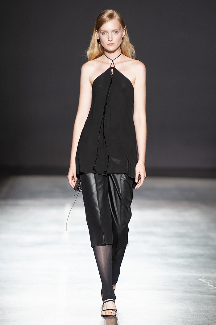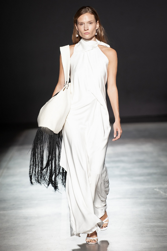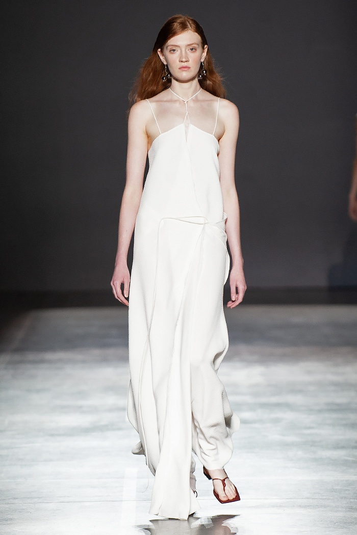 Финальный образ показа — белое шелковое платье на тонких завязках.