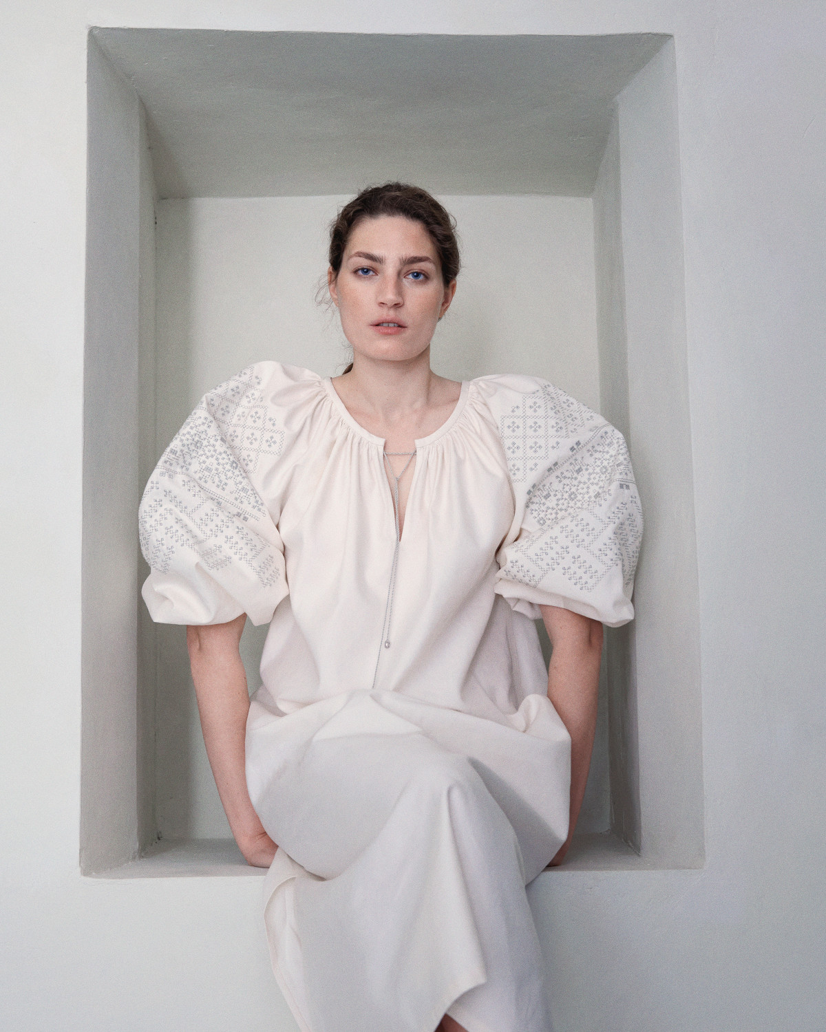Колекція «Архаїчна» створена як етична пропозиція, яка не шкодить українській спадщині. До неї увійшли жіночі та чоловічі вироби: сорочки, сукні, спідниця й верхній одяг. Вони наслідують характерні ознаки давнього українського вбрання — традиційний крій, орнаментику та природну колірну гаму.