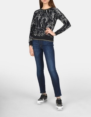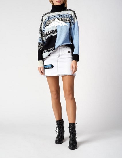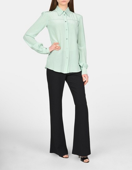 Ярким решением для первых весенних дней станет оригинальный свитер асимметричного кроя с высоким воротом. Интересное сочетание голубого и черного, необычного орнамента и надписей не оставят вас незамеченной в толпе. Для более сдержанных образов выбирайте однотонный верх: мятный свитер или изумрудный кардиган для прогулок, а также фисташковая рубашка для офисных будней станут незаменимыми вещами в вашем весеннем гардеробе. А реглан с абстрактным рисунком под строгий жакет на одну пуговицу — то, что нужно для бизнес-леди в этом сезоне.