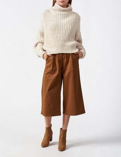 В качестве практичного низа делайте ставку на серые брюки высокой посадки. Они отлично садятся по фигуре благодаря резинке на поясе. Для casual образа идеальным решением станут кюлоты карамельного оттенка: модель сделает правильный акцент на талии и скроет мелкие недостатки фигуры. Кожаные брюки (как в обтяжку, так и oversize) остаются стопроцентным попаданием в тренды. Тот случай, когда не нужно выбирать между стилем и практичностью!