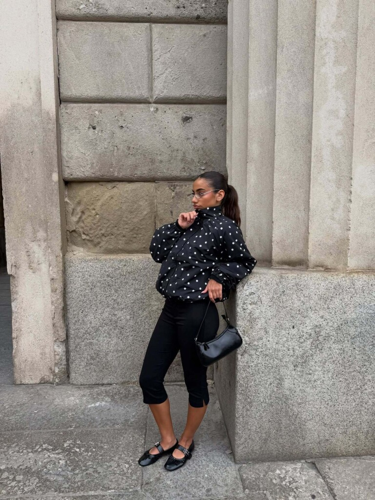 Якщо у вашому гардеробі є речі білого кольору з принтом у горох, спробуйте побудувати образ на контрастах. Додайте чорні елементи: сумку, приталений жакет або укорочене пальто, а також взуття на кшталт масивних чобіт. Такий підхід збалансує ніжність polka dot і зробить образ більш актуальним для міського ритму.