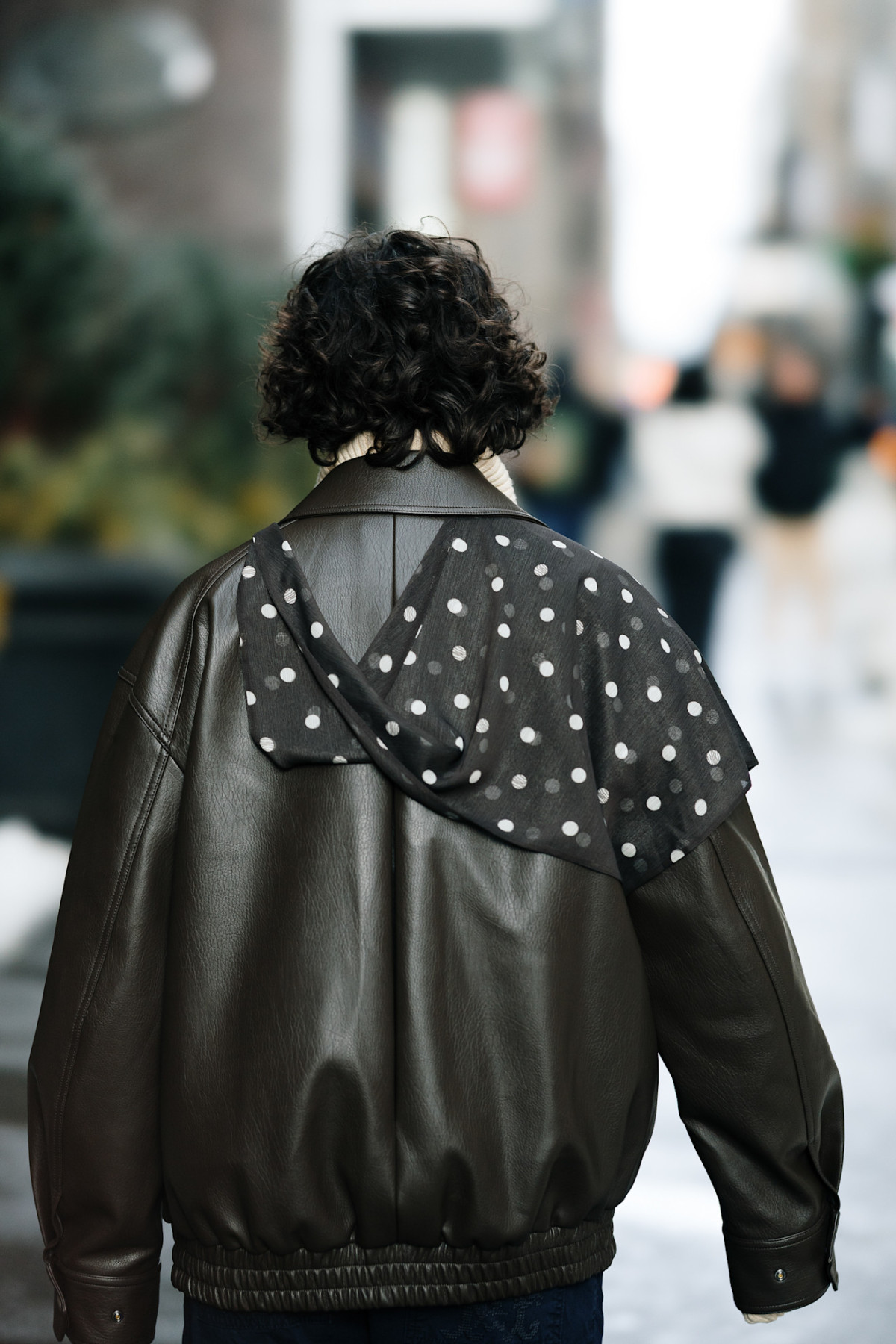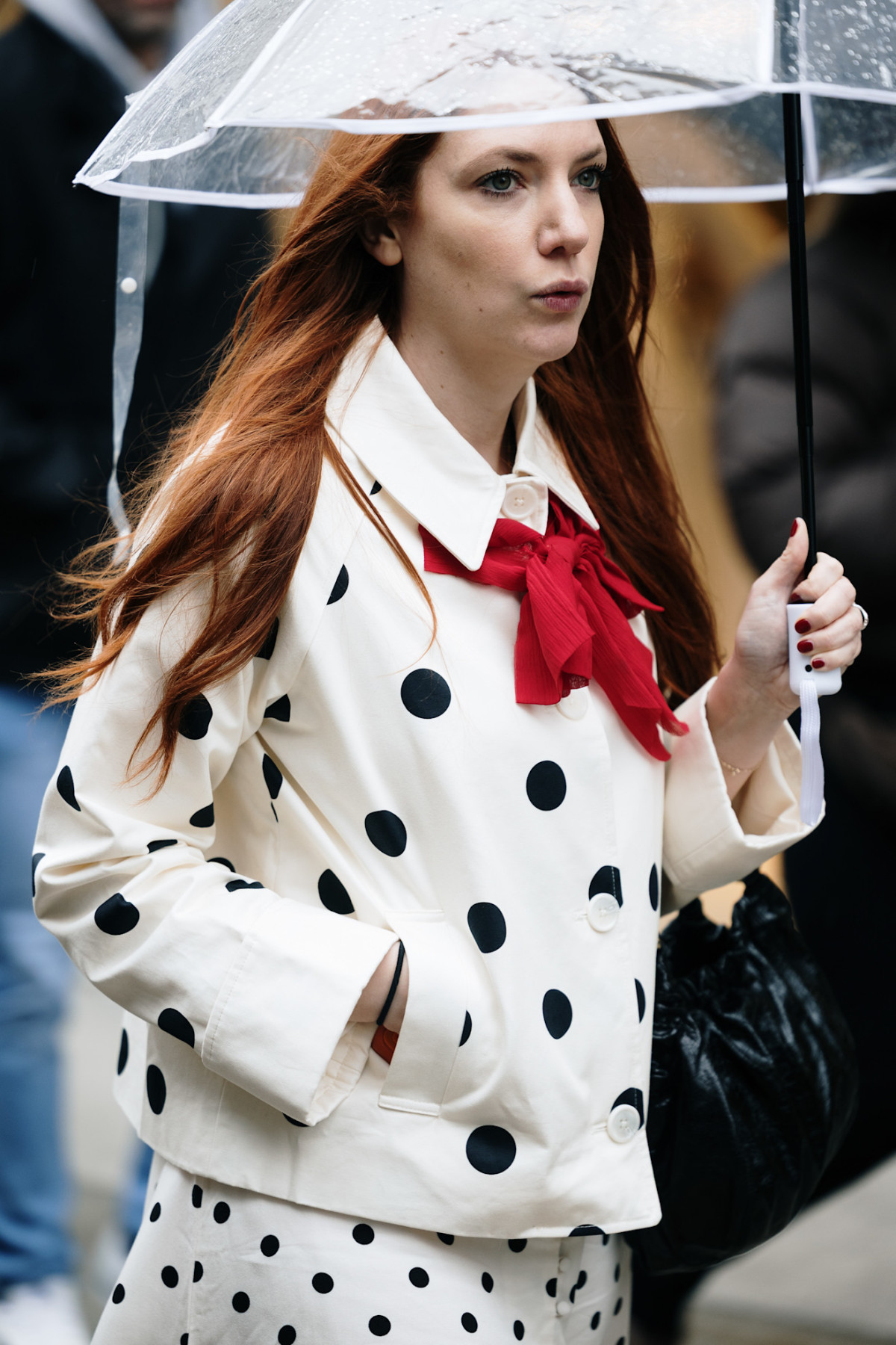 Якщо принт у горох здається надто акцентним у речах, почніть із аксесуарів. Наприклад, легкий трикутний шарф у polka dot, накинутий поверх шкіряної куртки, виглядає свіжо та додає образу легкого акценту без перевантаження.