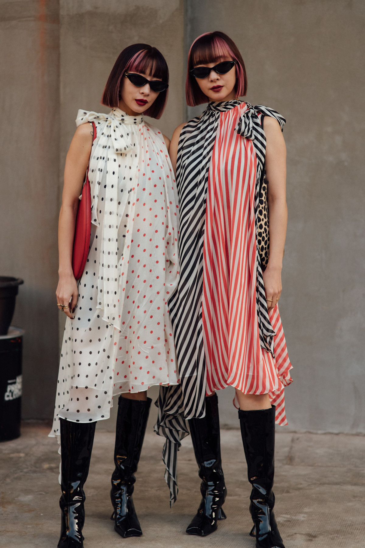 Сміливий спосіб стилізації — поєднання речей у горох із кольоровими колготками. Особливо популярними стали червоні варіанти, які часто з’являлися на модних показах і стрітстайлі під час тижнів моди. Взуття краще підбирати в тон колготок — так образ виглядатиме більш цілісно й гармонійно.