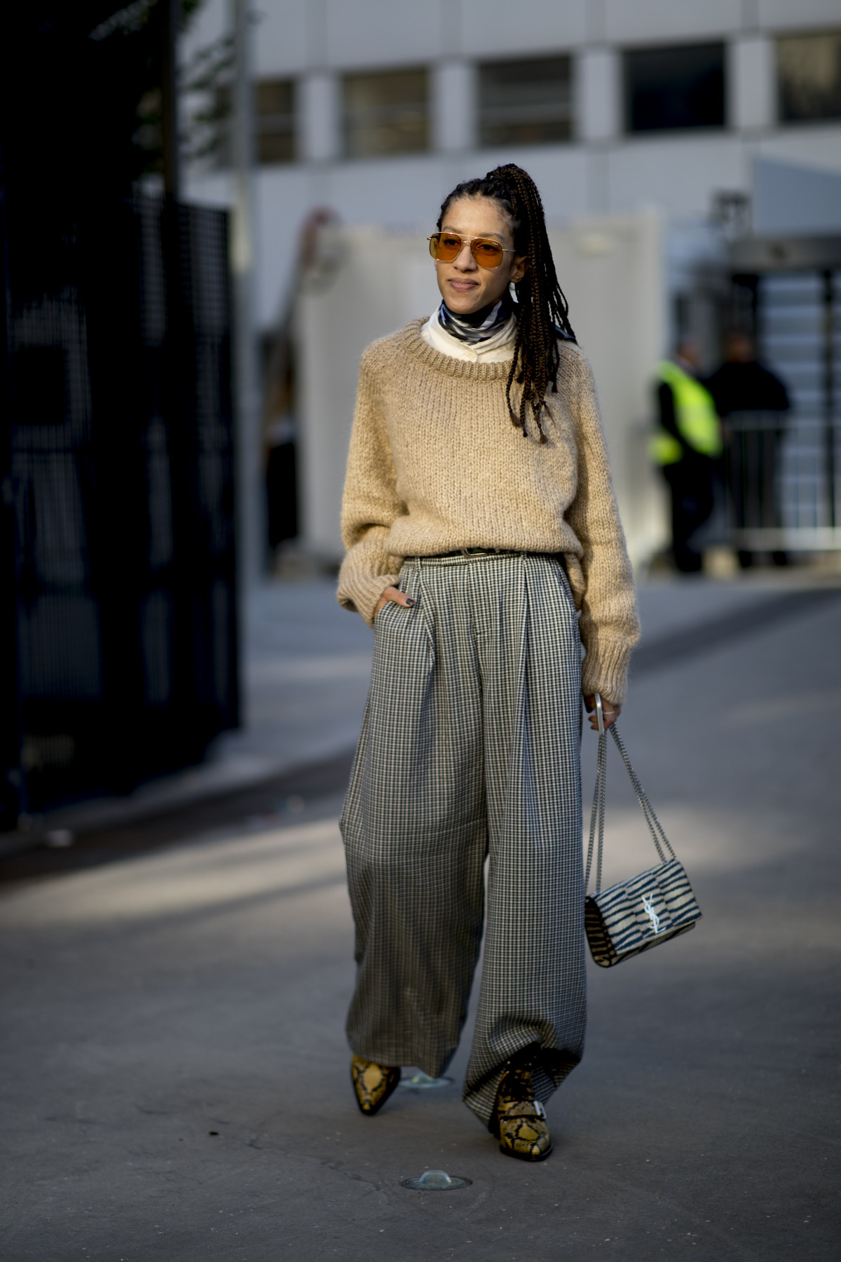 Простой прием на каждый день: расклешенные от бедра брюки и свободный свитер. Наденьте под низ мужскую рубашку, либо же белую футболку.
