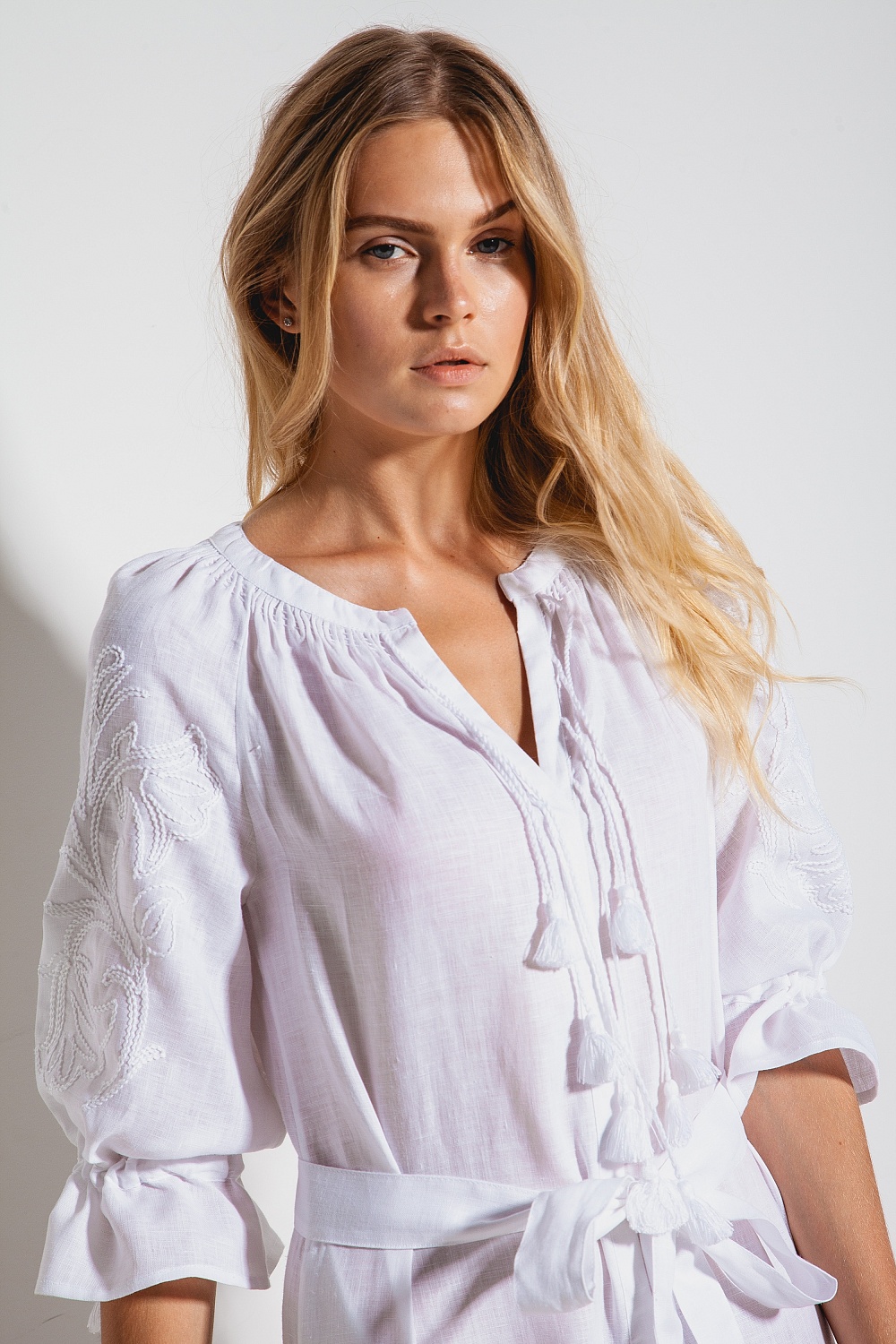 Бархатцы издавна применялись в народной медицине и символизировали чистоту и процветание рода. Виноградная лоза означает развитие, буйство молодости и любви. Воплотившись в вышивке, эти два соцветия раскрывают радость и красоту, дарят силы и вдохновение. Орнаменты нанесены на легчайший лен, поэтому создают воздушный и нежный образ.