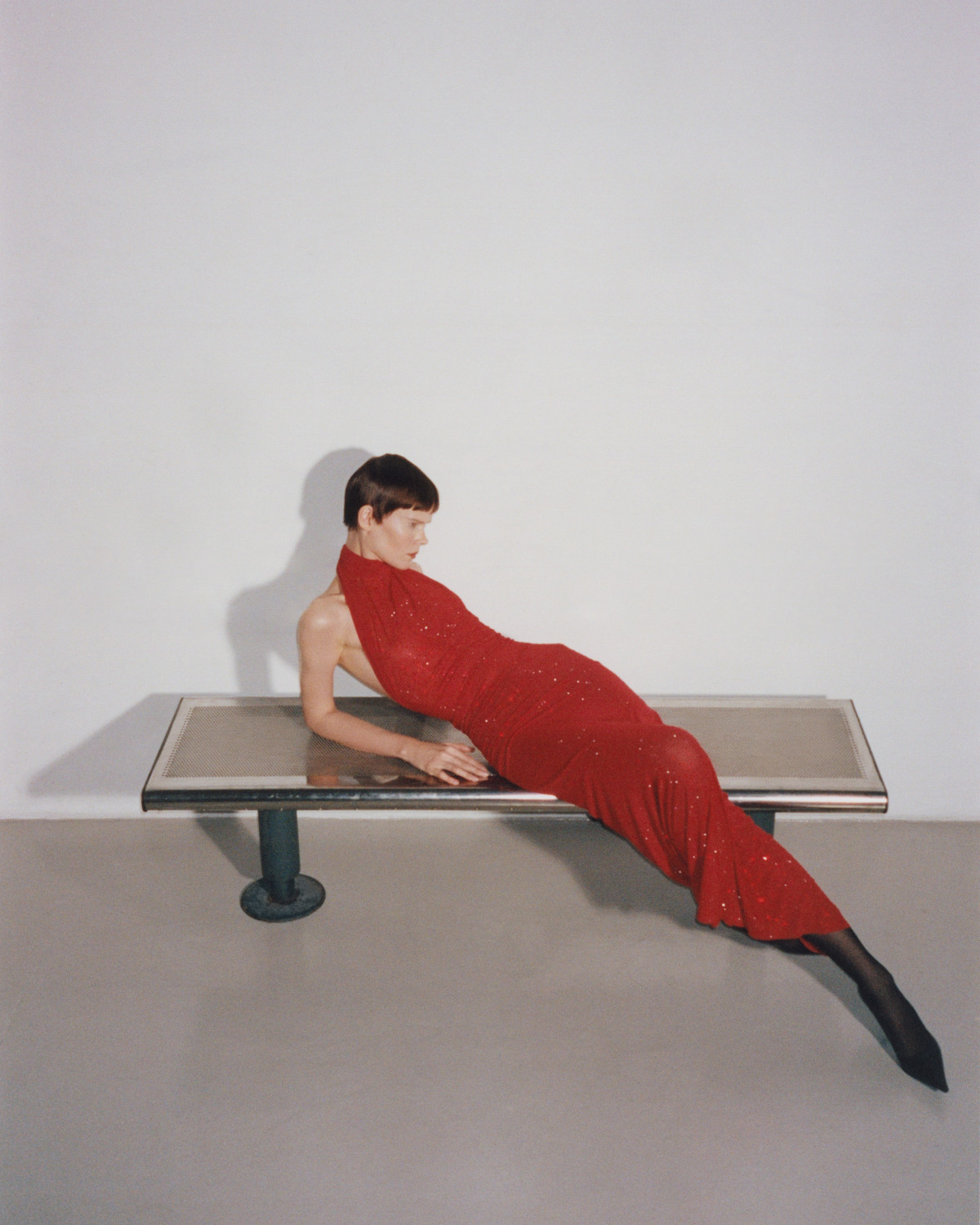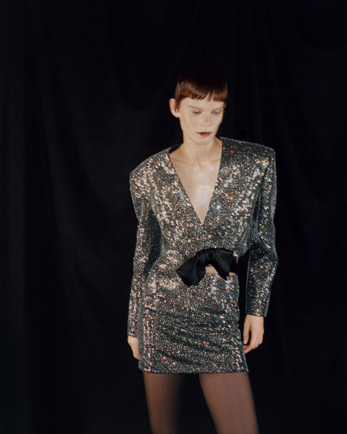 Лінійка включає сукні на всі випадки святкового сезону: чорно-білі міді з лаконічним верхом і сяйливим низом, які елегантно доповнюються високими рукавичками з бантами. Поціновувачам акцентних образів до вподоби буде ефектна червона сукня з відкритою спиною, що є уособленням спокуси й грації. А мінісукні з кристалами, що нагадують чи то всипане зорями небо, чи то новорічну ялинкову прикрасу, однозначно зададуть відповідного настрою.