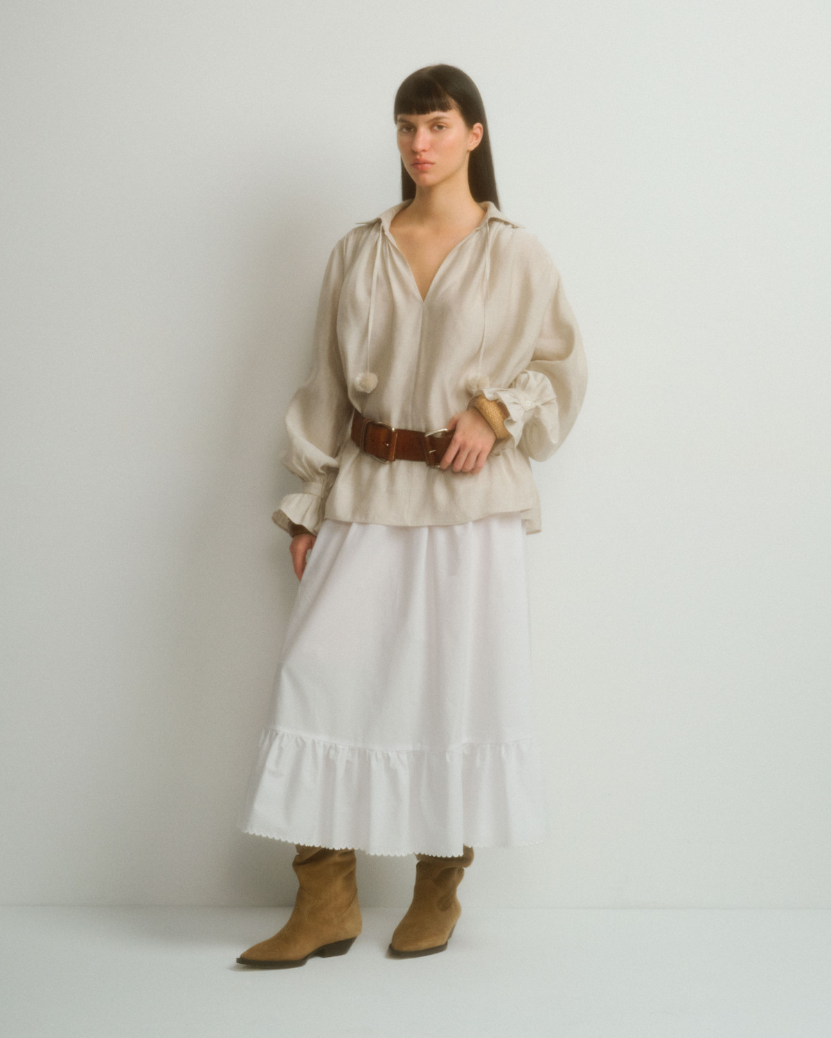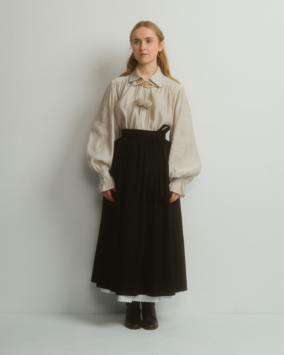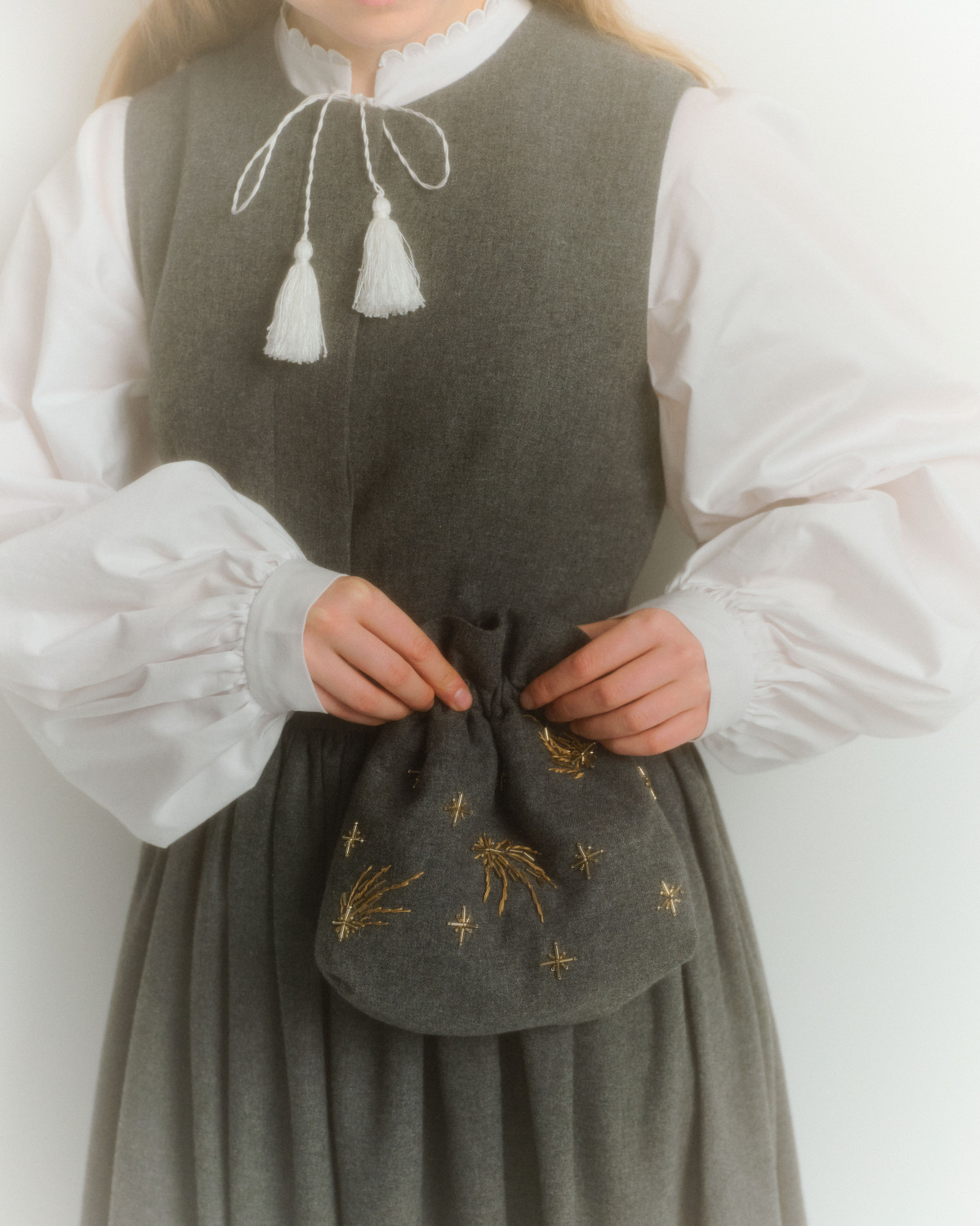 Кожен айтем здатний перевтілюватися зі святкового в буденний: конопляні та бавовняні сорочки, оздоблені манжетами й вишивкою, можна поєднати з шерстяною спідницею — створений образ пасуватиме як робочому дню, так і сімейному святкуванню. Фланелевий сарафан та мідісукні з кишенями складають чудовий тандем із шерстяною жилеткою та двобортним пальтом з помпонами. Як акцентний аксесуар JUL пропонує оздоблену вручну сумку-мішечок.