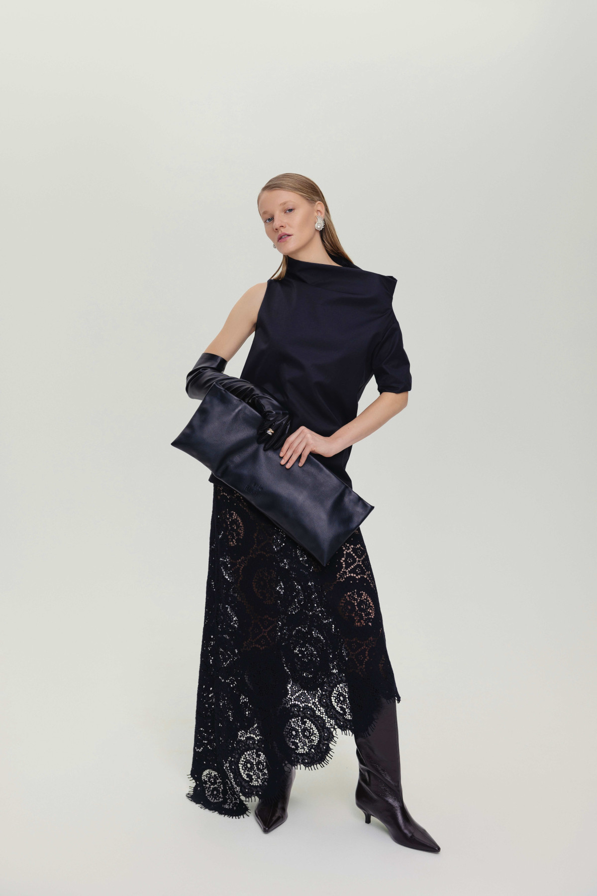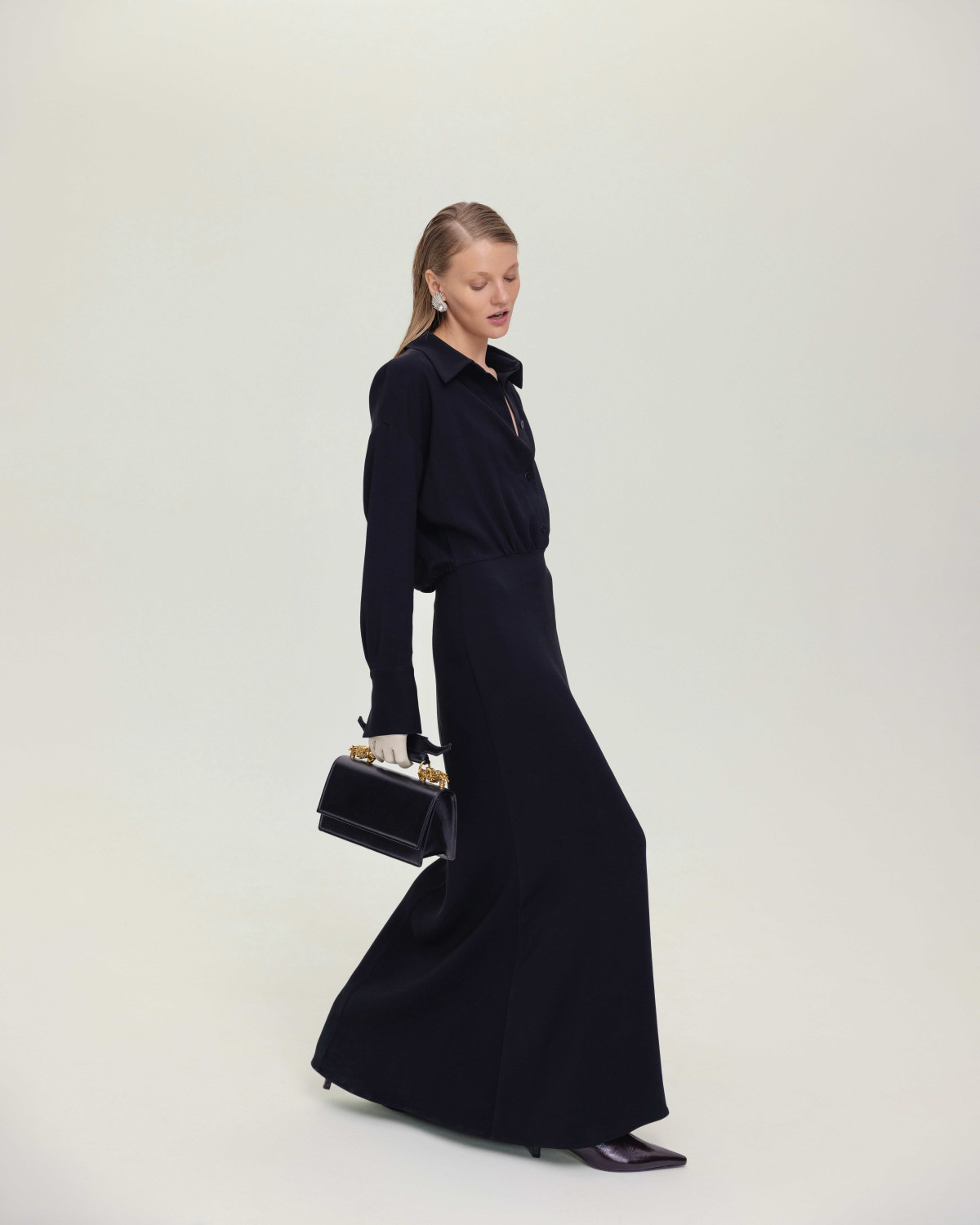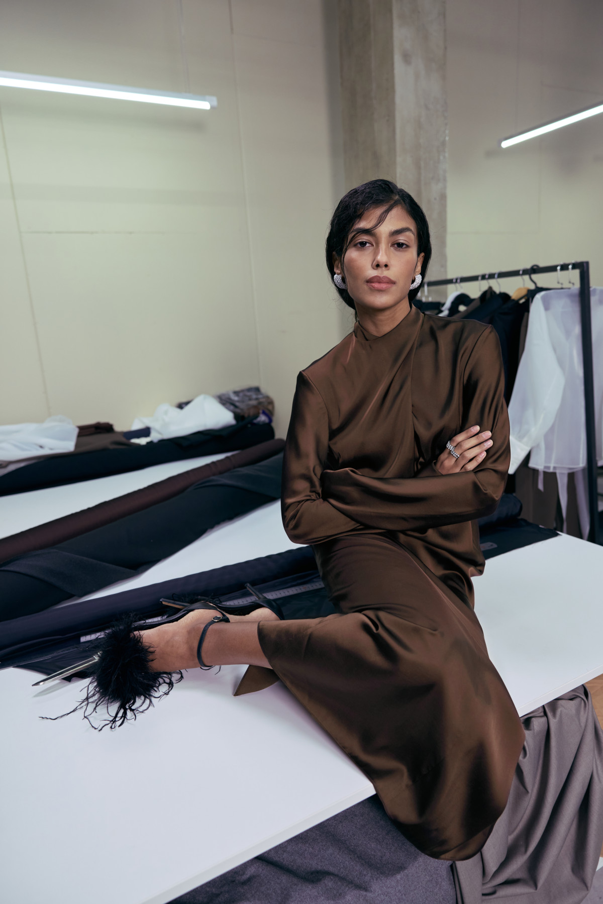 Святкова колекція бренду — ода блиску та розкоші епохи 80-90-х років. Натхненна ретро-гламуром, вона об’єднує сміливі силуети, динамічні тканини та витончені деталі. Головний акцент — речі з трендовим зміїним принтом. Приталену максісукню з високою горловиною та спідницю-футляр можна поєднати з подовженим чорним топом із відкритою спинкою. За епоху 90-х в колекції відповідають більш мінімалістичні універсальні образи. Червоний костюм із жакетом і шортами підкреслює витонченість і стиль, тоді як коричневий з прямими штанами легко адаптується до ділового чи casual-стилю. Окремої уваги заслуговують летючі блузи з асиметричним кроєм, які можна стилізувати з контрастним низом — чорними або білими прямими штанами. Доповнюють колекцію універсальні сукня-футляр із розрізом на правій нозі та чорна корсетна сукня міні та максі довжини, що додає образу виразної драматичності.