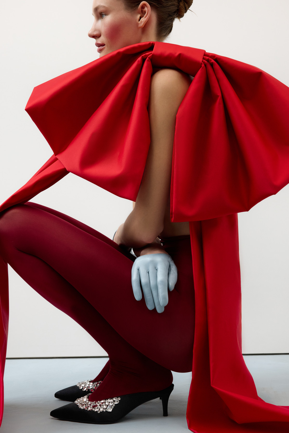 В основі Holiday Edit лежить інноваційна гра матеріалів та форм. J`amemme переосмислює вечірній одяг, наповнюючи класичні силуети несподіваними текстурами. Шкіряні спідниці поєднані з блискучими топами з леліток, а драматичні максірукавички додають образу структури. Контрасти — ніжність і фактурність, матовість і глянсуватість — створюють образ, одночасно грайливий і витончений. Разом з тим, новий жакет додає до кампейну більш формальне святкове вбрання. Завдяки оверсайз лінії плечей і завуженій талії він створює акцент на силуеті, а в поєднанні з прозорою сорочкою — абсолютно нову інтерпретацію образу.