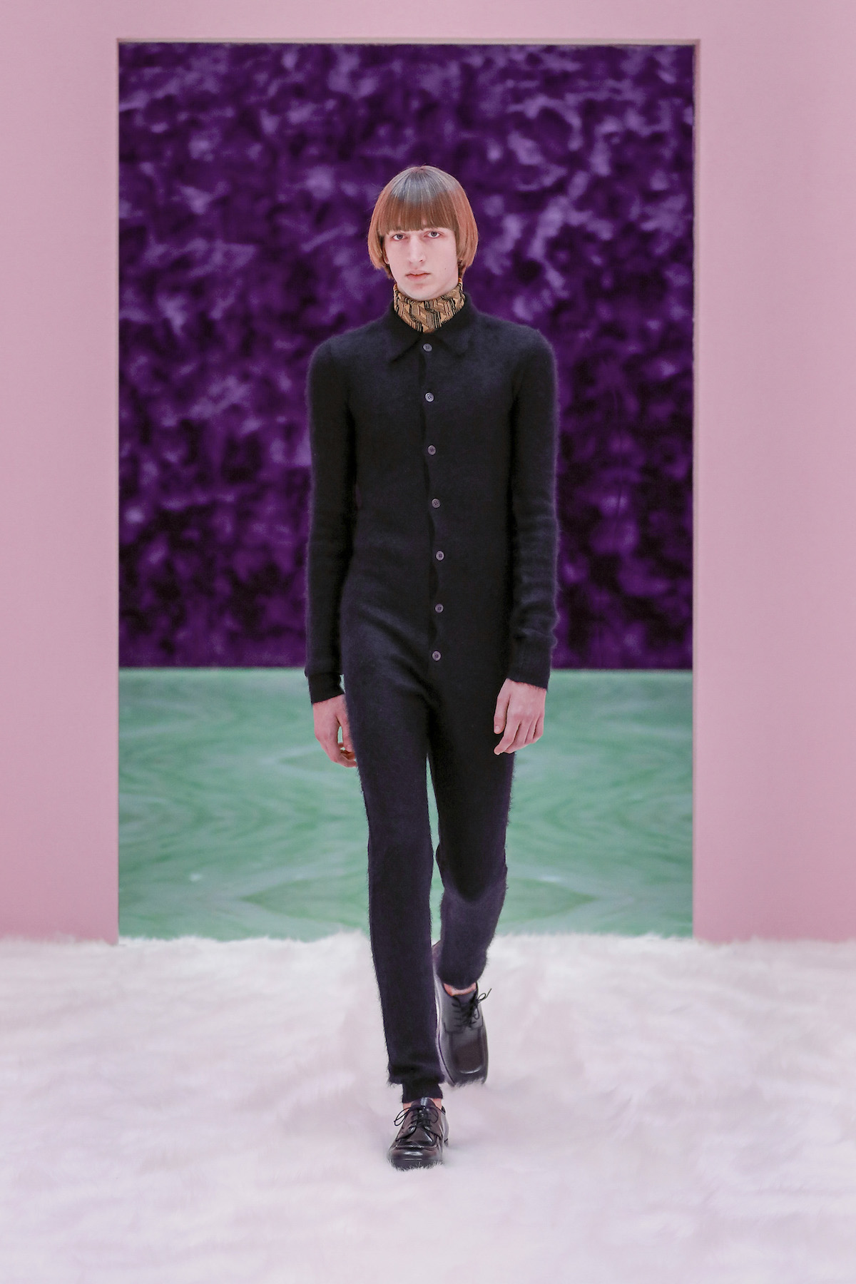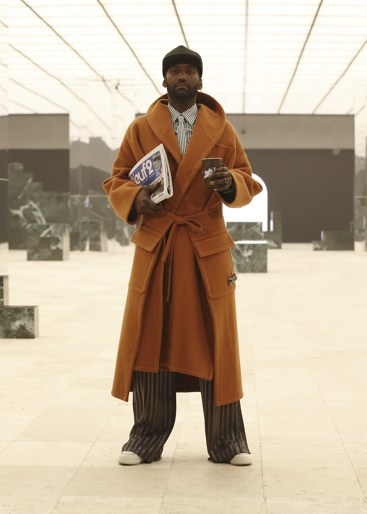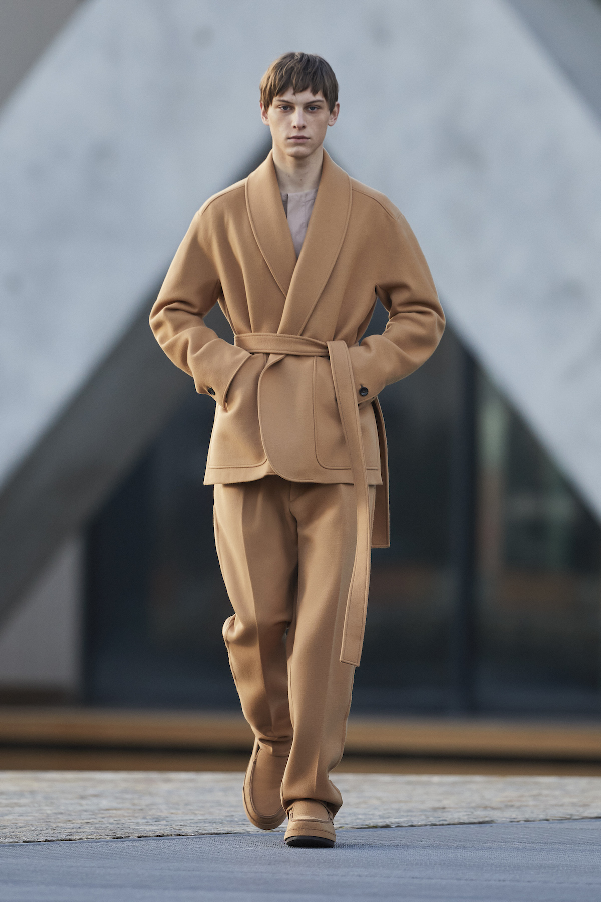 Тема домашнього одягу на вихід не вичерпує себе. Пальто-халат - не новинка для чоловічих колекцій, але тепер айдентика халата максимально збережена: характерне забарвлення, окантовка і низька талія.