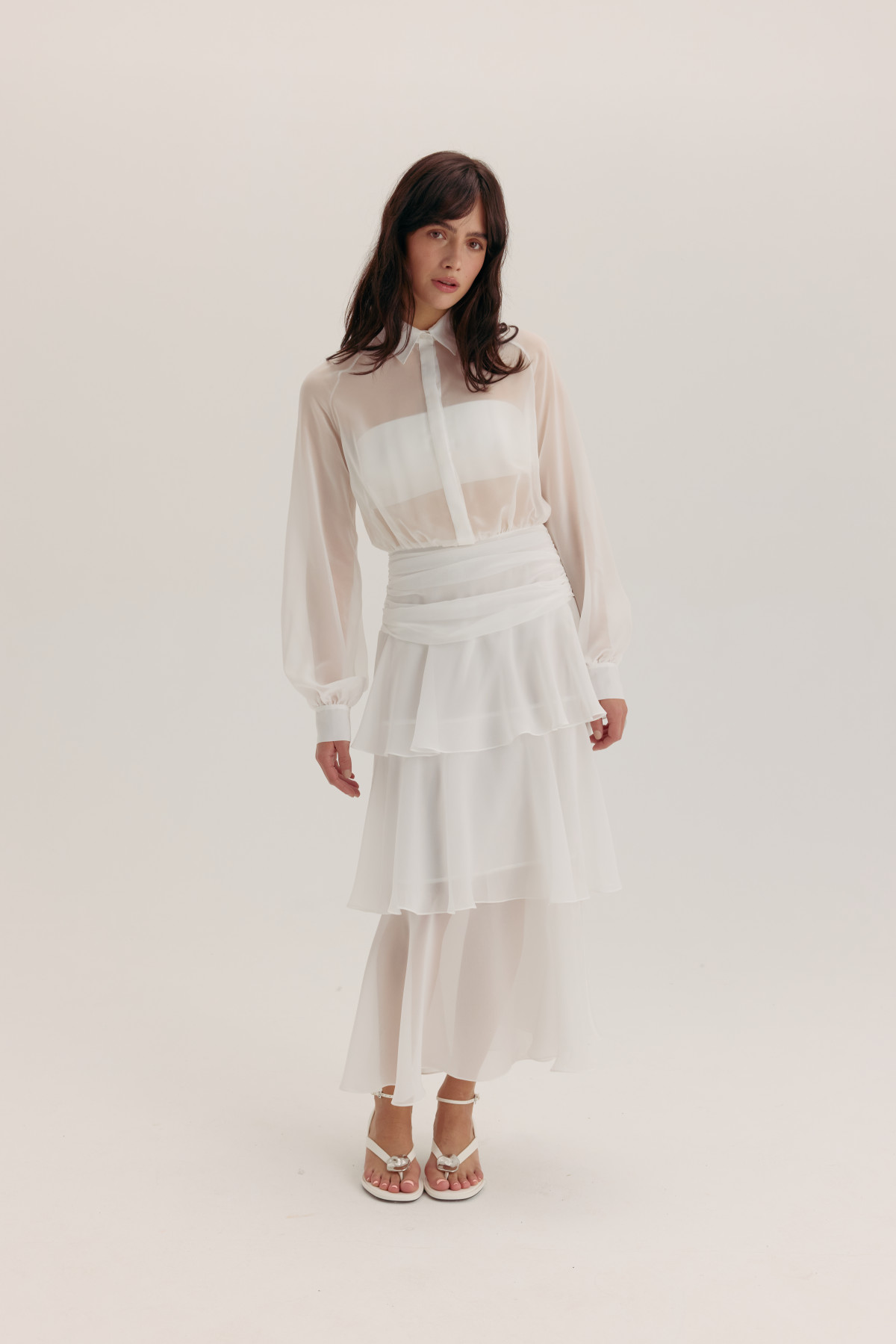Бренд занурює у відчуття легкості, навіяне бризом французької Рівʼєри, та створює капсулу 002: Le Murmure. Вона продовжує принцип конструктора, з яким Synopsis Collective дебютували восени 2024 року, — бренд представив 12 образів, які хоч і поділені на чотири блоки за кольоровою гамою та вибором тканин, гарно поєднуються як один з одним в різних варіаціях, так і з іншими предметами гардероба. Так, небесно-блакитне кімоно можна носити як сукню або разом із шортами-бермудами, а шовковий сет зі спідниці максі та топу на одне плече може бути готовим вечірнім комплектом чи частиною повсякденних, але елегантних образів. Кожна нова капсула логічно продовжує попередню і містить айтеми, які перевипускаються в актуальній варіації. Так, спідниця PHANTOM із чорної цупкої органзи з дебютної колекції предстає в новому вигляді — напівпрозорої білої спідниці міді, яка ідеально поєднується з розслабленими літніми образами. Так само вже класичний для бренду костюм-трійка в новій капсулі — білий і легкий, з брюками палаццо.