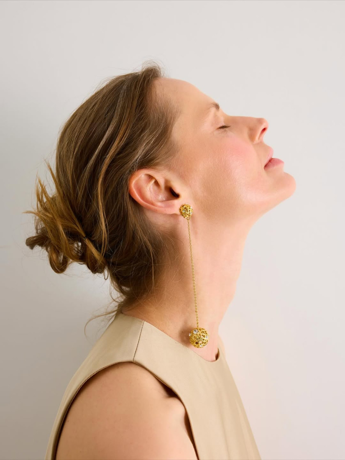 У центрі уваги — хупи, кільця та кулі. Лаконічні або масивні, гладкі або з інкрустацією — вони залишаються універсальним вибором для будь-якого формату святкування. Такі сережки легко поєднуються як із класичними вечірніми образами, так і з більш розслабленими, домашніми сетами.