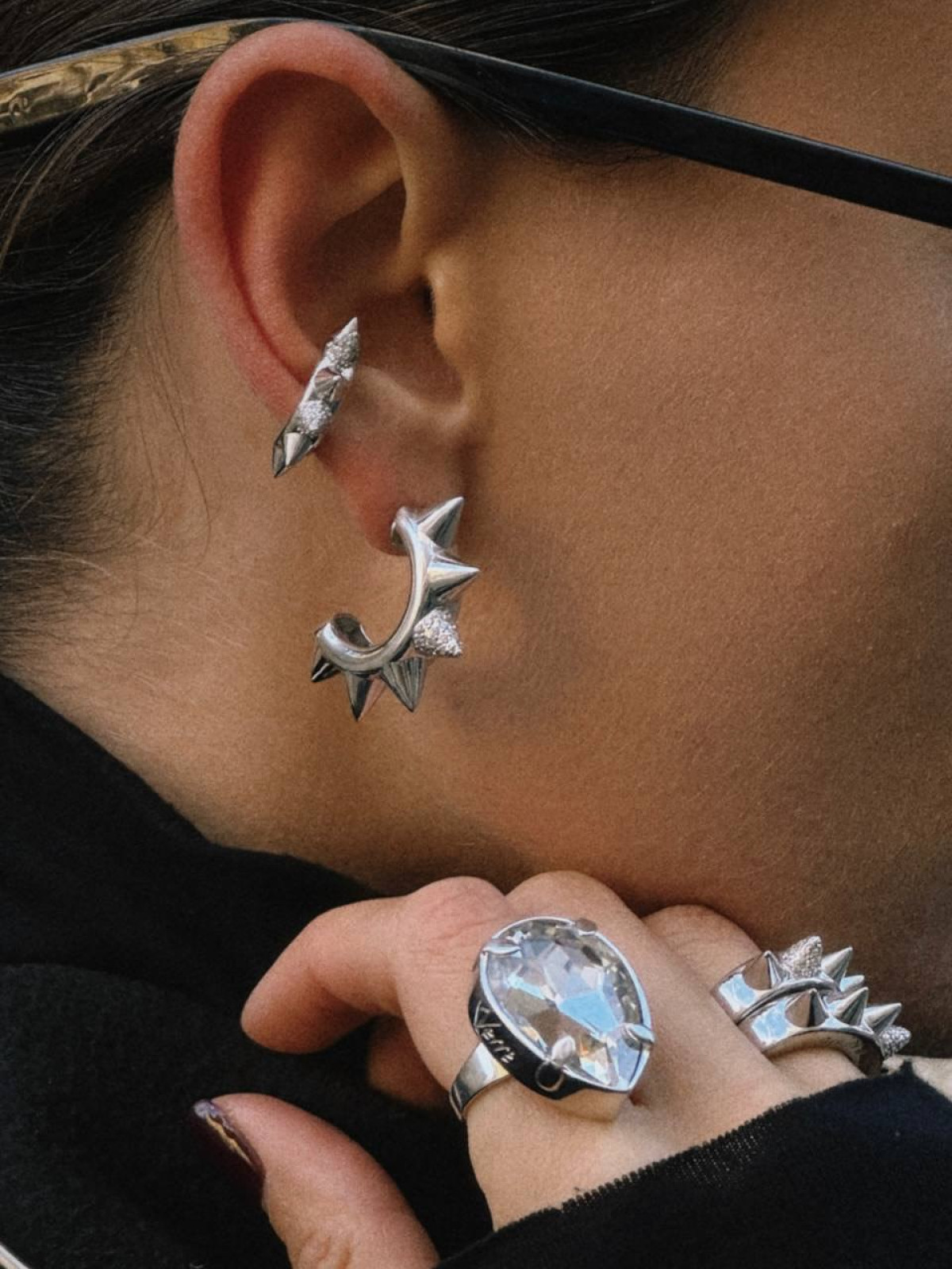 Новий рік — не лише про глянець. Шипи, гострі форми, металеві акценти залишаються актуальними для тих, хто віддає перевагу зухвалішій естетиці. Вони особливо ефектно працюють у контрасті з жіночними тканинами або мінімалістичним одягом.