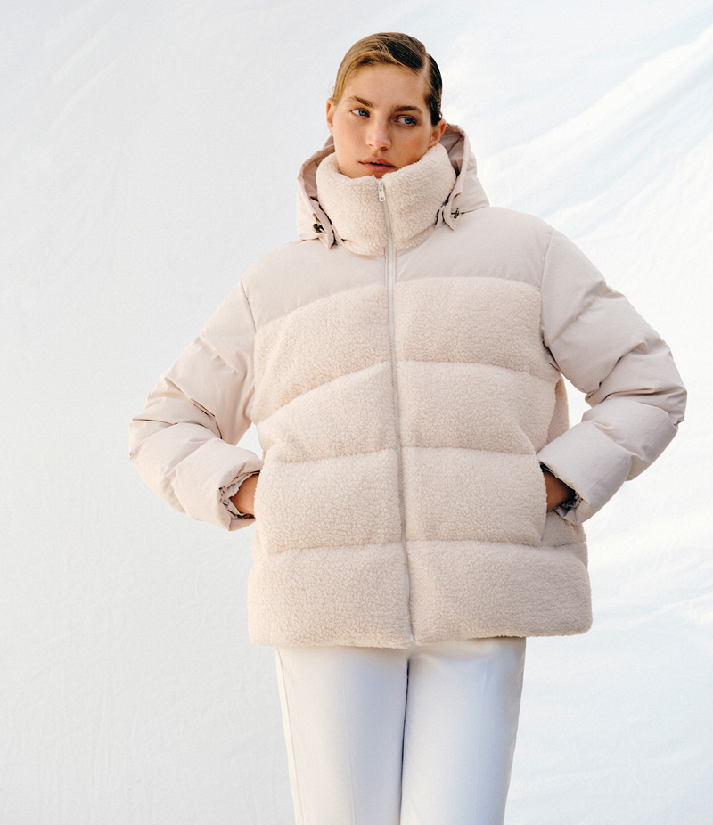 Якщо колекцію курток з нейлону за останні роки ви вже сформували, радимо в новому сезоні придивитися до більш незвичних текстур. Надлегкі моделі, покриті водовідштовхувальним штучним хутром, представлені в лінійці Marchi. Блакитні та молочні пуховики, натхнені чистим і погожим небом, розбавлять чорно-сіро-коричневий зимовий гардероб.