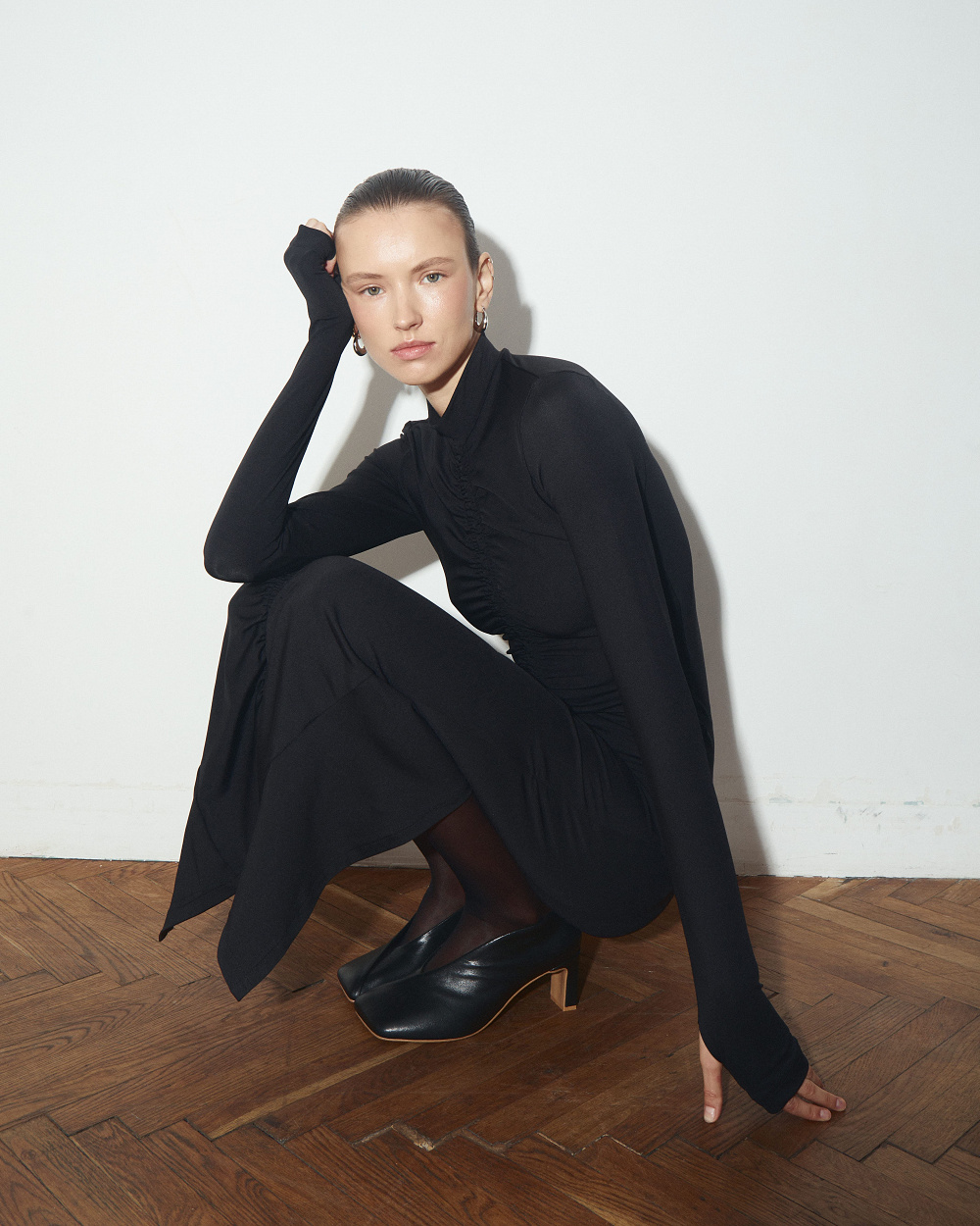 BALYKINA спеціалізується на коктейльному вбранні — у новому дропі додає сяйливі паєтки та доповнює колірну палітру фісташковим та пудрово-рожевим відтінками. Вечірня колекція українського бренду складається з мінімалістичних, проте драматичних суконь скульптурного крою, корсетів у поєднанні із мікрошортами, суконь із квітковим та металевим декором, нових варіацій шлейфів та суконь-трансформерів.