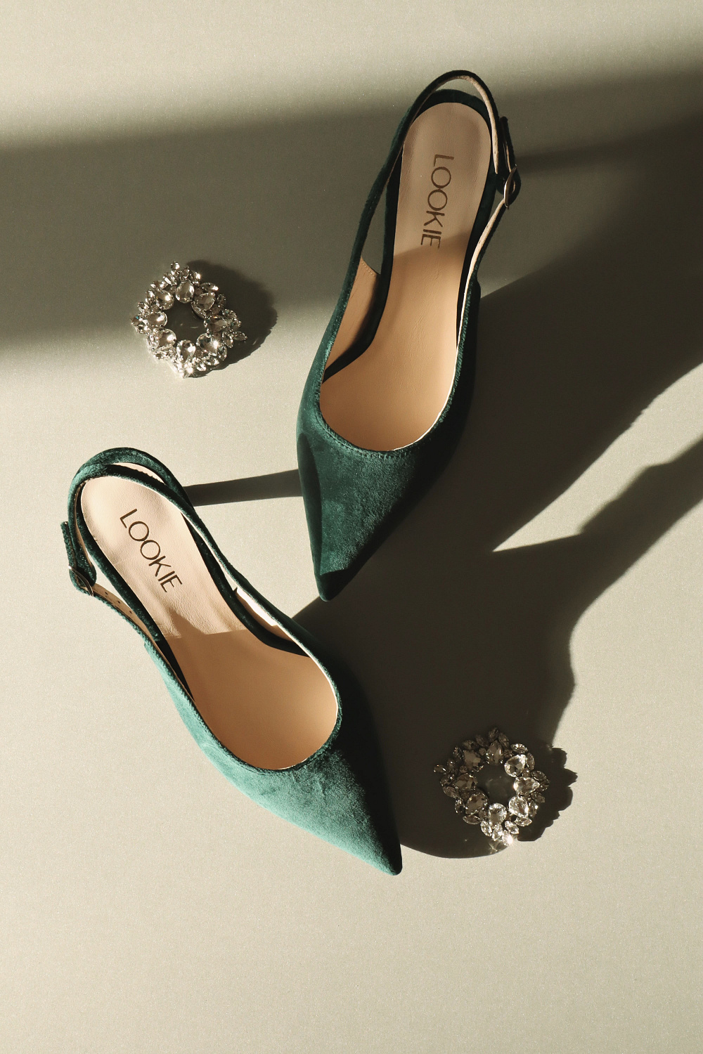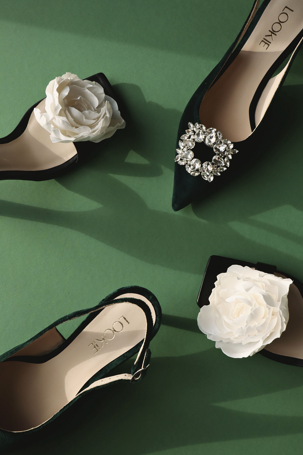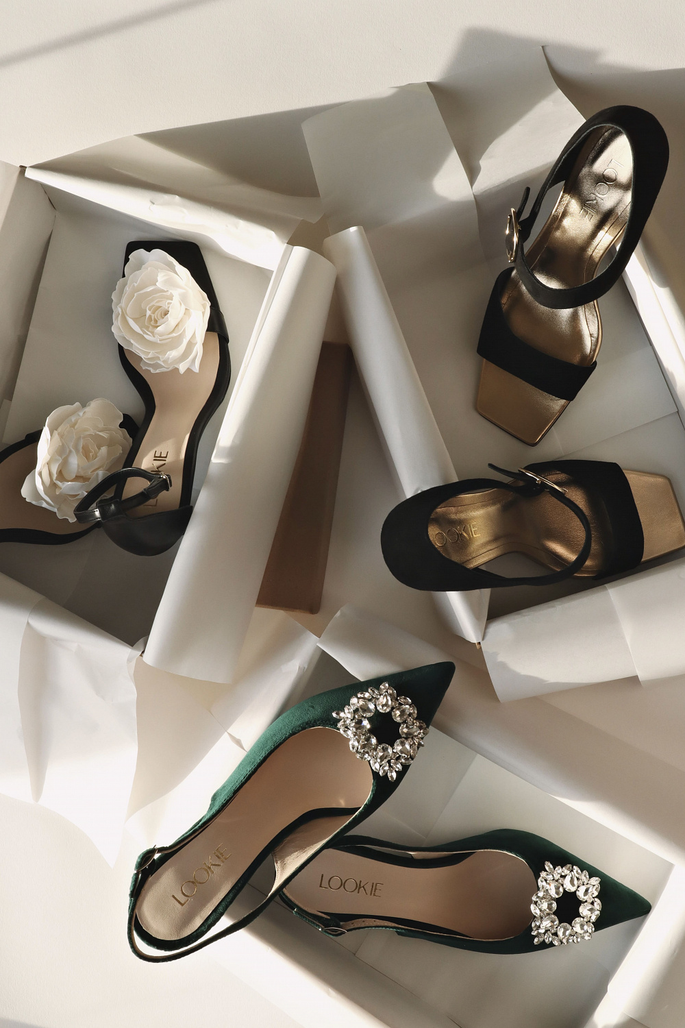 Святковий сезон бренд LOOKIE Atelier пропонує провести в одній з трьох пар взуття: слінгбеках у смарагдовому оксамиті чи босоніжках з чорної замші або натуральної шкіри. Туфлі доповнюють знімні аксесуари у вигляді блискучих брошок. Бренд виготовляє взуття вручну з урахуванням індивідуальних мірок замовниць.