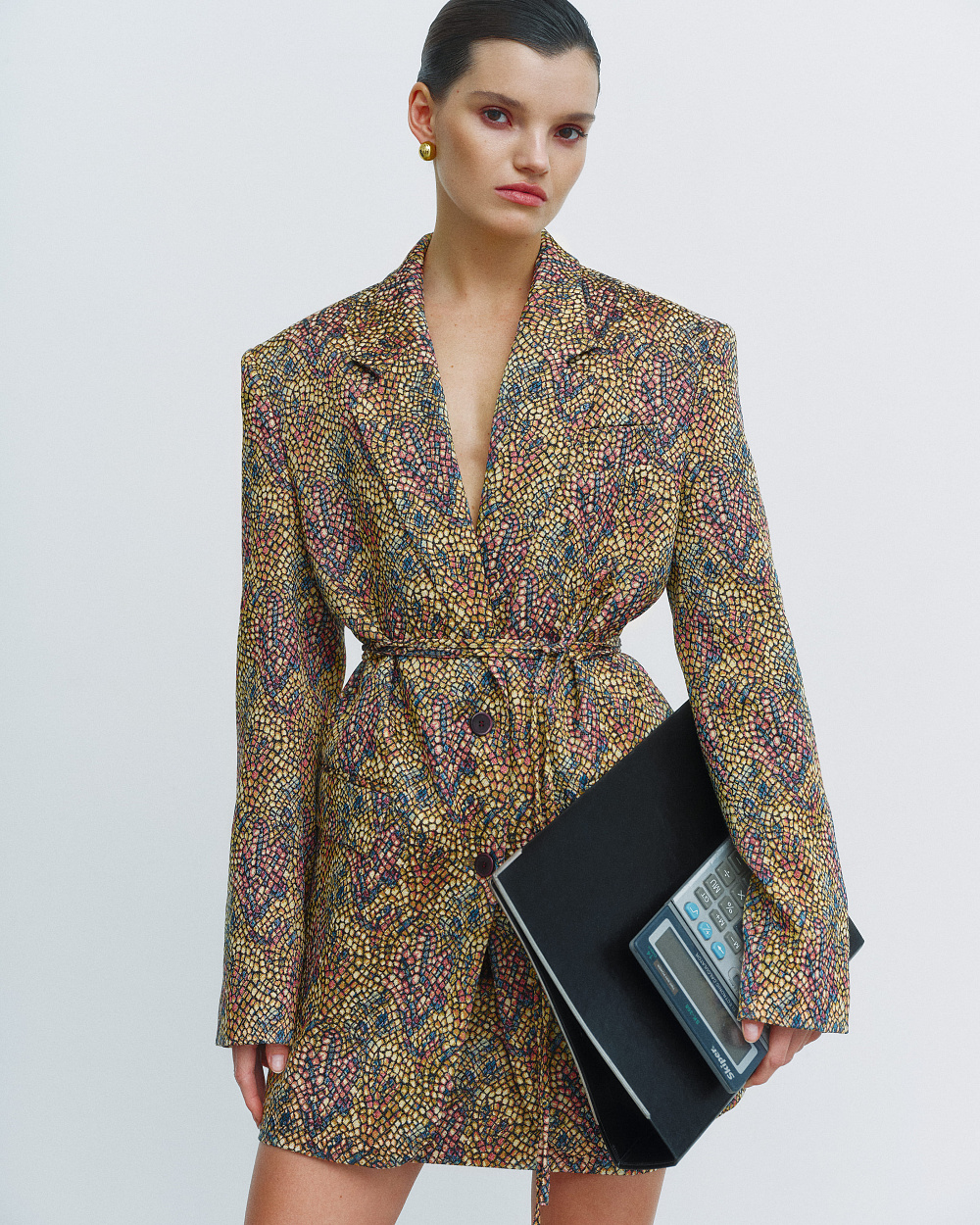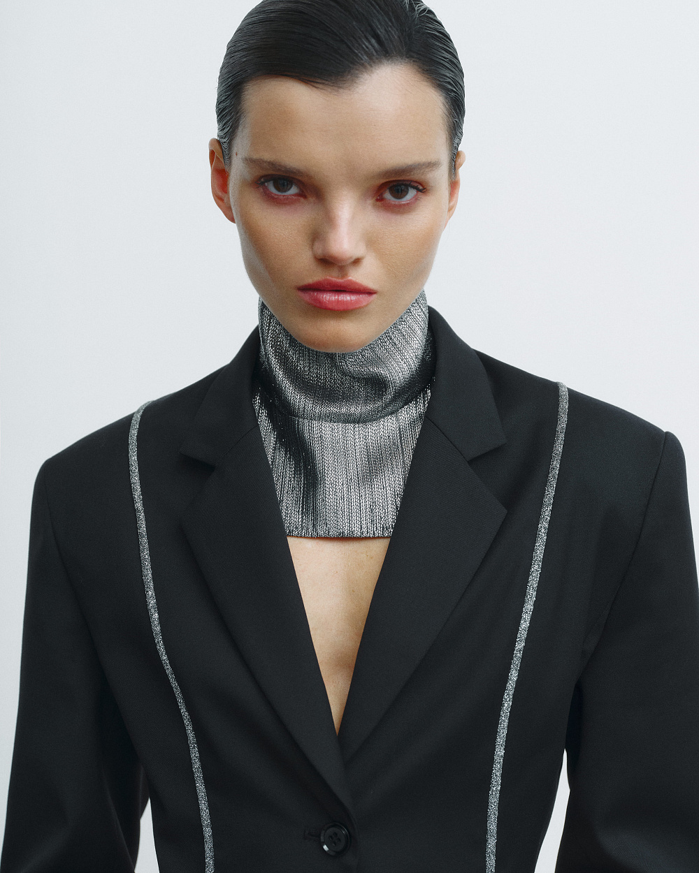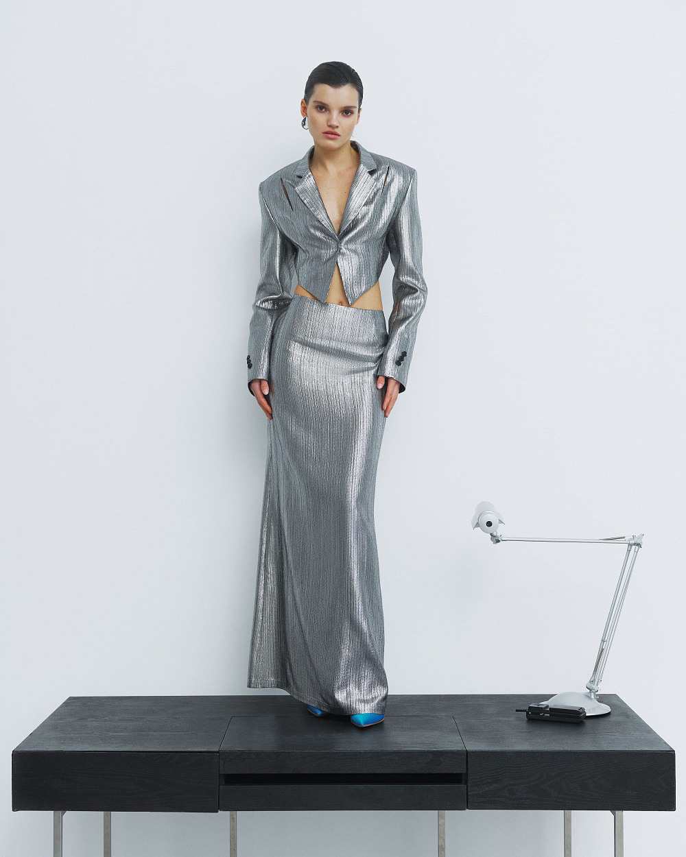 Візитівка L’eskizzo — ідеально скроєні костюми — у новій колекції з’являються зі святковим відтінком. Так, знаковий комплект із мініспідницею та поясом тепер доступний у веселковому візерунку зміїної шкіри. Основний акцент колекції — металік. Можливо, окремо блискучий блейзер і максіспідниця можуть слугувати елементами звичайного повсякденного аутфіту, але разом вони створюють повноцінний вечірній ансамбль. Не обійшлася капсула і без більш консервативних і стриманих моделей. Однак хто сказав, що костюм у темних тонах чи пальто-сукня не варіант для вечірки?