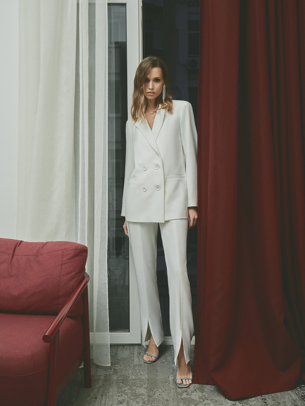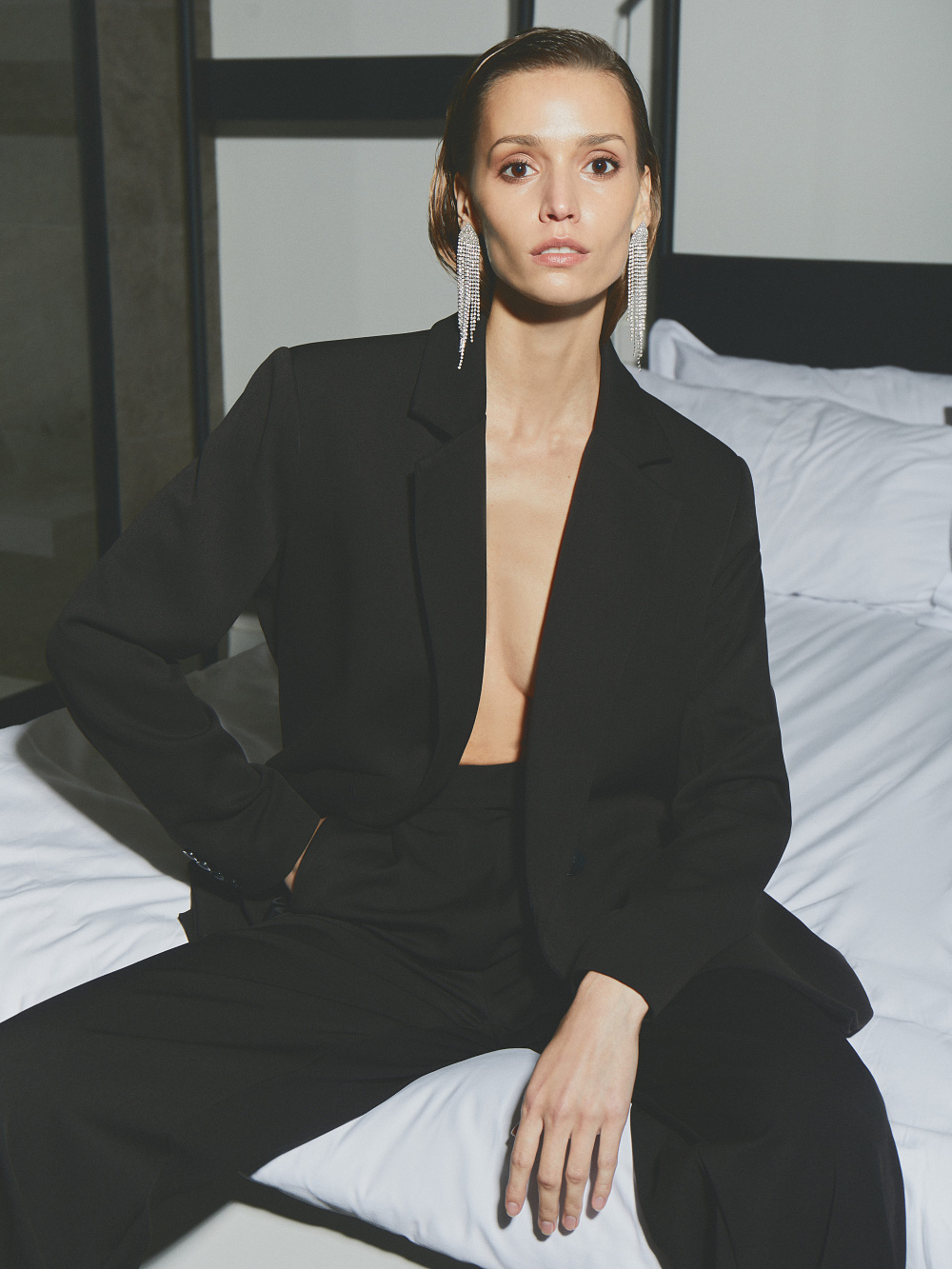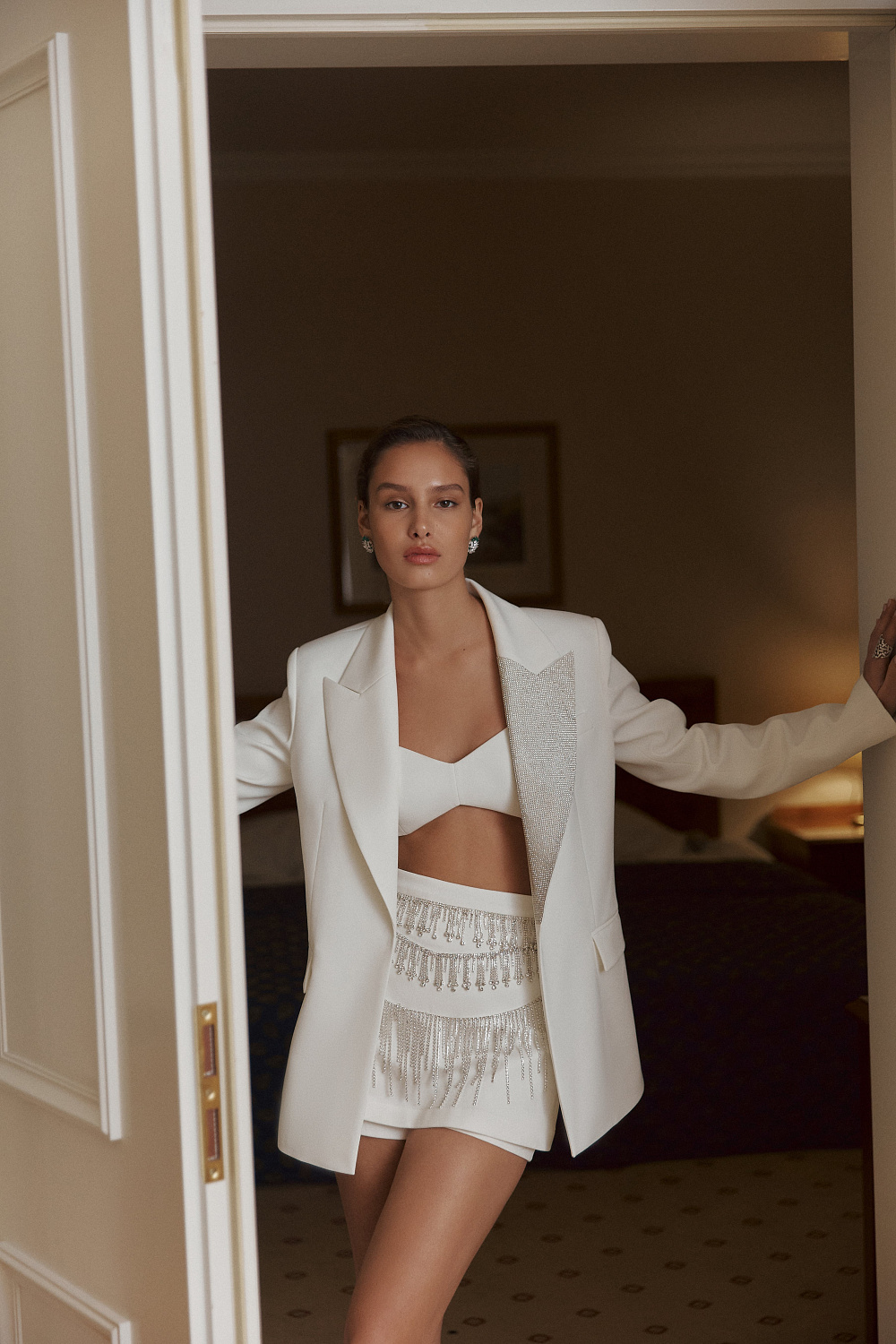 Візитівка L’eskizzo — ідеально скроєні костюми — у новій колекції з’являються зі святковим відтінком. Так, знаковий комплект із мініспідницею та поясом тепер доступний у веселковому візерунку зміїної шкіри. Основний акцент колекції — металік. Можливо, окремо блискучий блейзер і максіспідниця можуть слугувати елементами звичайного повсякденного аутфіту, але разом вони створюють повноцінний вечірній ансамбль. Не обійшлася капсула і без більш консервативних і стриманих моделей. Однак хто сказав, що костюм у темних тонах чи пальто-сукня не варіант для вечірки?