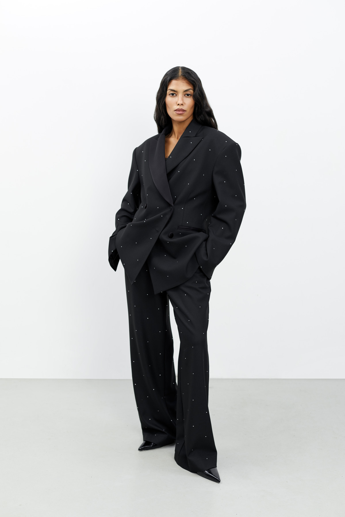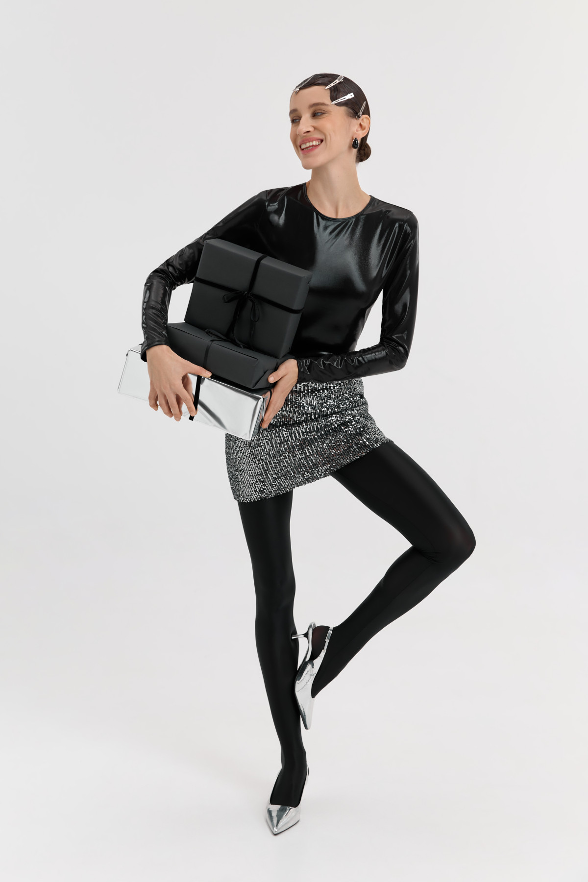 Колекція створена на різних типах блиску й фактур: сукні та топи з акцентом на форму, штани й спідниці зі святковими поверхнями, оверсайз жакети та верхні елементи, що додають образу об’єму. Усі ці речі легко комбінуються між собою й не здаються надмірно «святковими» поза новорічною ніччю — що важливо в контексті сучасного гардероба.
