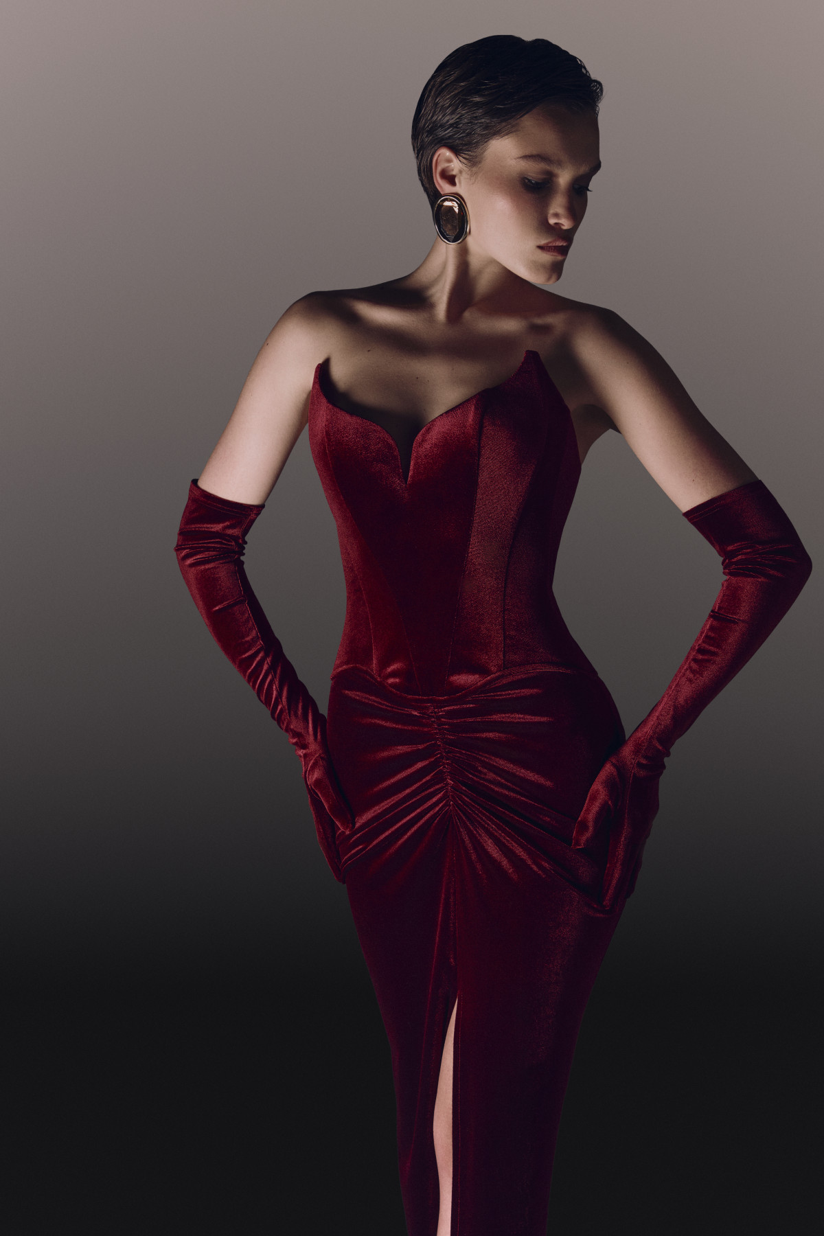 У центрі колекції — оксамит у його найбільш чуттєвих і драматичних проявах. Чорне бюстьє з архітектурною посадкою, корсет, натхнений формою антуріуму, та об’ємна бальна сукня з червоного оксамиту вибудовують гардероб новорічної ночі як послідовну історію: від стриманої елегантності до максимальної театральності. Це речі, які промовляють самі за себе — вони працюють через фактуру, колір і силует.
