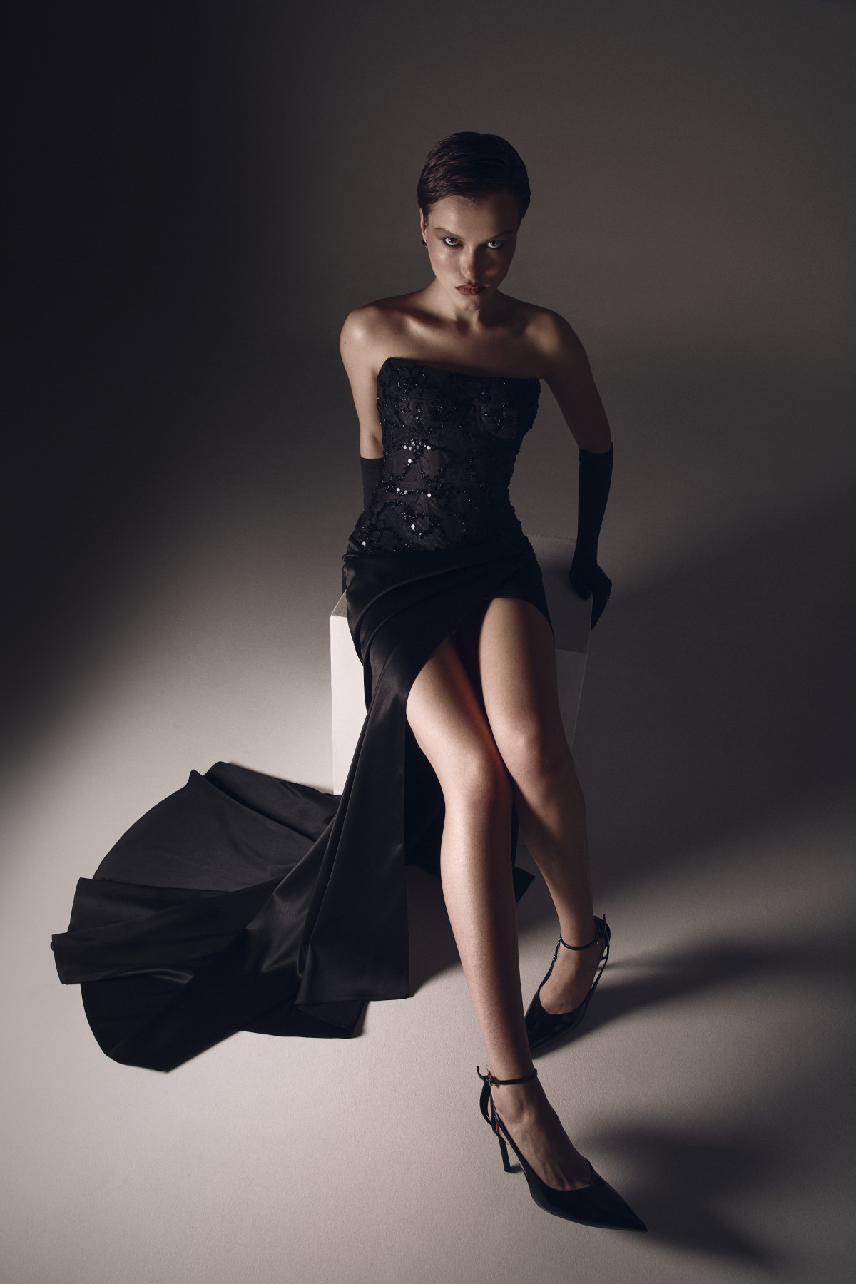 У цій колекції контрасти працюють не як протиставлення, а як гармонійний діалог. Чорний атлас, оксамит, мереживо та срібні акценти створюють святкову драматургію, доречну саме для новорічної ночі. Структурні корсети підкреслюють впевненість, прозорі фактури додають крихкості, а чисті лінії формують максимально спокусливий силует.