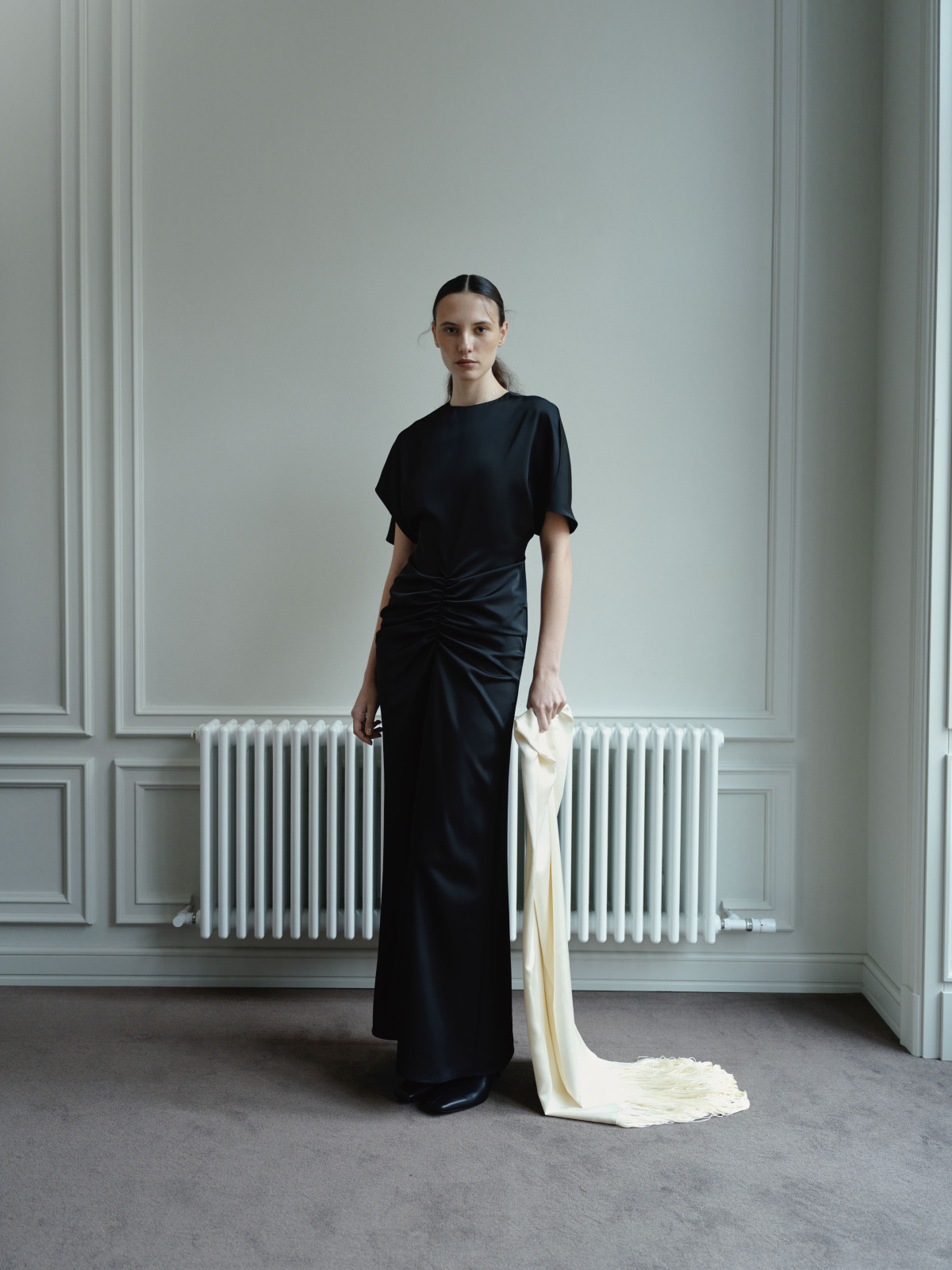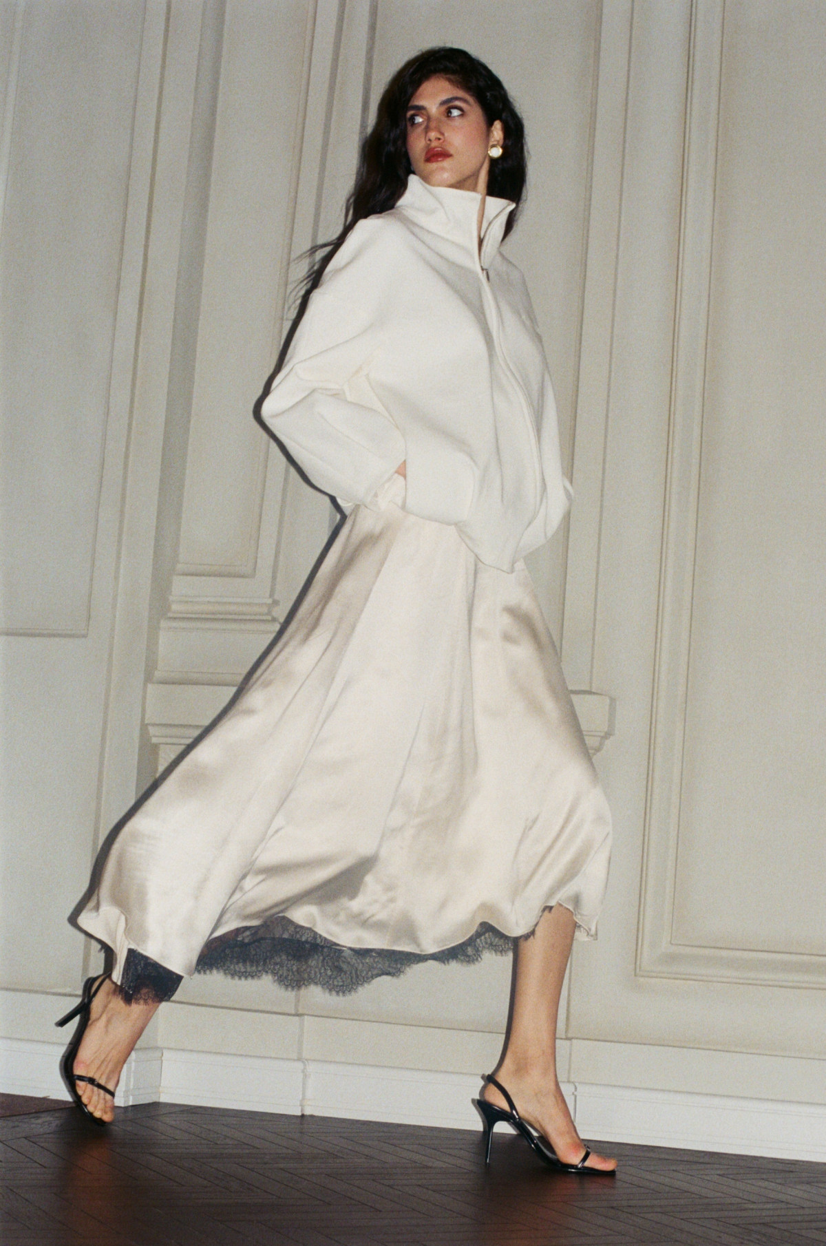 Окрему роль у дропі відіграють молочні й чорні сукні з чистими лініями, сатинові текстури та жакети, які можуть працювати як самостійний образ. У результаті колекція закриває різні настрої святкової ночі — від стриманого мінімалізму до більш сміливих вечірніх рішень — без прив’язки до одного дрес-коду.