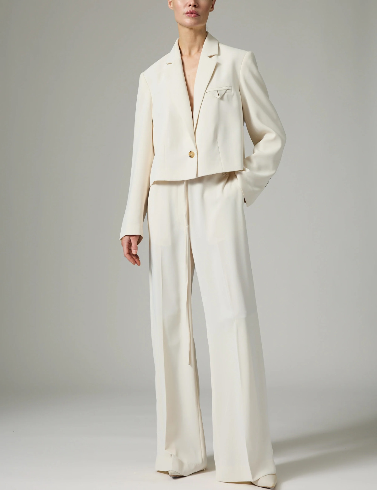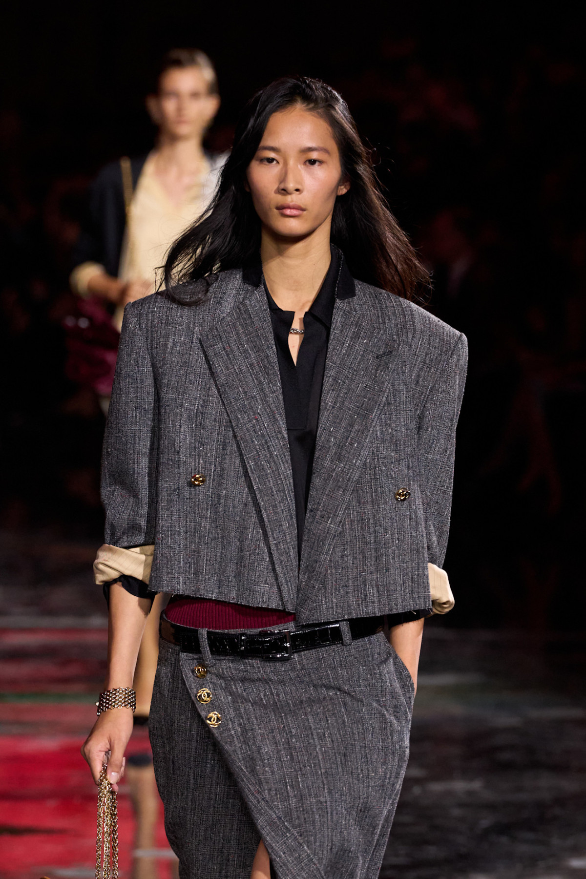 З чим Блазі пропонує носити цей жакет? З костюмними брюками з тієї ж тканини, що й жакет. При цьому брюки мають вільний крій, але не є надто широкими. Альтернатива — мідіспідниця з високим розрізом на стегні. В обох випадках талія у брюк і спідниць занижена, а дизайнер залишає тонку смужку нижнього шару одягу між верхом і низом образу, візуально поєднуючи її з манжетами.