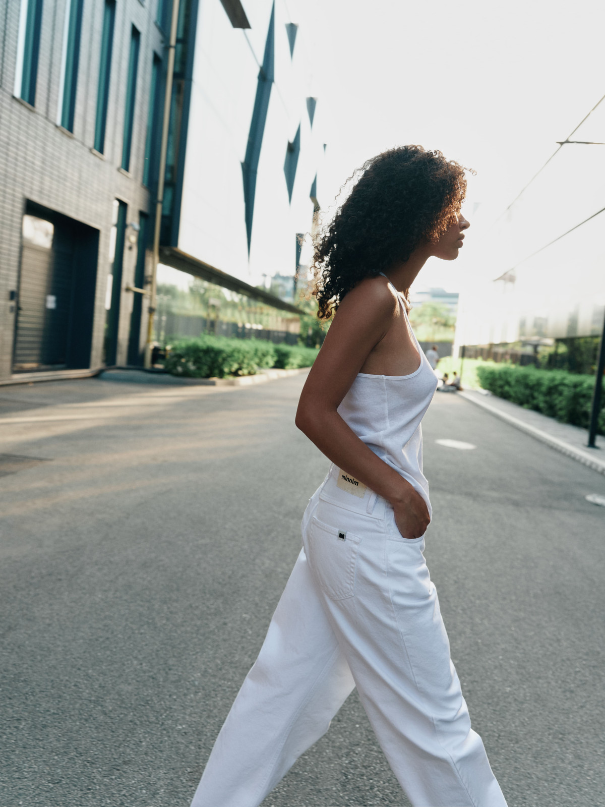 Широкі джинси влітку 2024 року — основа джинсового гардероба. Minnim запропонував свої моделі-бестселери в новому білому кольорі, зокрема мішкуваті джинси з низькою талією та палаццо з необробленим краєм штанин.