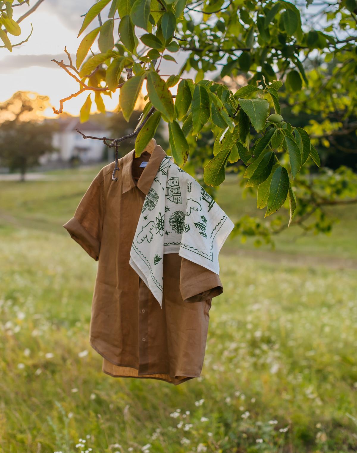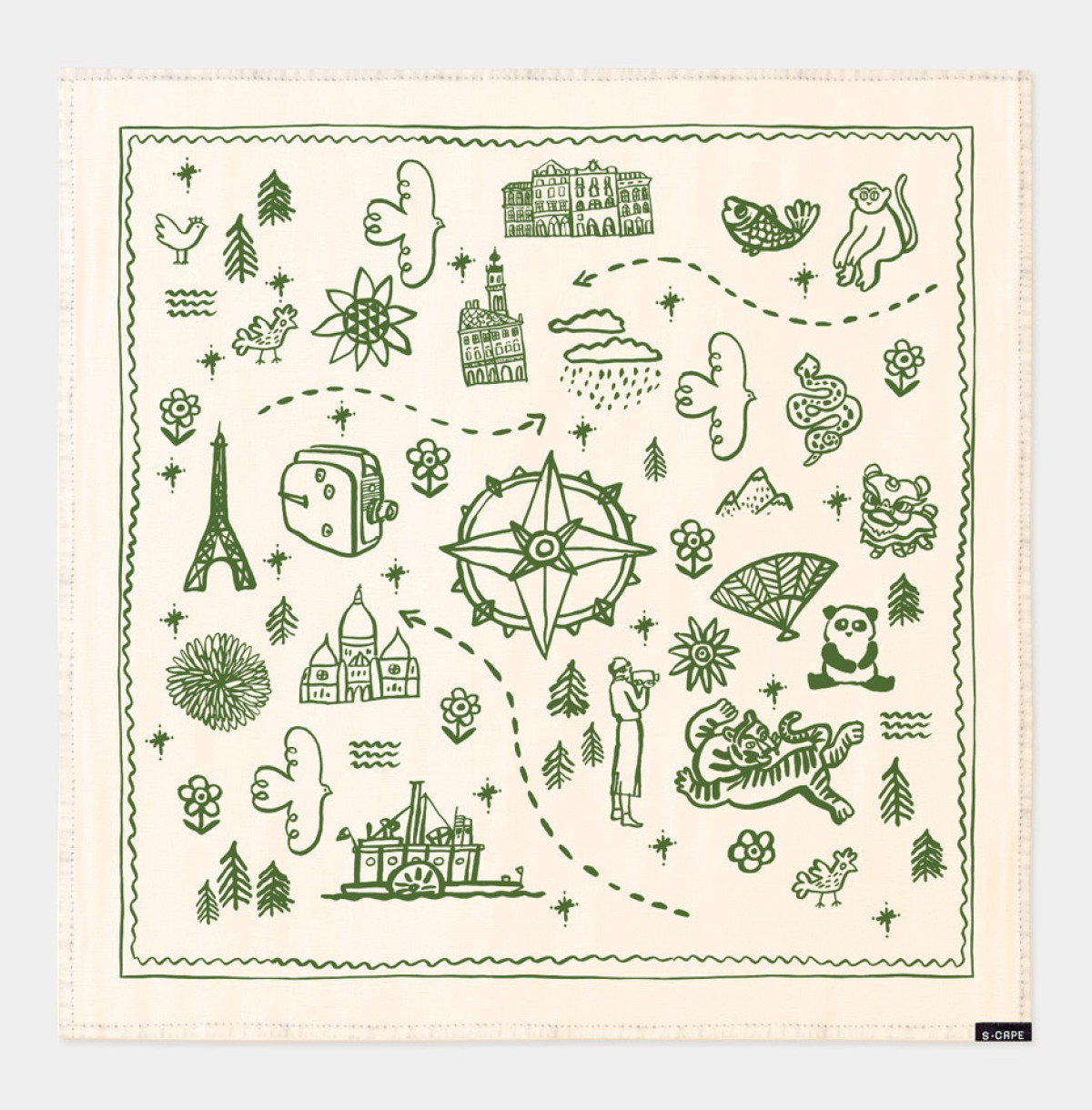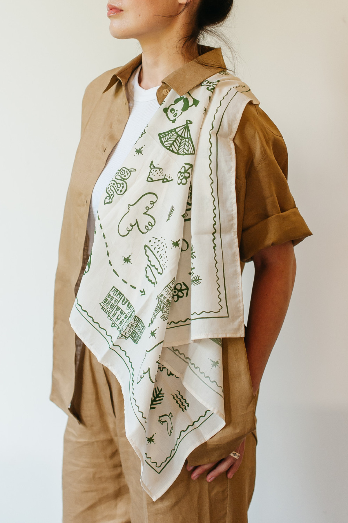 Це перша бандана в історії бренду. Для роботи над нею запросили талановиту ілюстраторку та графічну дизайнерку Марічку Рубан. Вона зуміла відтворити на аксесуарі дрібні деталі, де кожен символ — маленький ребус, який оповідає щось про долю Яблонської: її життя в Китаї, любов до знімання чи мандри екзотичними островами.