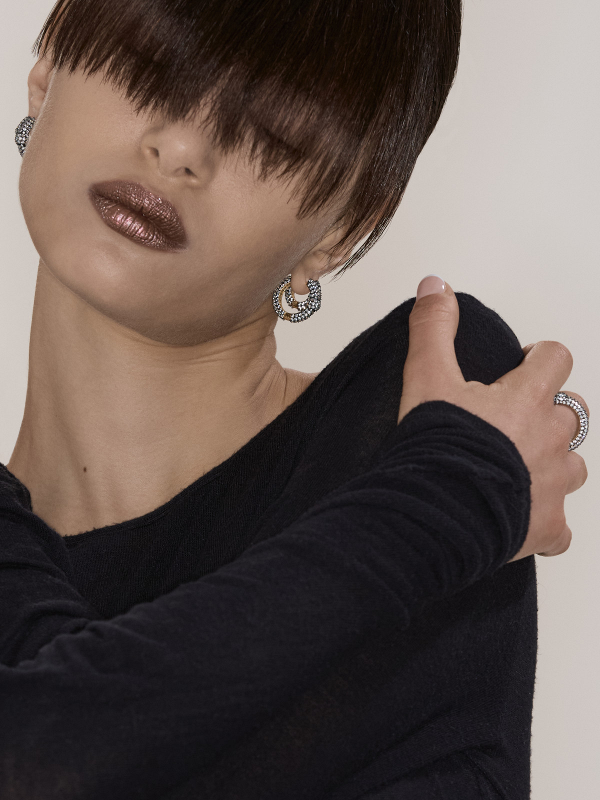 Вона завжди шукає баланс між внутрішнім спокоєм і зовнішньою свободою. Її образи — про легкість, з якою вона поєднує комфорт, природність і міську вишуканість. У новій лінійці кожен елемент гардероба говорить про невимушену впевненість і готовність досліджувати світ, залишаючись в гармонії із собою. Основний колір колекції — позачасовий чорний з додаванням срібних деталей. М`які лінії та вишуканий дизайн поєднані в кожному виробі: мініспідницях, лонгслівах, акцентних сукнях з вирізами та комбінезонах, на яких спеціалізується бренд.