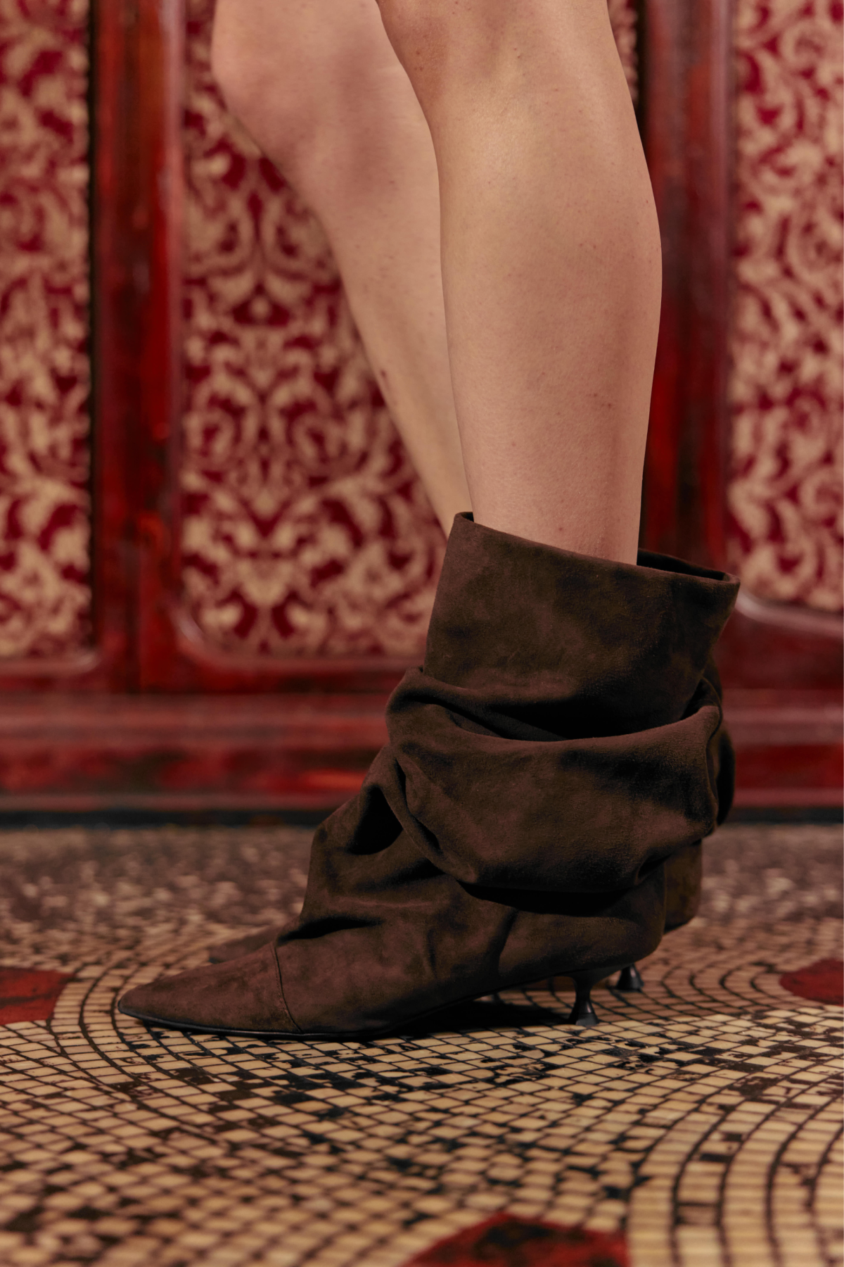 Високі ботильйони зі збіркою додають легкої недбалості та розслабленості, що вже стало візитною карткою стилізацій бренду. Низькі ботильйони з широким верхом створюють цікавий акцент. Натомість казаки чудово доповнюють гардероб на багато сезонів, адже на таких фактурах складно помітити подряпини та затертості, що подовжує життя улюбленої пари.