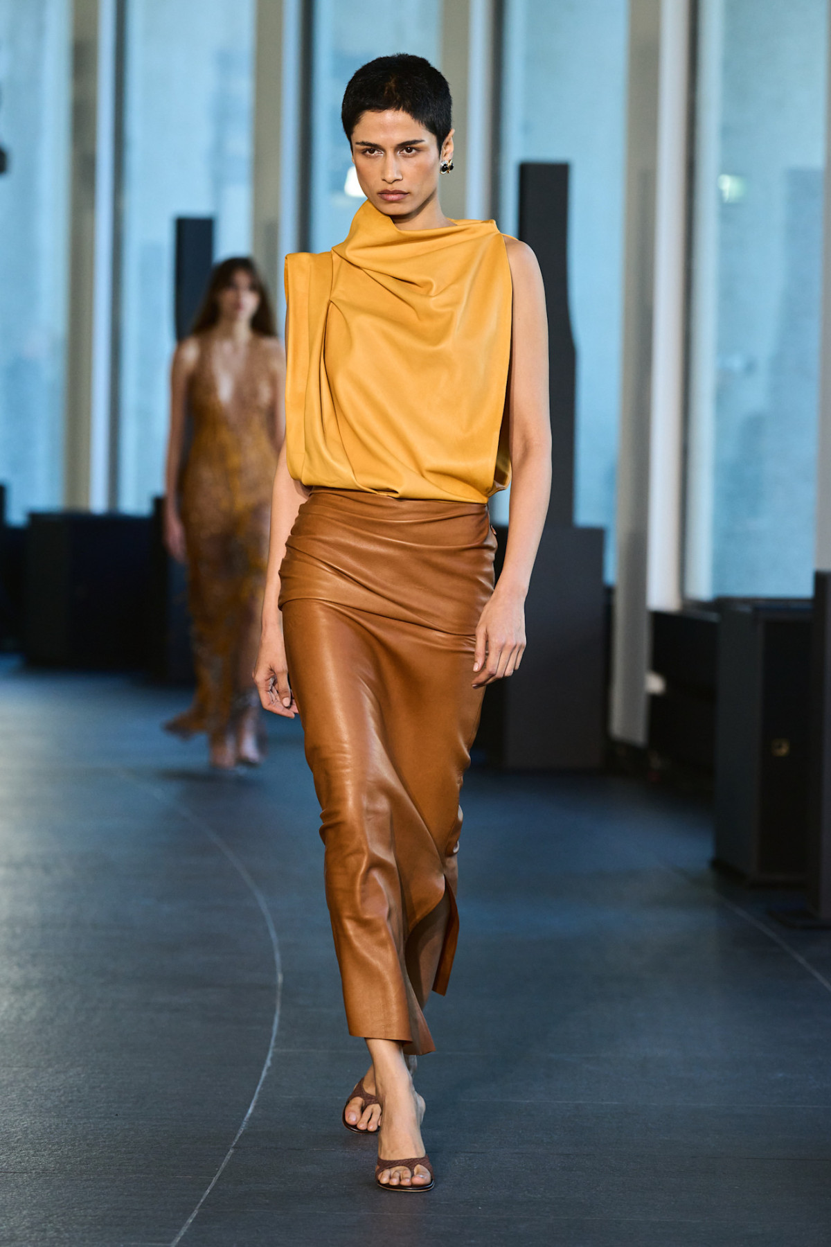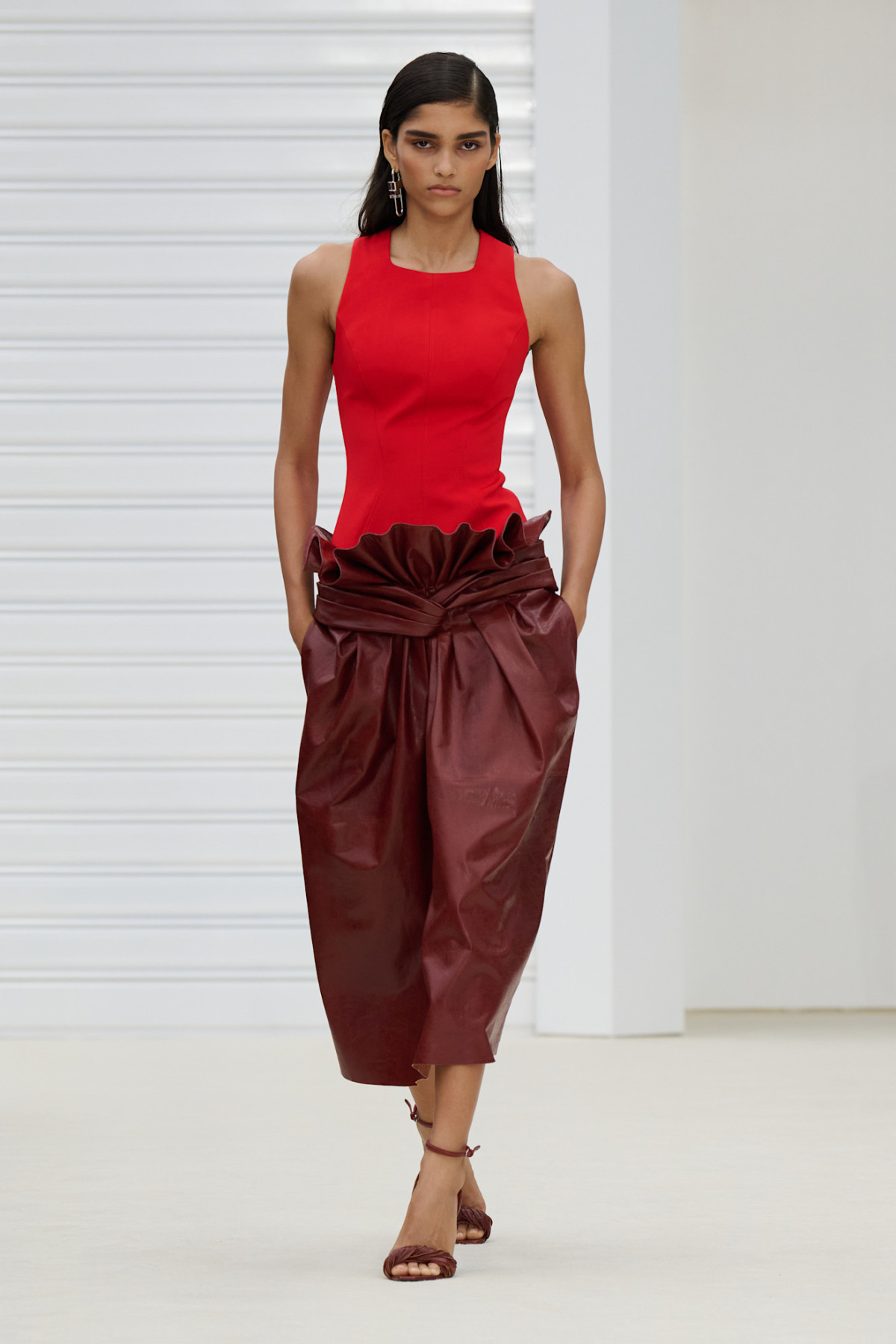 І останній прийом стилізації — найбільш складний, але дуже ефектний. Спробуйте поєднати шкіру зі шкірою в одному образі: додайте до спідниці шкіряний топ, блейзер або куртку в одній колірній гамі, але з трохи іншим відтінком або фактурою. Будьте уважні із силуетами, як в Iceberg, — є ризик виглядати занадто вінтажно, але «витягнути» образ можуть трендові деталі, наприклад туфлі з гострим носом або мюлі-в’єтнамки на танкетці.